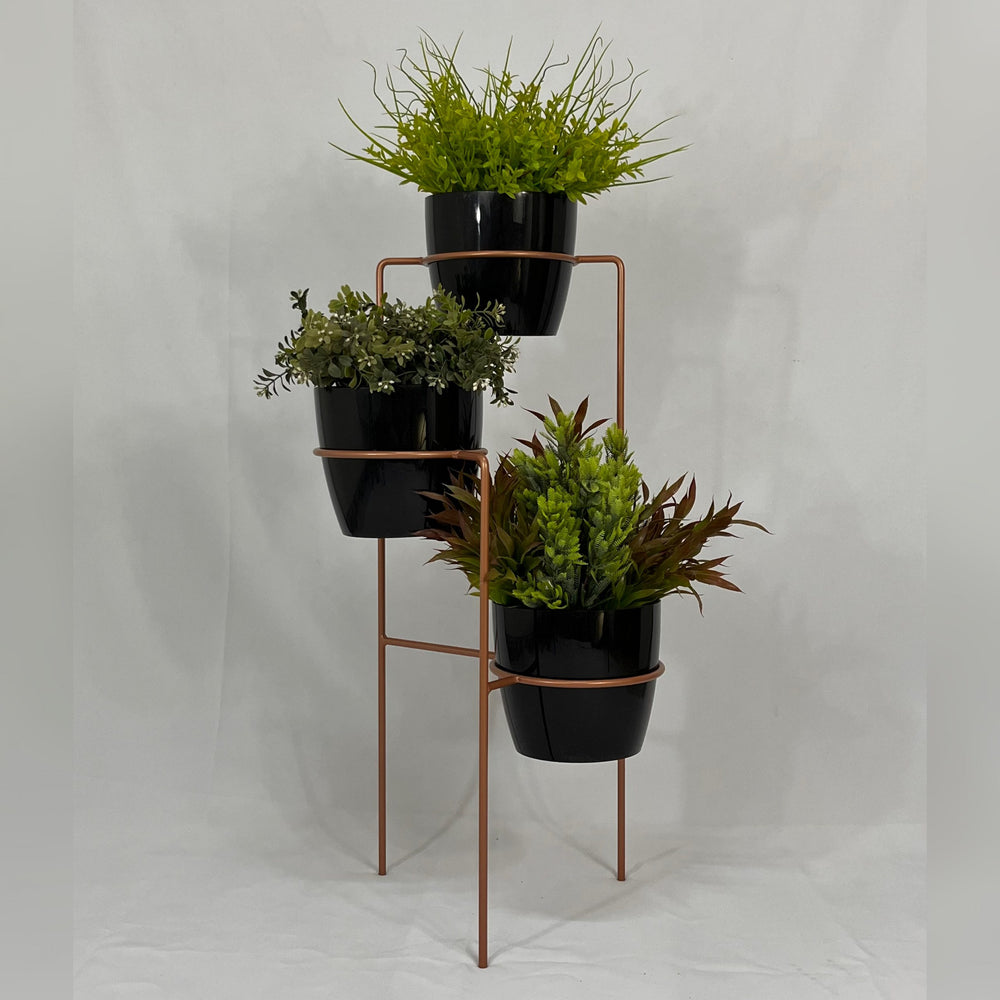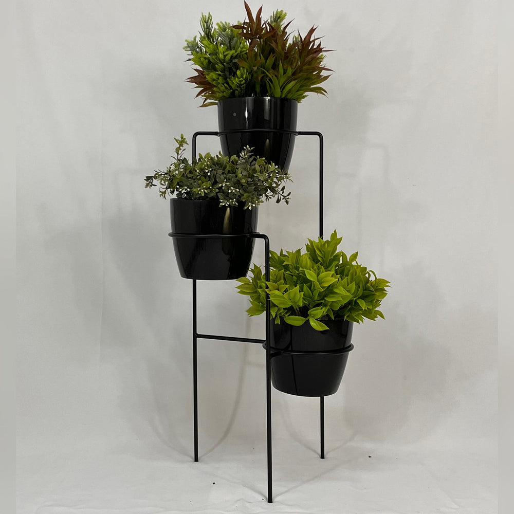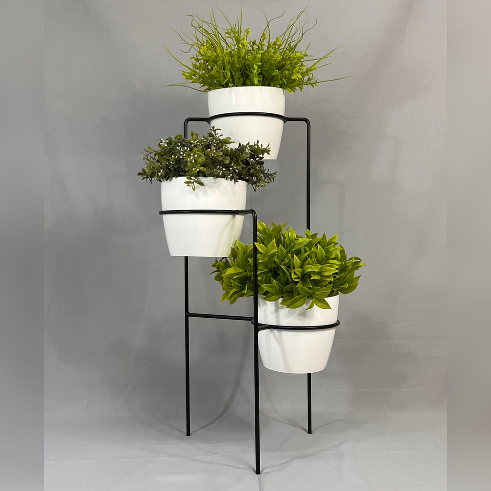 Transforma tus espacios con nuestra elegante base metálica de 70 cm de altura, fabricada en varilla de acero con acabado en pintura electrostática, resistente y de fácil mantenimiento. Incluye tres materos plásticos de 17 cm de diámetro y 15 cm de altura, perfectos para tus plantas favoritas. ¿Por qué elegir nuestro set?