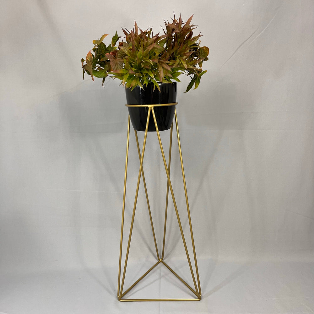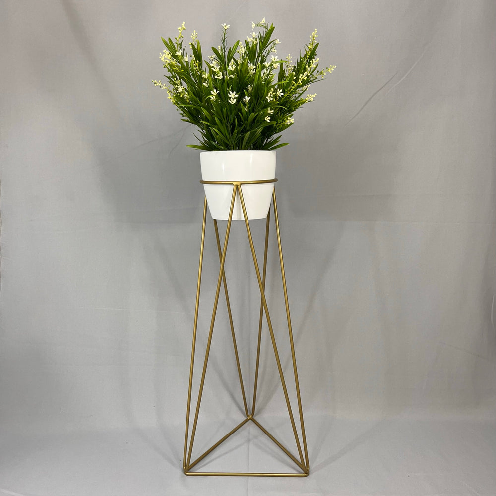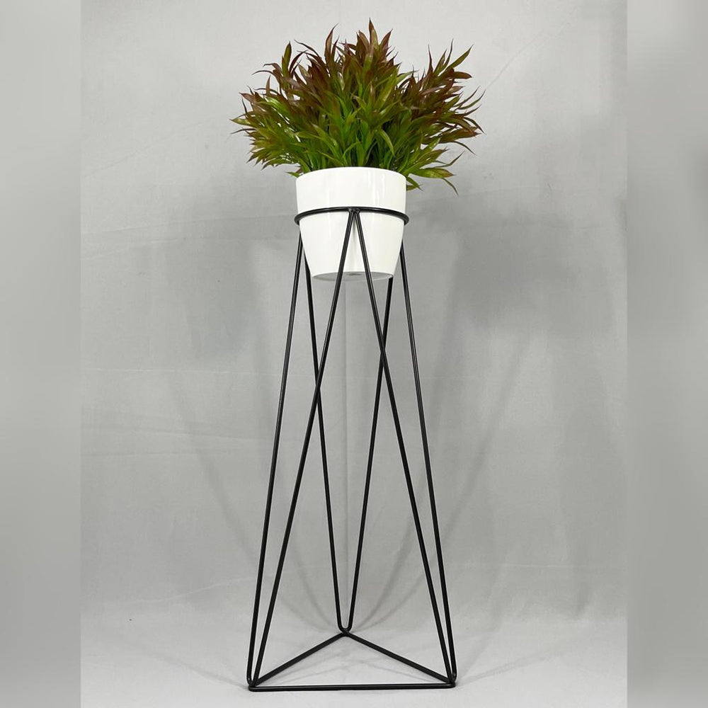 Base de  70 cm de alto, Las bases son de varilla de acero con acabado en pintura electroestática. Los materos de plastico son de 17 cm de diámetro y 15 cm de alto. Incluye base y matera.