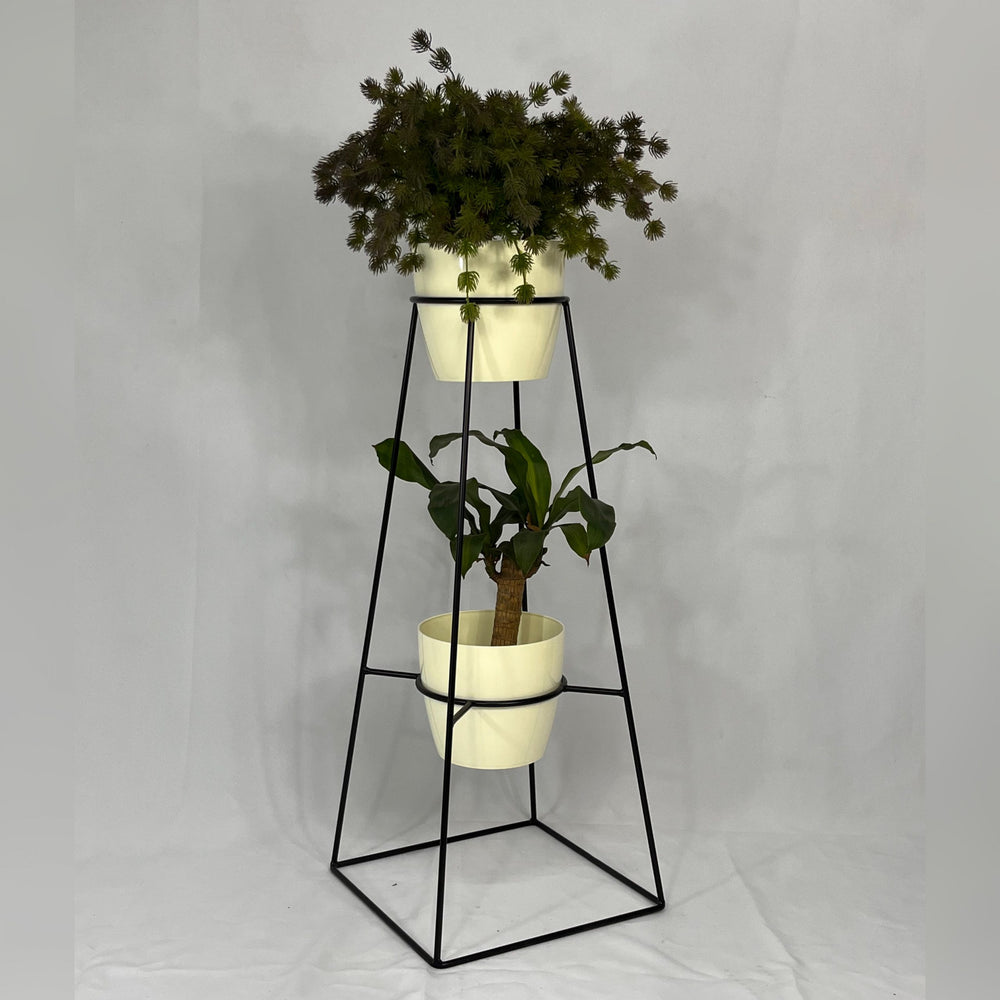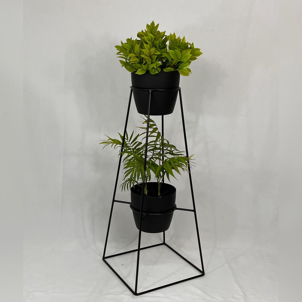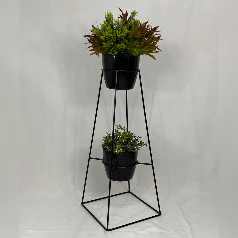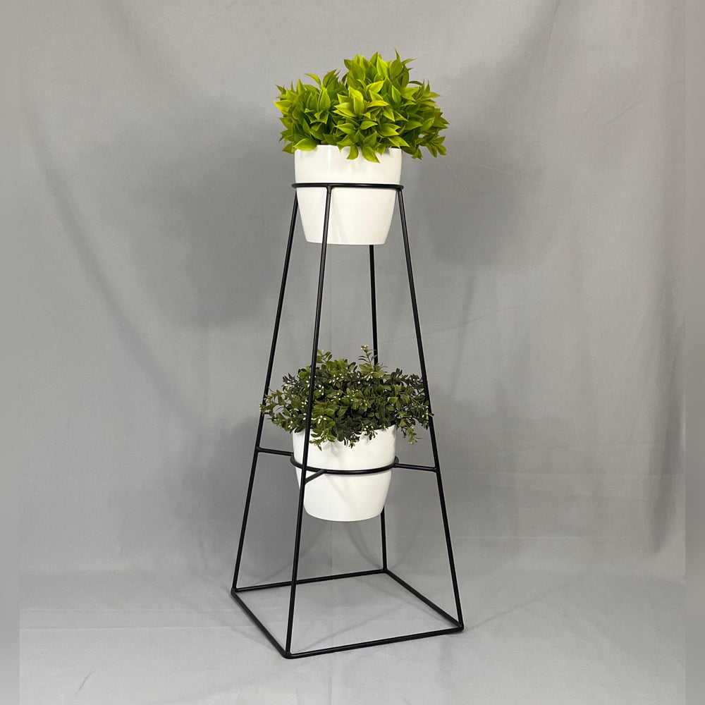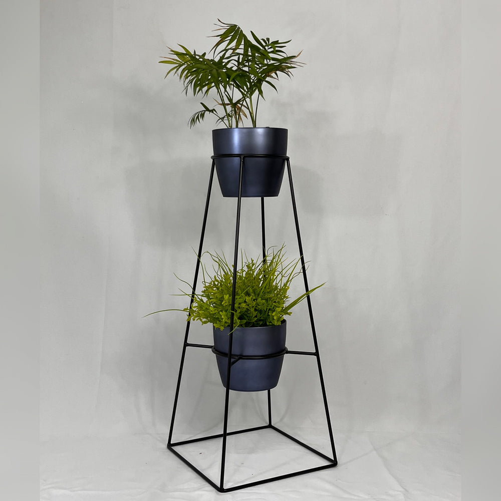Base de 70 cm de alto, base  de varilla de acero con acabado en pintura electroestática. Los materos de plastico son de 17 cm de diámetro y 15 cm de alto.
