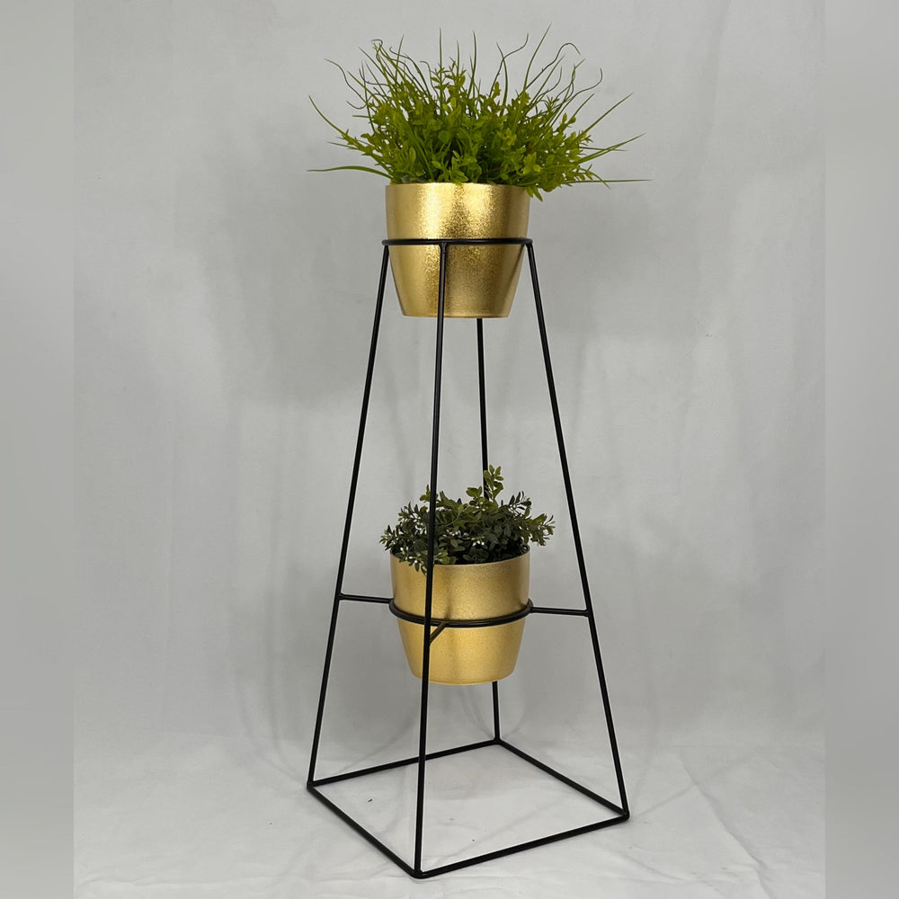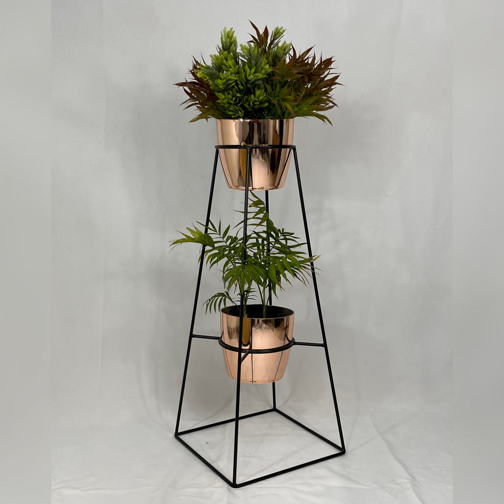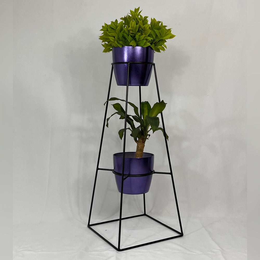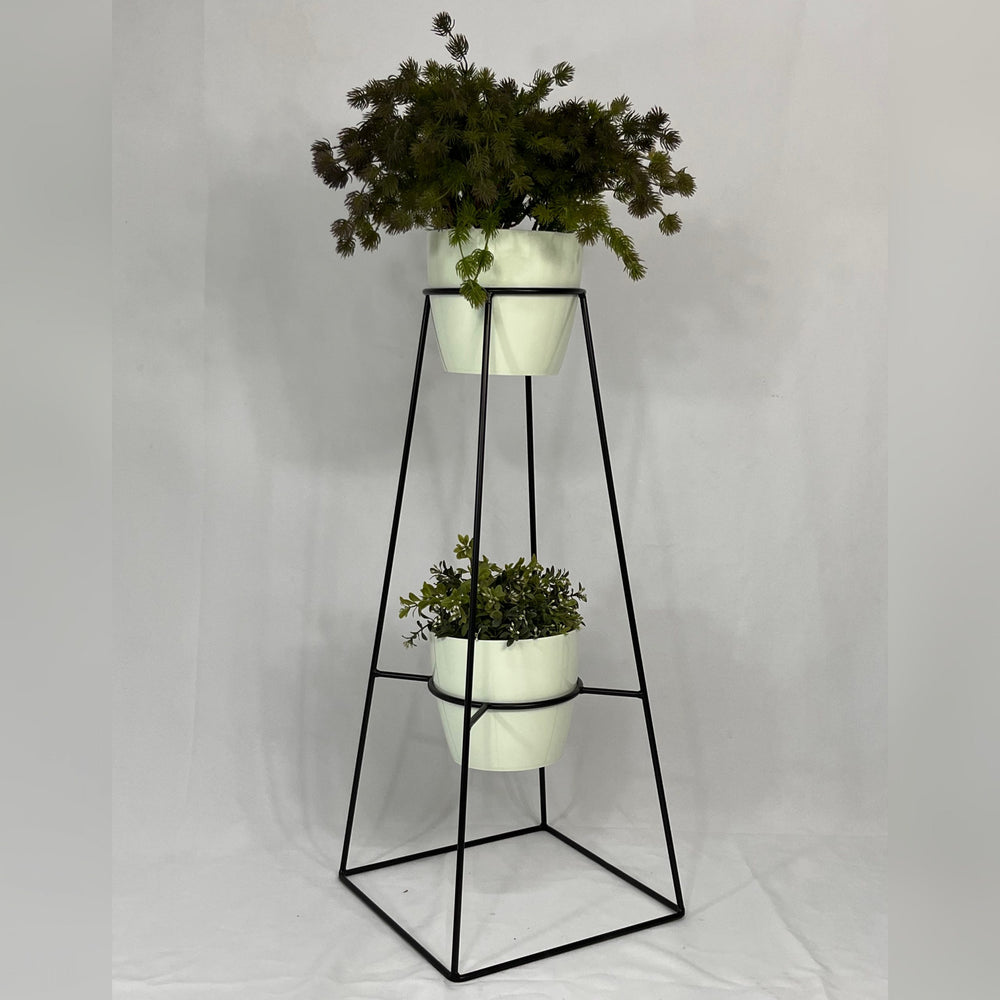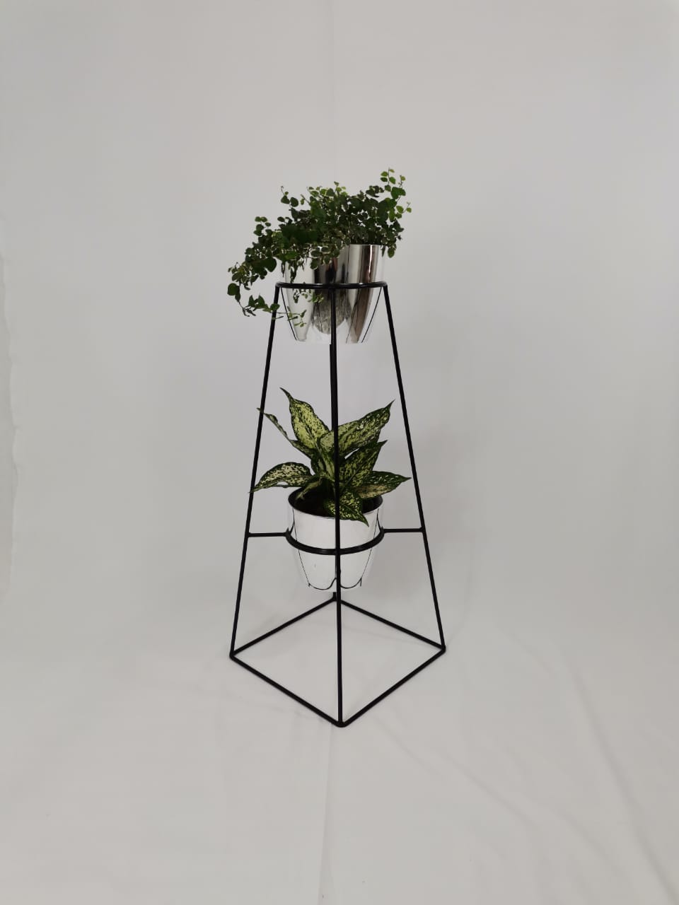 Base de 70 cm de alto, base  de varilla de acero con acabado en pintura electroestática. Los materos de plastico son de 17 cm de diámetro y 15 cm de alto.