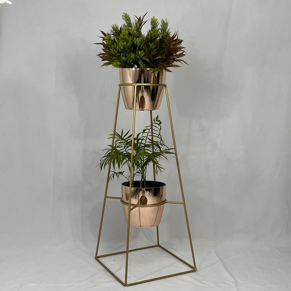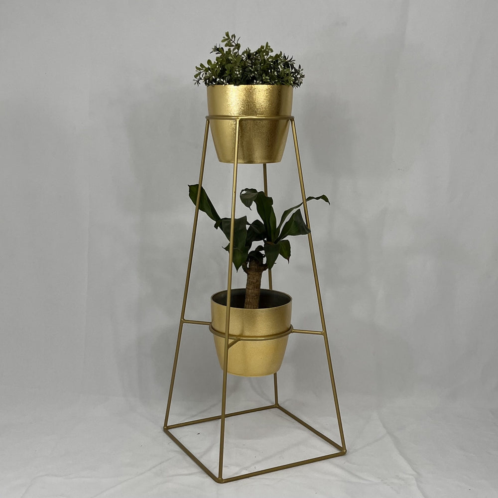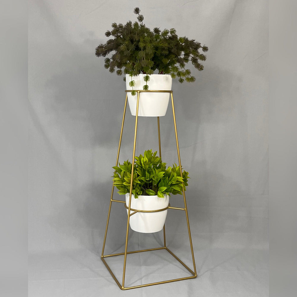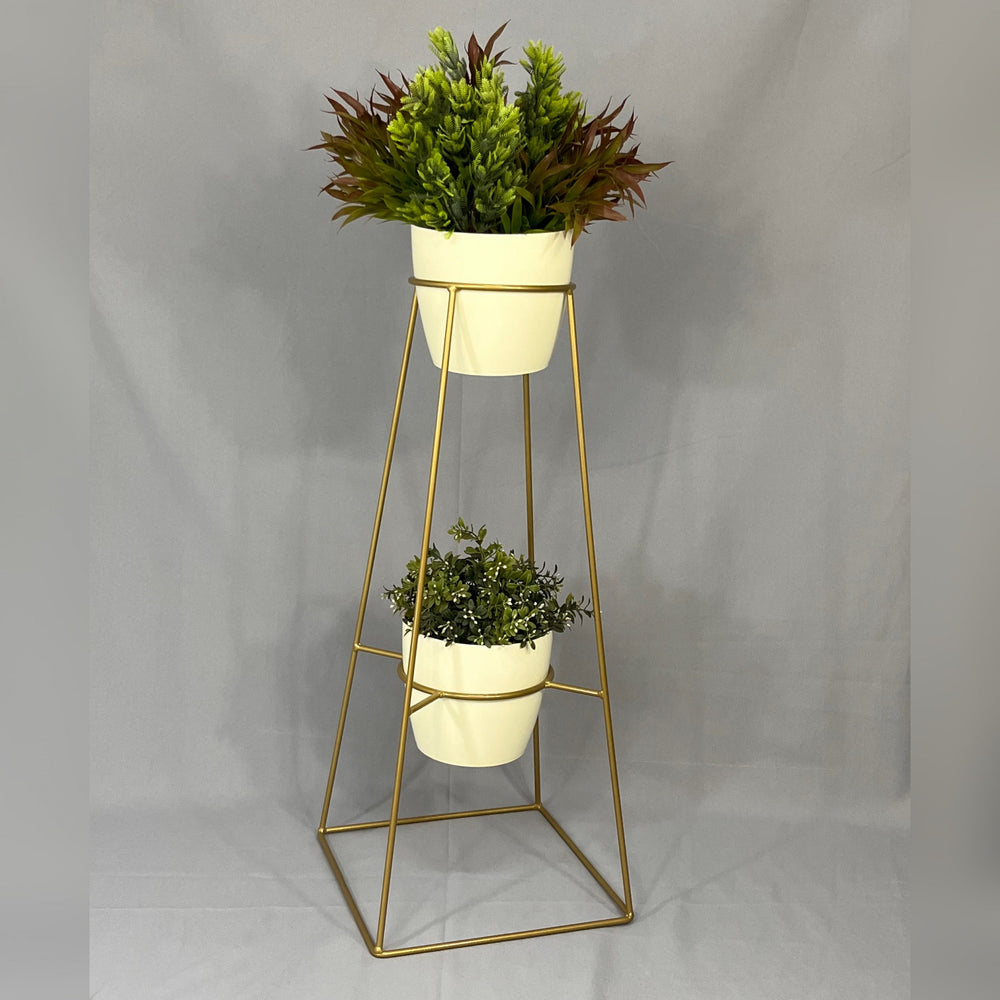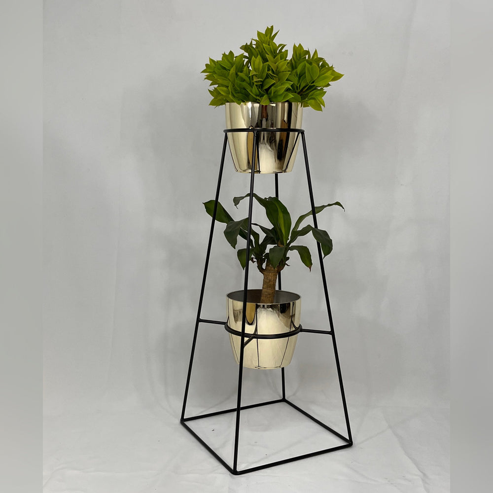 Base de 70 cm de alto, base  de varilla de acero con acabado en pintura electroestática. Los materos de plastico son de 17 cm de diámetro y 15 cm de alto.