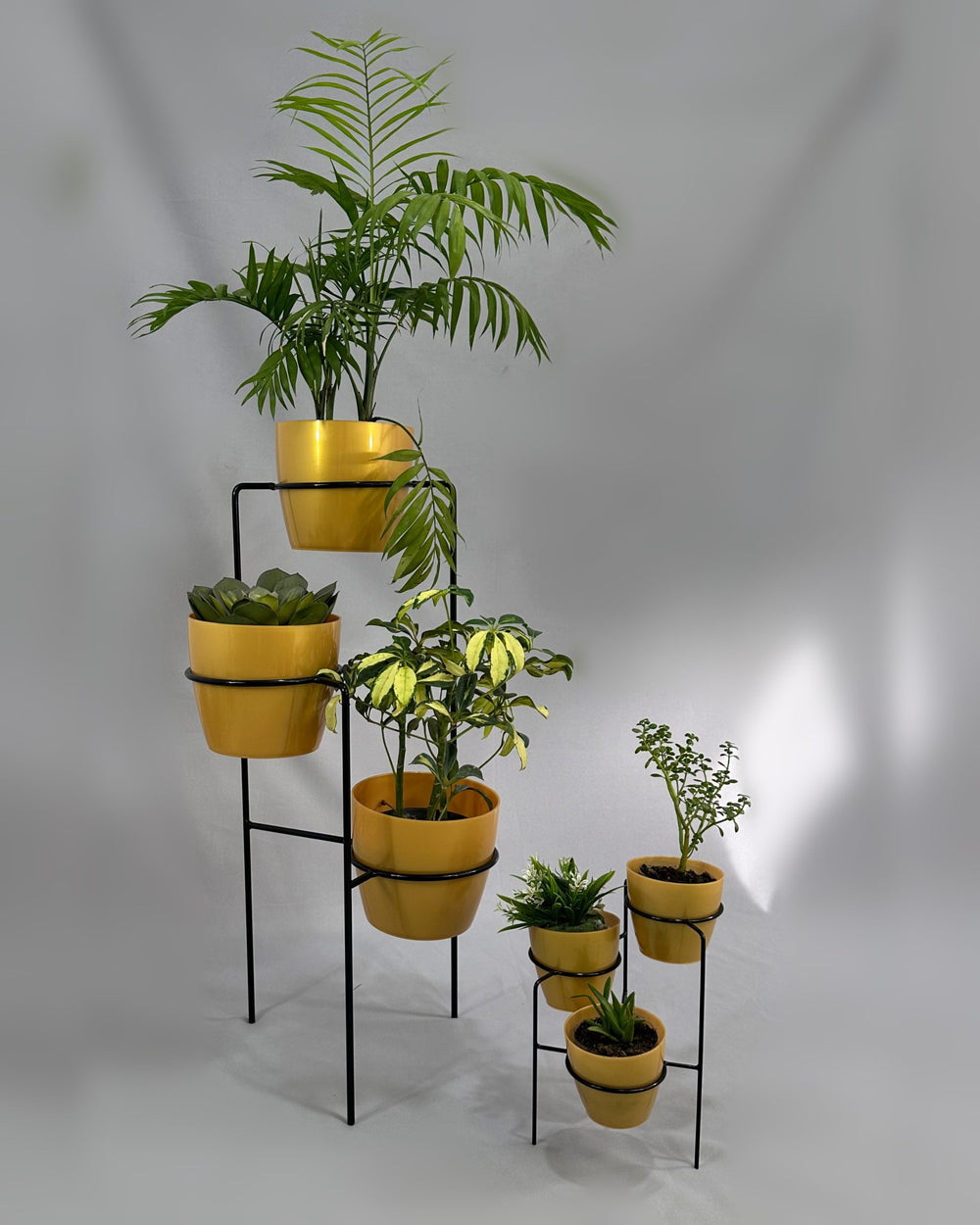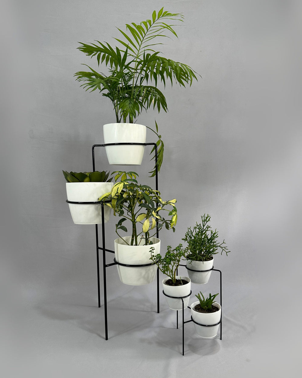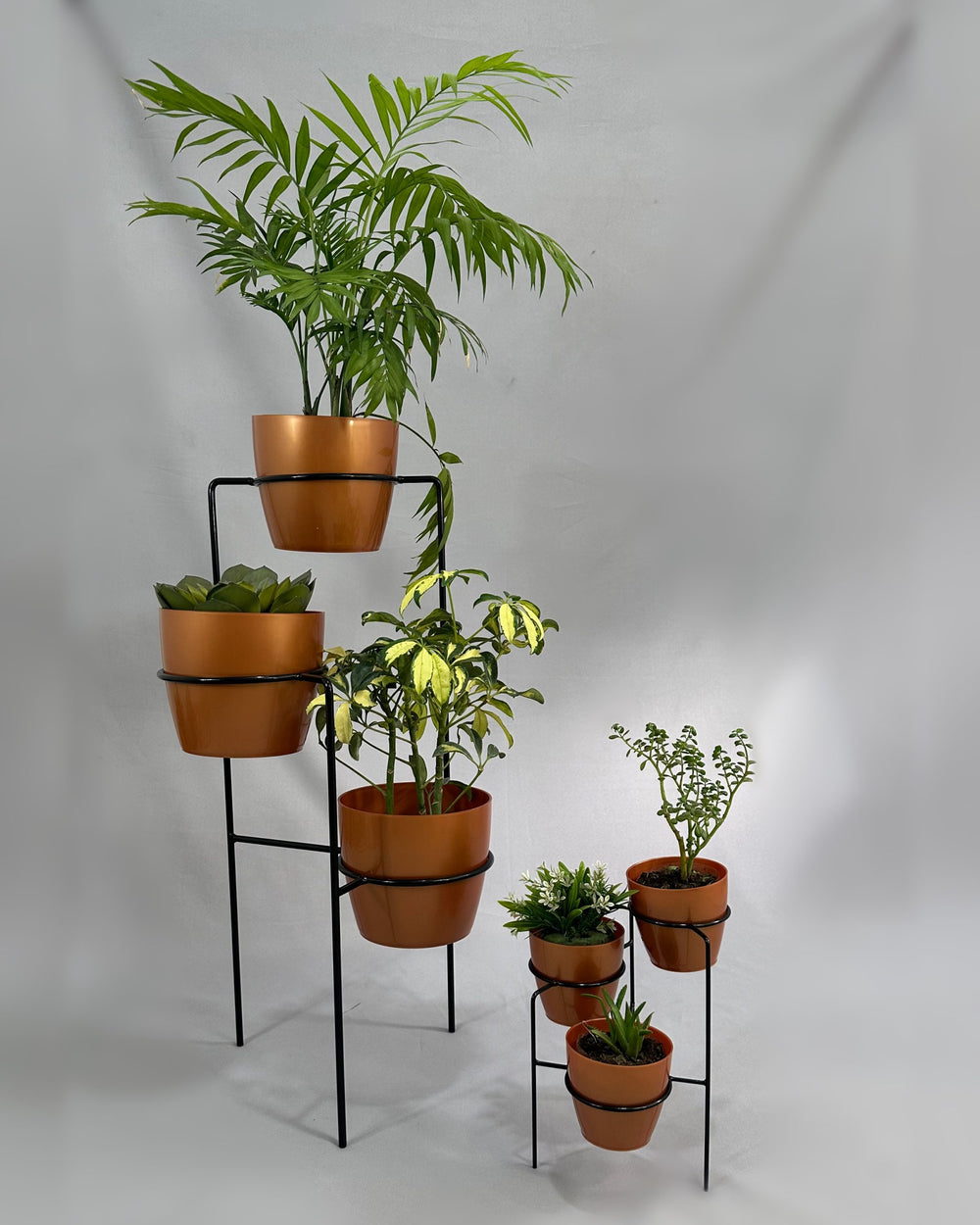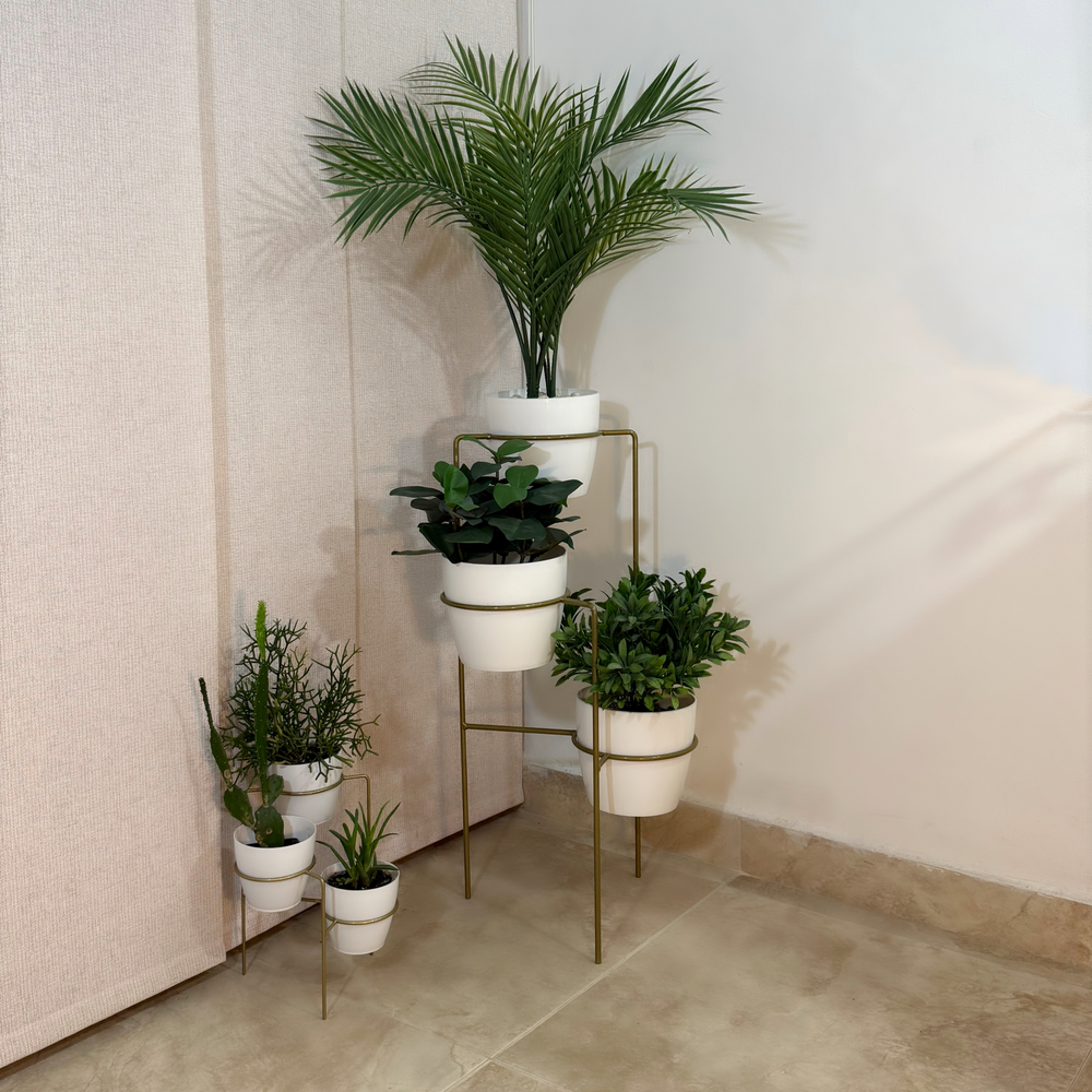 Incluye Base de piso con 3 materos y mini base con 3 materos pequeños. Base de 70 cm de alto hecha de Varilla de acero con avabado en pintura electroestatica Materos en Plastico tipo decorativo de 17 cm de diámetro por 15 cm de alto