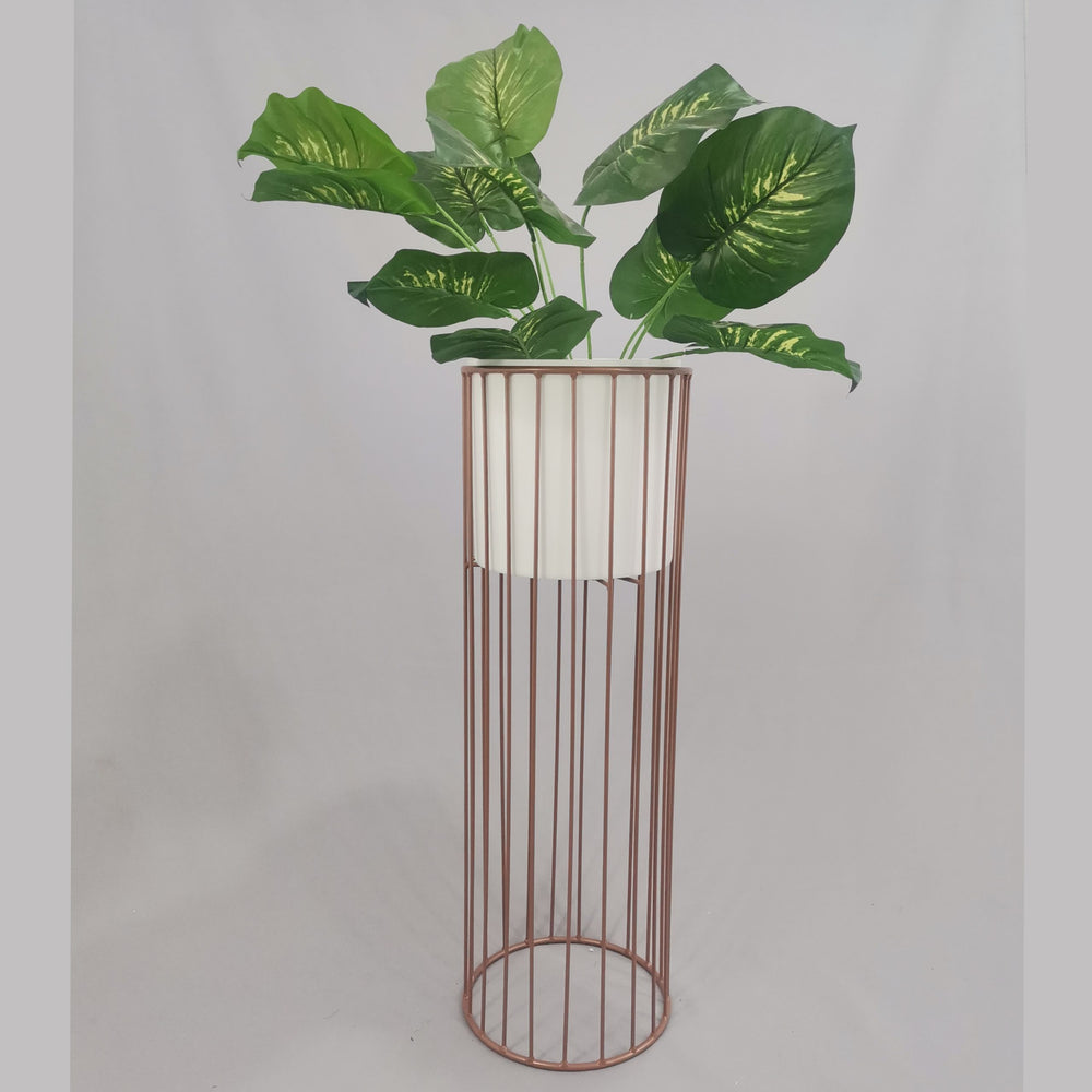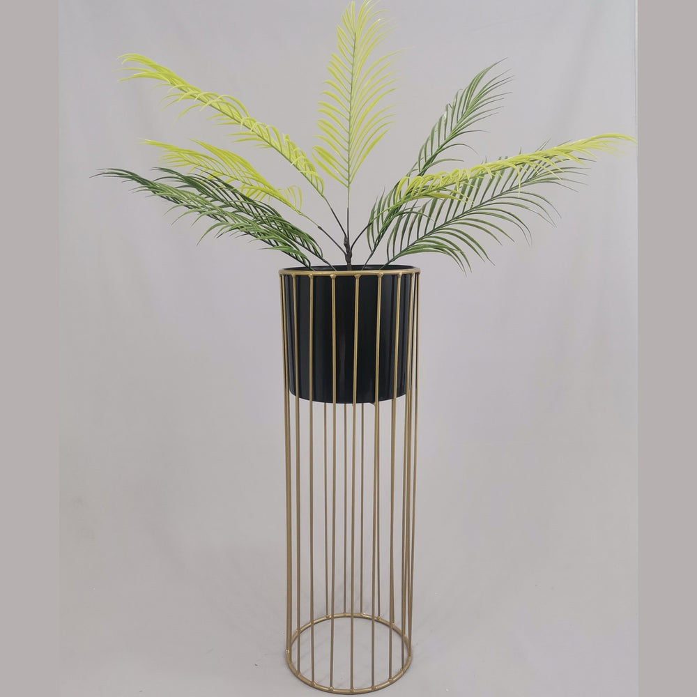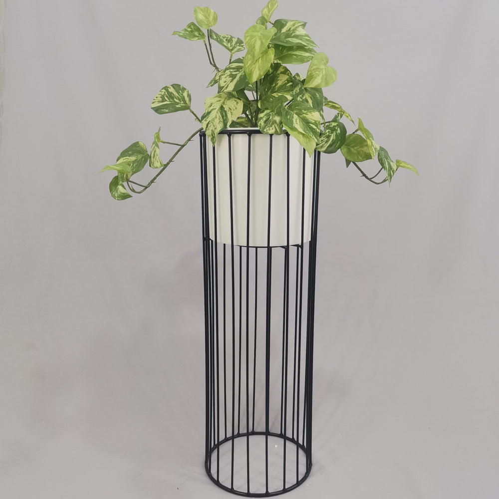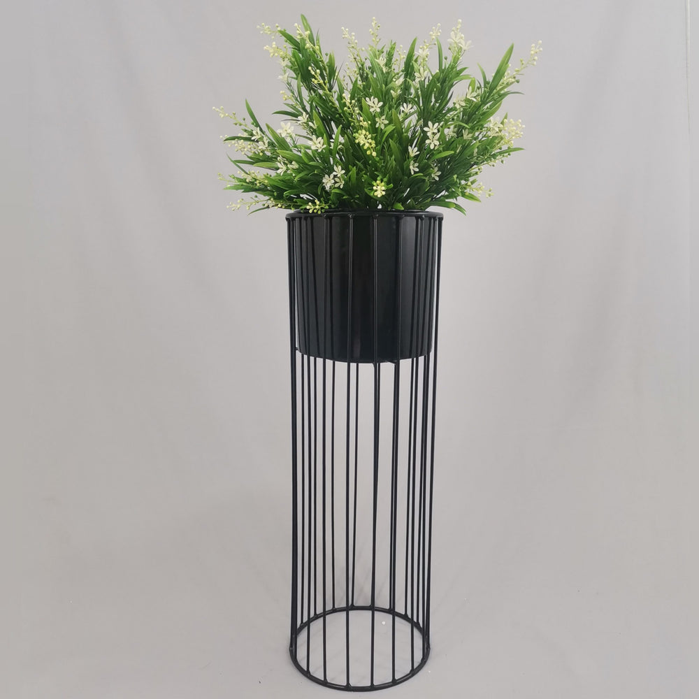 La base mide 70  cm de alto, La base es de varilla de acero con acabado en pintura electroestática. Matero en plastico de 20 cm de diametro por 20 cm de alto Incluye base y matera.