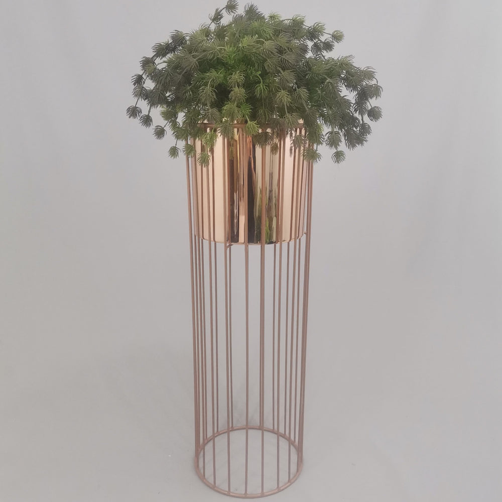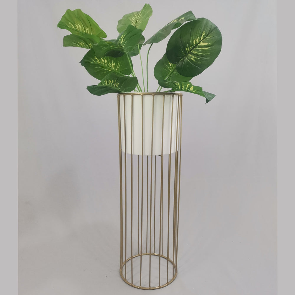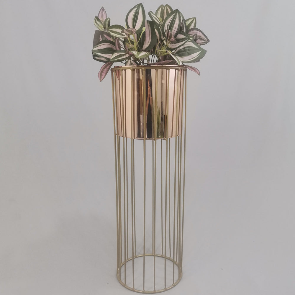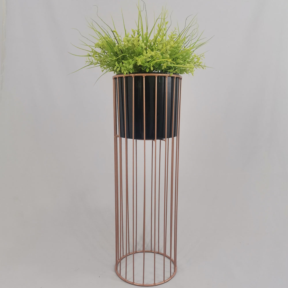 La base mide 70  cm de alto, La base es de varilla de acero con acabado en pintura electroestática. Matero en plastico de 20 cm de diametro por 20 cm de alto Incluye base y matera.