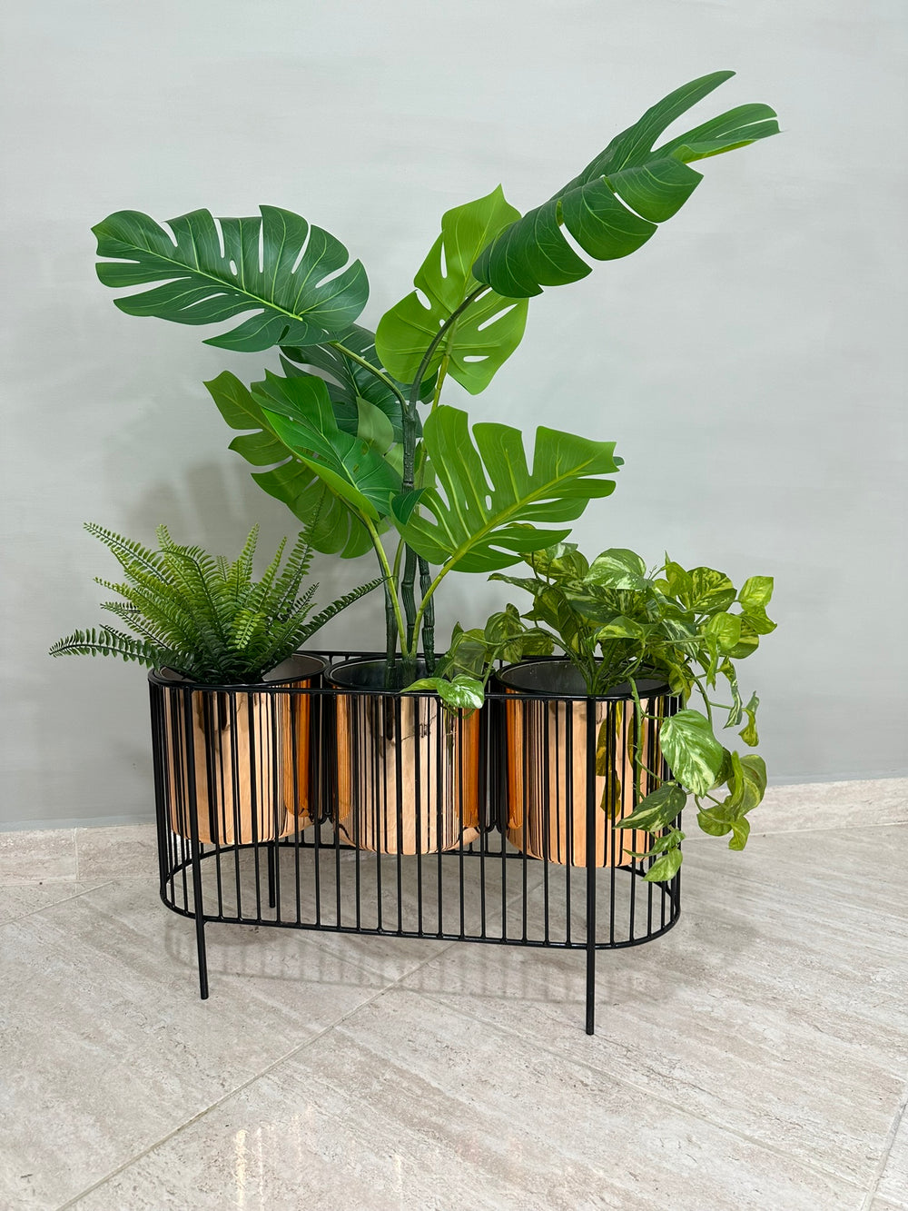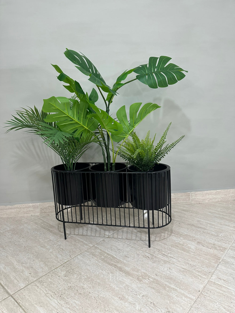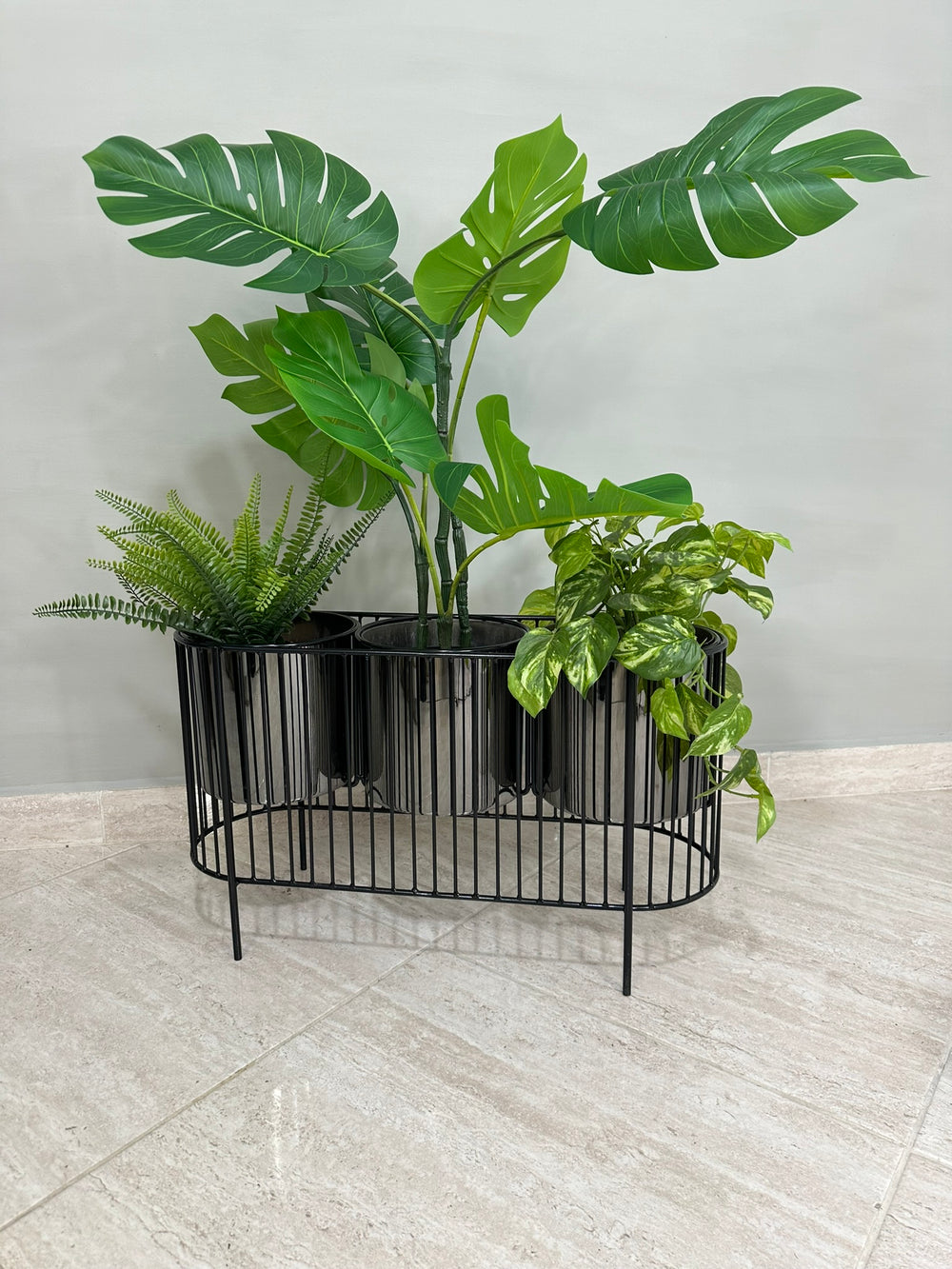 La base mide 40 cm de alto y tiene 70 cm de ancho , La base es de varilla de acero con acabado en pintura electroestática. Materos en plastico de 20 cm de diametro por 20 cm de alto Incluye Base y Tres materos.