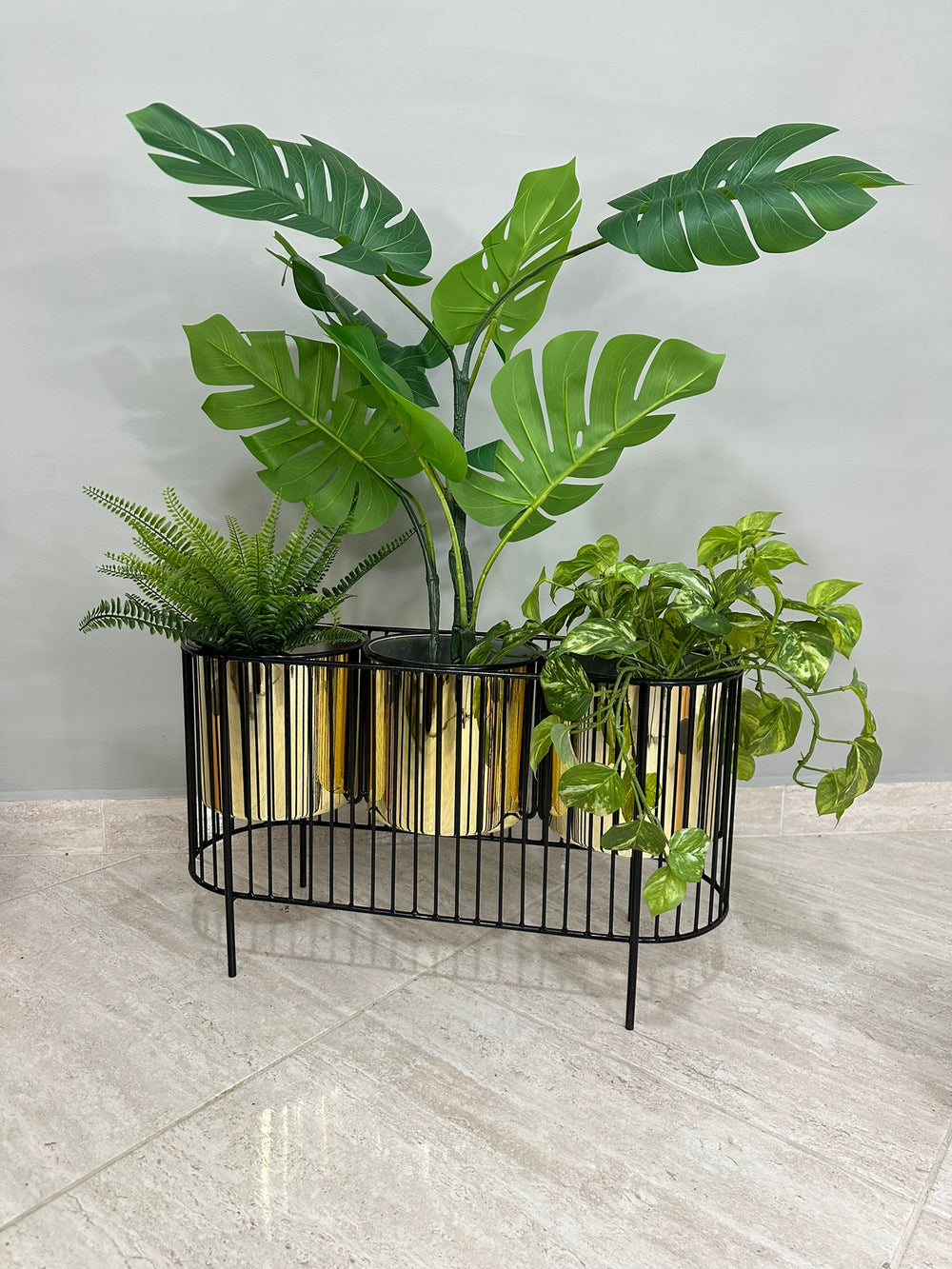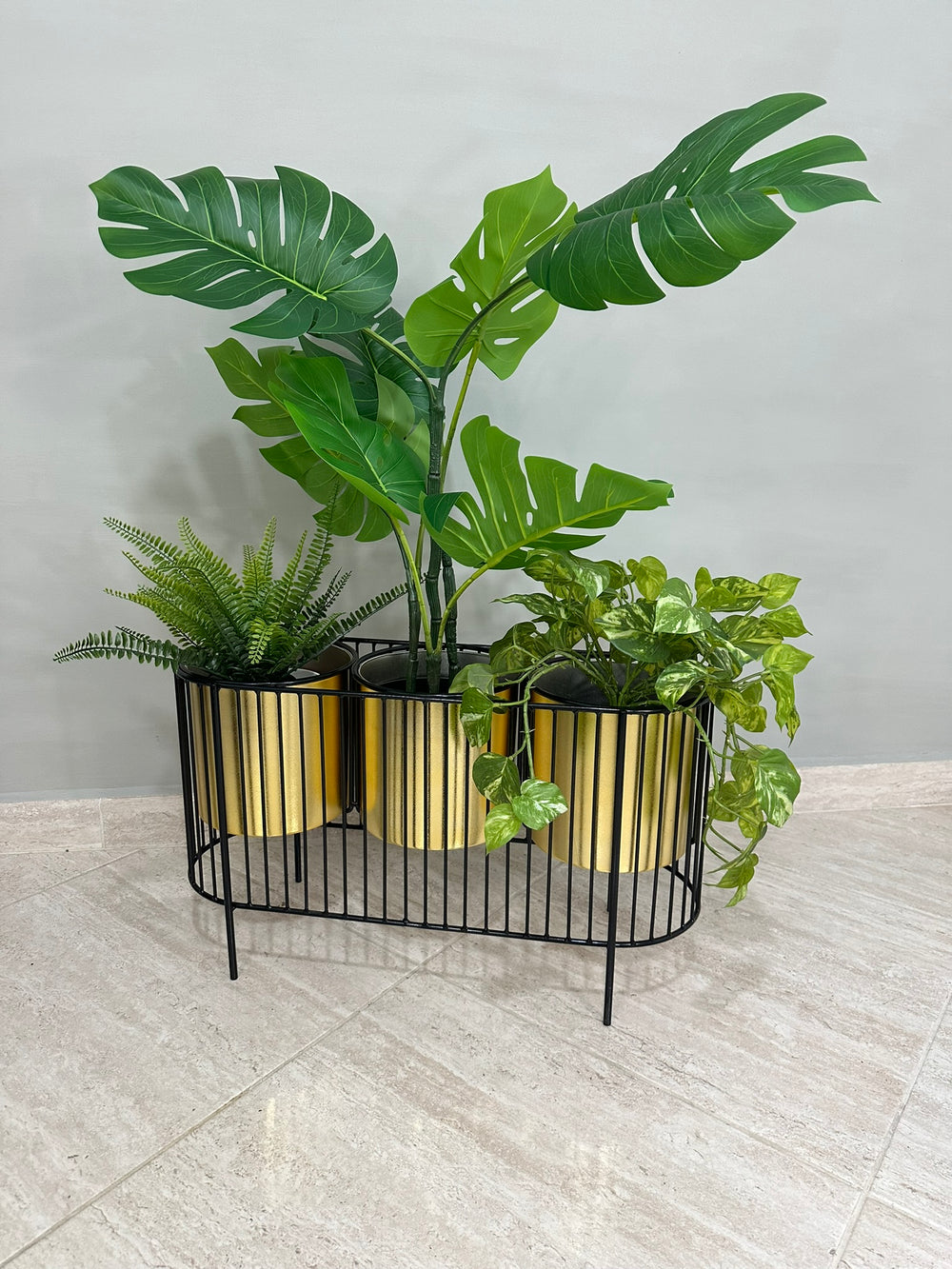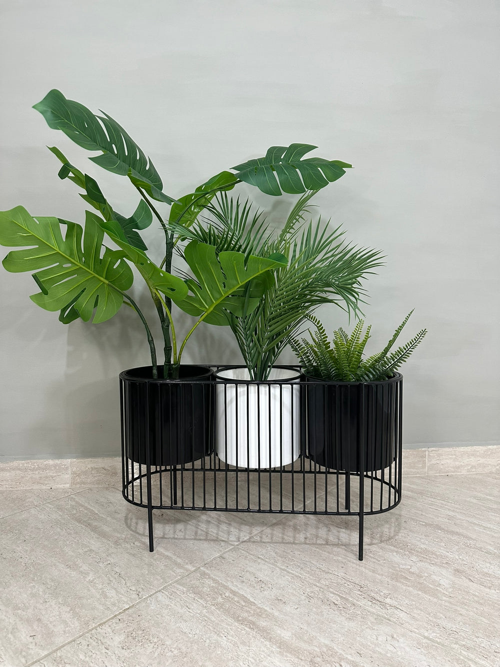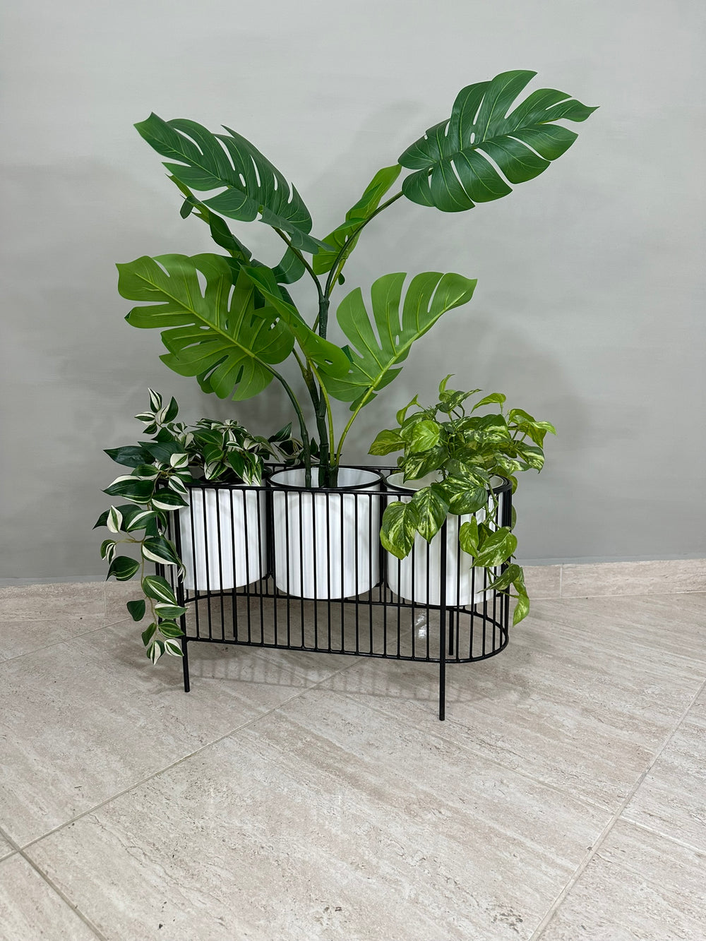 La base mide 40 cm de alto y tiene 70 cm de ancho , La base es de varilla de acero con acabado en pintura electroestática. Materos en plastico de 20 cm de diametro por 20 cm de alto Incluye Base y Tres materos.