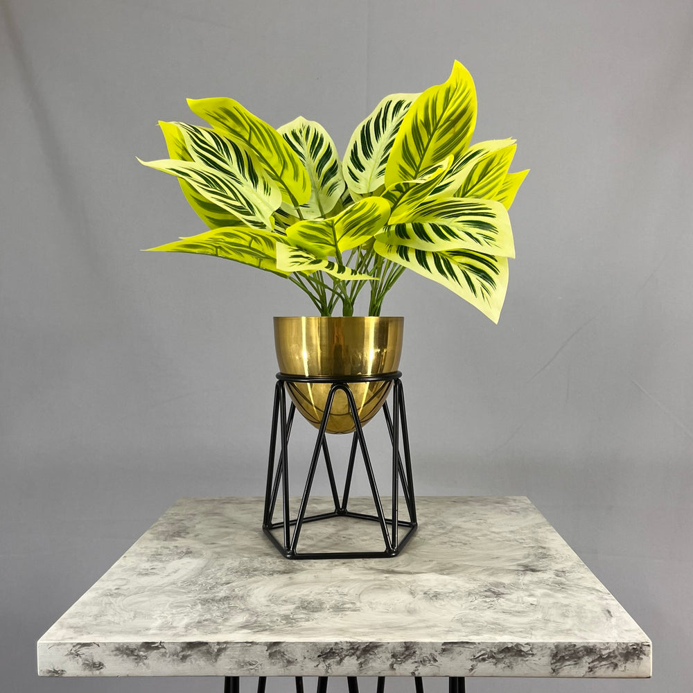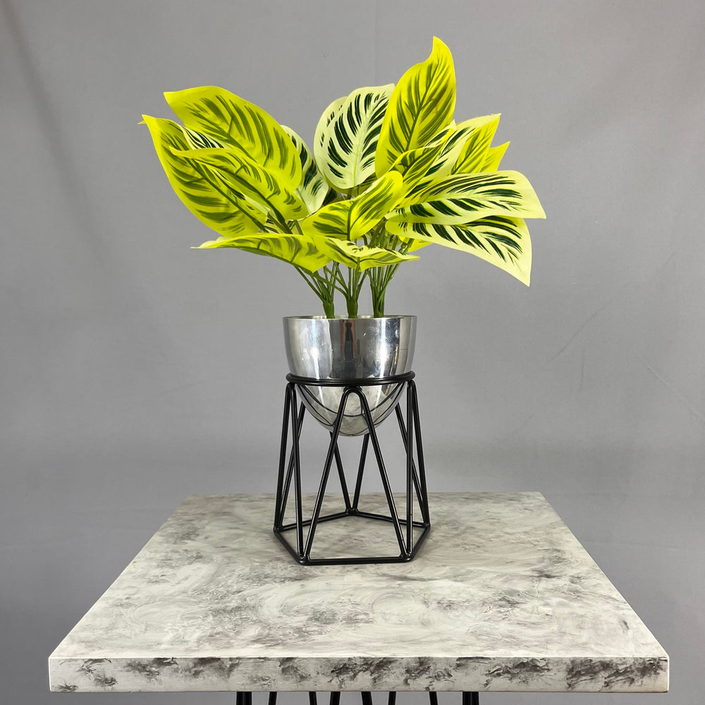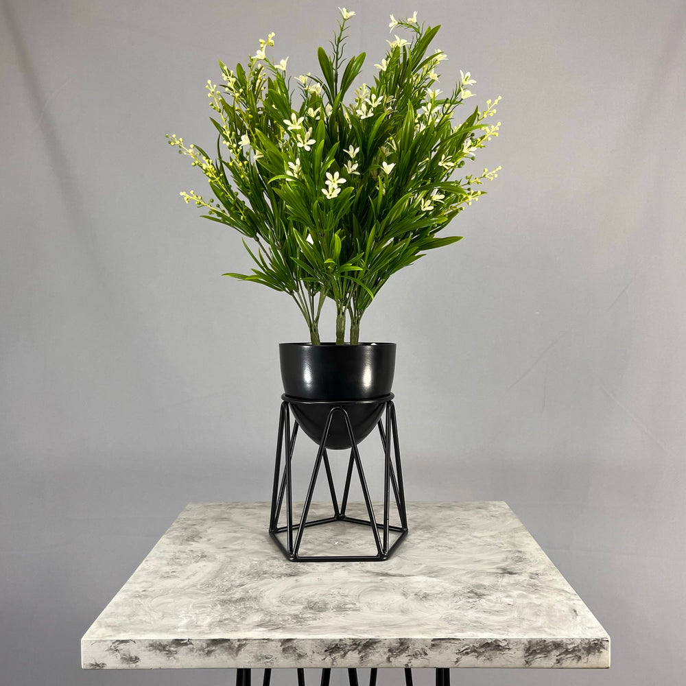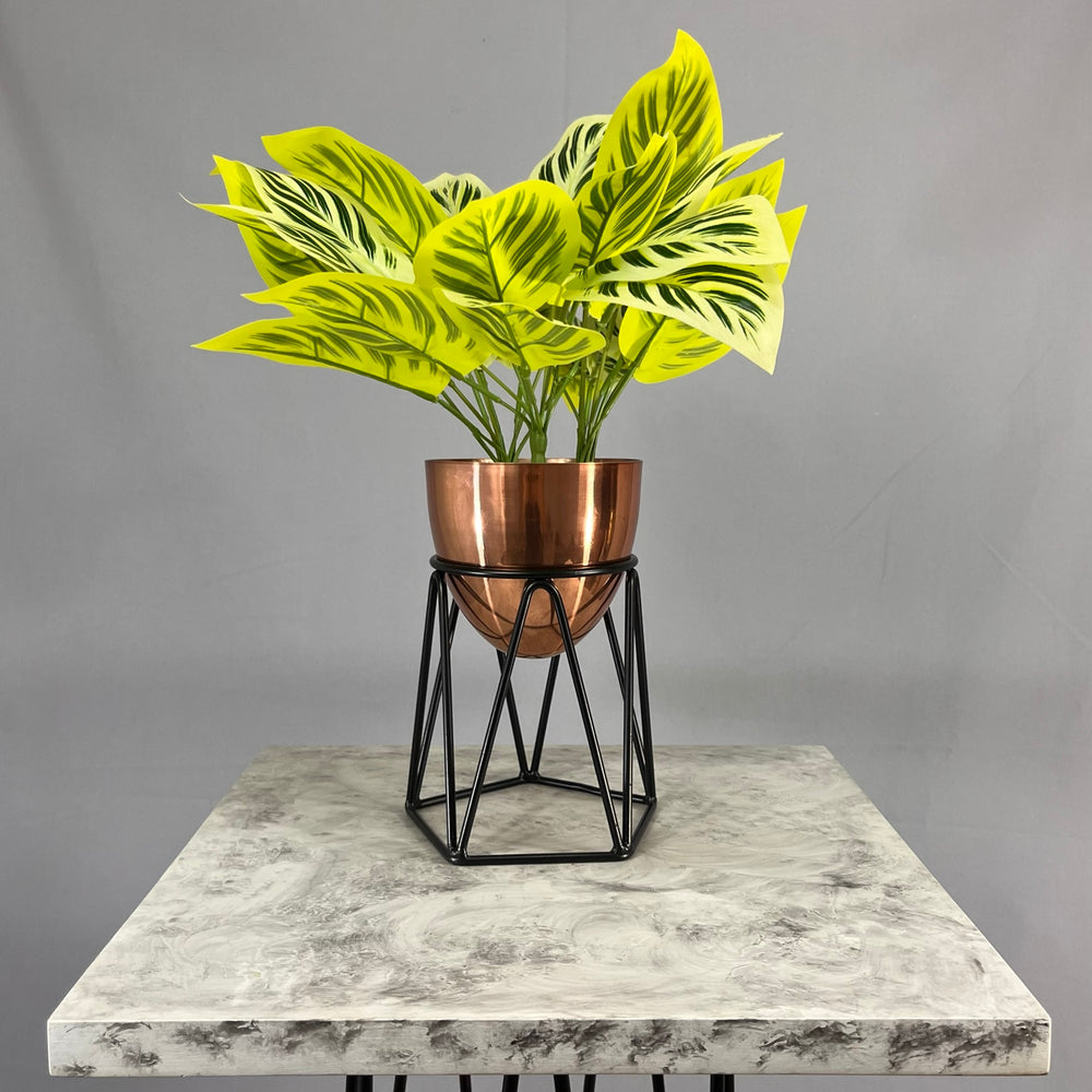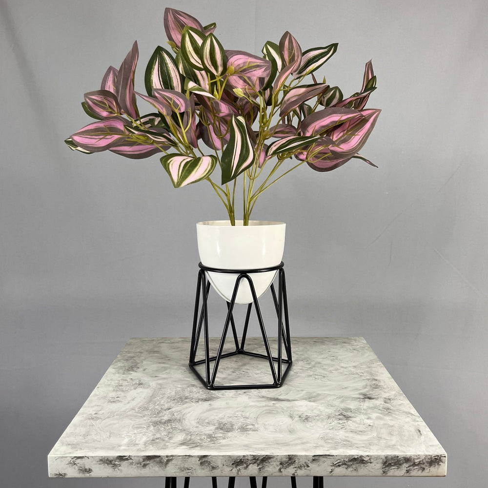 Base en Alambre con acabado en pintura electroestatica, cuenta con 15 cm de alto y un diametro de 12 cm. Matera en forma de Huevo de 12 cm de diametro en Aluminio , tiene acabado en pintura liquida horneable. No incluye planta.
