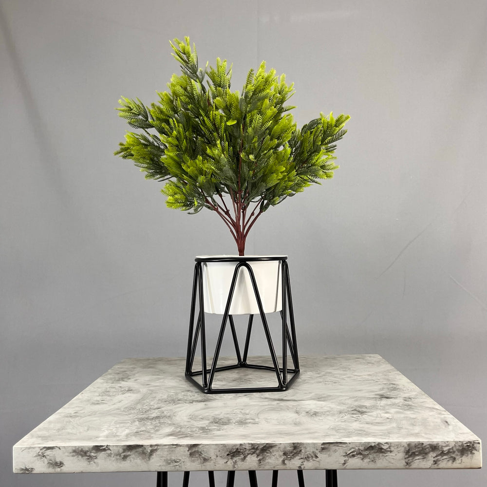 Base en Alambre con acabado en pintura electroestatica, cuenta con 15 cm de alto y un diametro de 12 cm. Matera  en forma de Cilindro , cuenta con 12 cm de diametro y es de aluminio con acabado en pintura electroestatica. No incluye planta. Una vez realizado el pago despacharemos el pedido en los siguientes 3 días hábiles o menos
