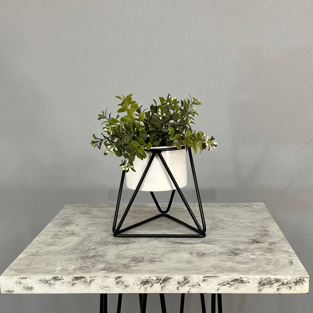 Base en Alambre con acabado en pintura electroestatica, cuenta con 15 cm de alto y un diametro de 12 cm. Matera  en forma de Cilindro , cuenta con 12 cm de diametro y es de aluminio con acabado en pintura electroestatica. No incluye planta. Una vez realizado el pago despacharemos el pedido en los siguientes 3 días hábiles o menos