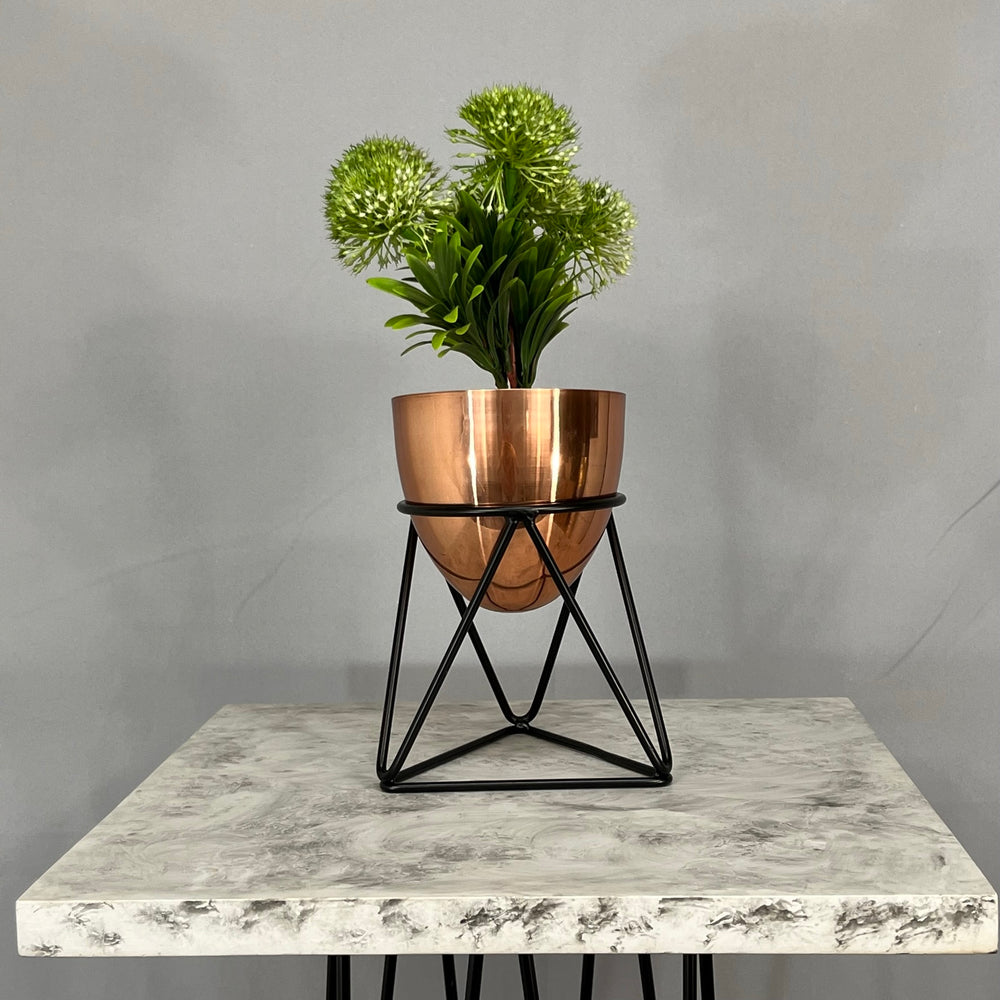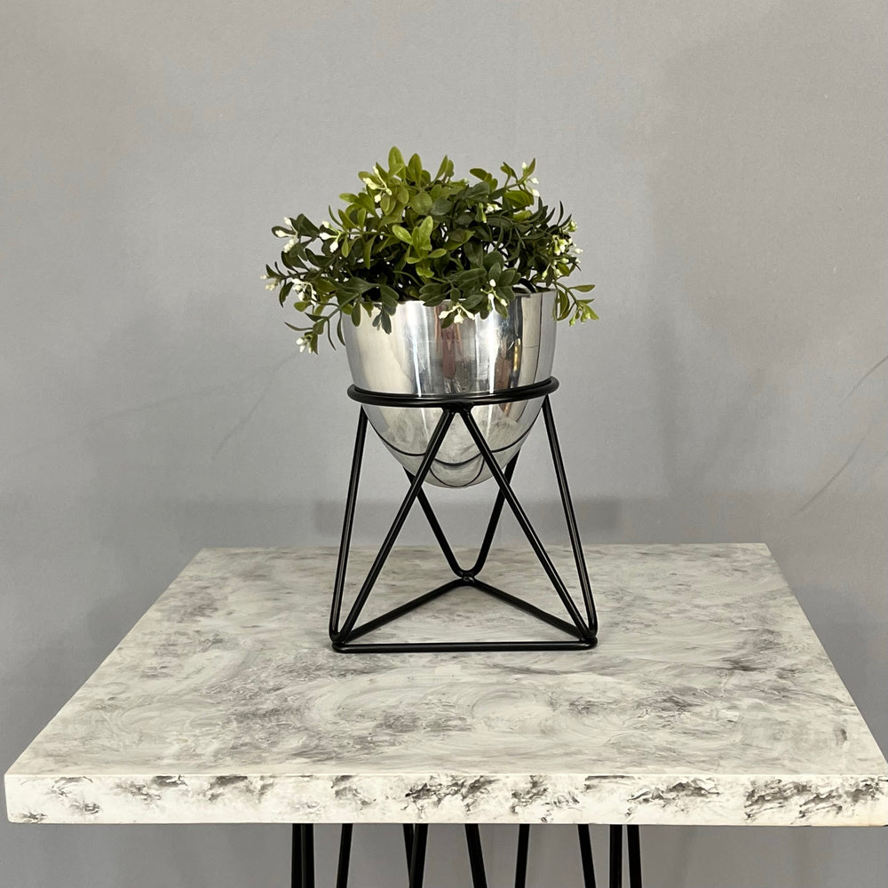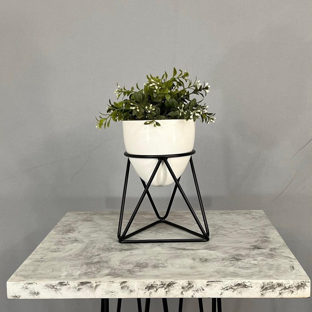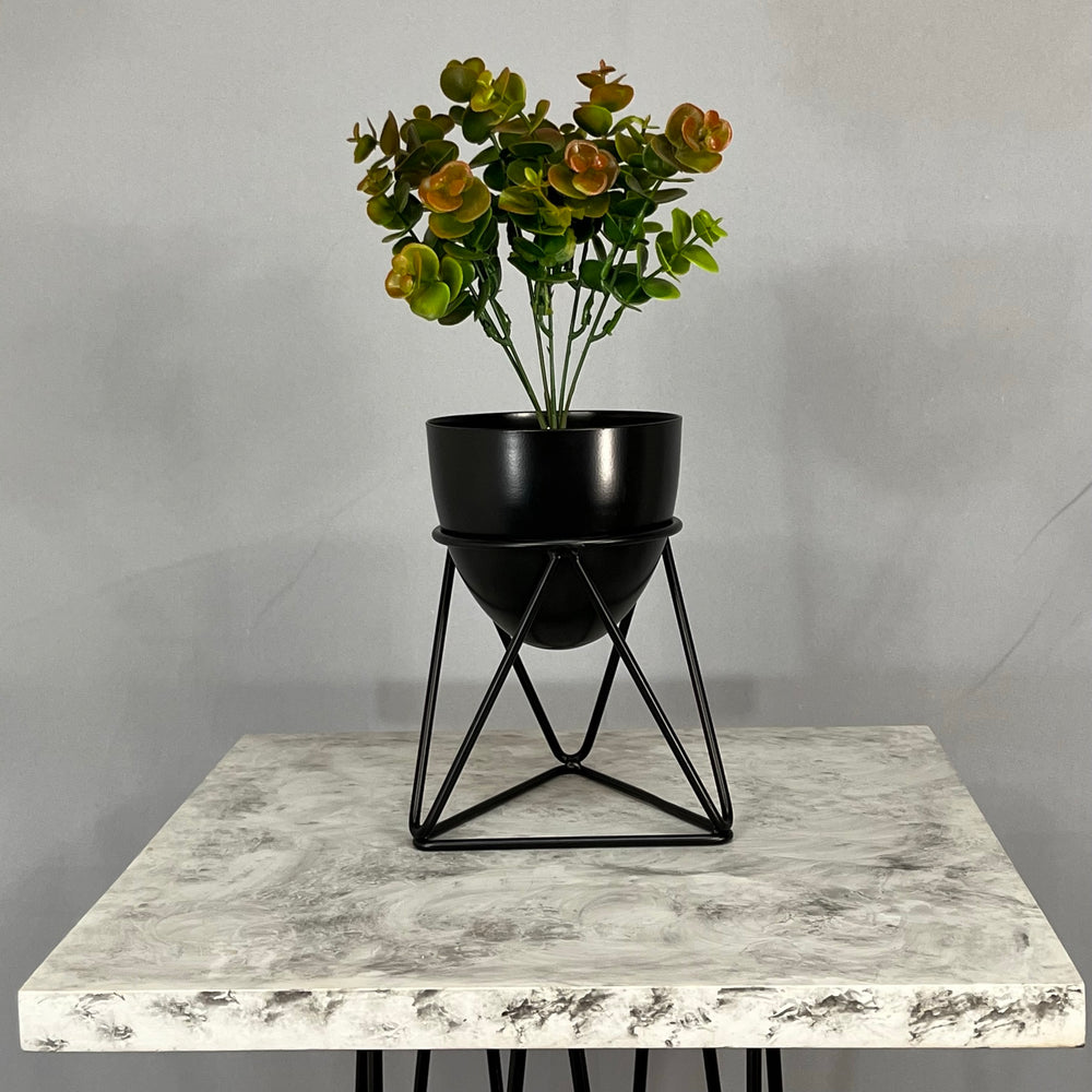 Base en Alambre con acabado en pintura electroestatica, cuenta con 15 cm de alto y un diametro de 12 cm. Matera en forma de Huevo de 12 cm de diametro en Aluminio , tiene acabado en pintura liquida horneable. No incluye planta.
