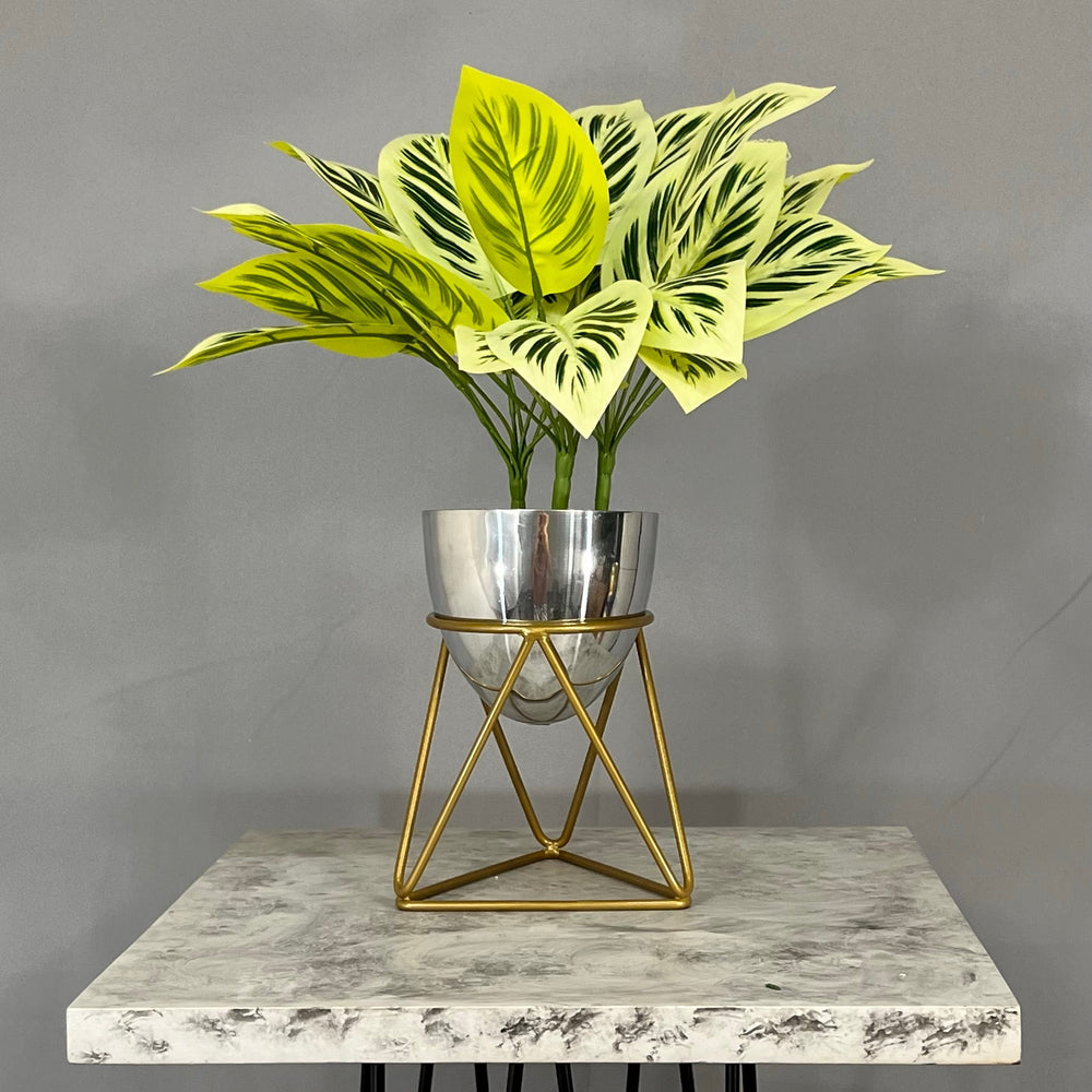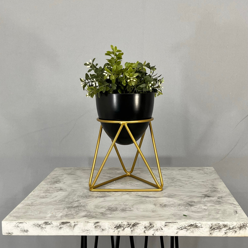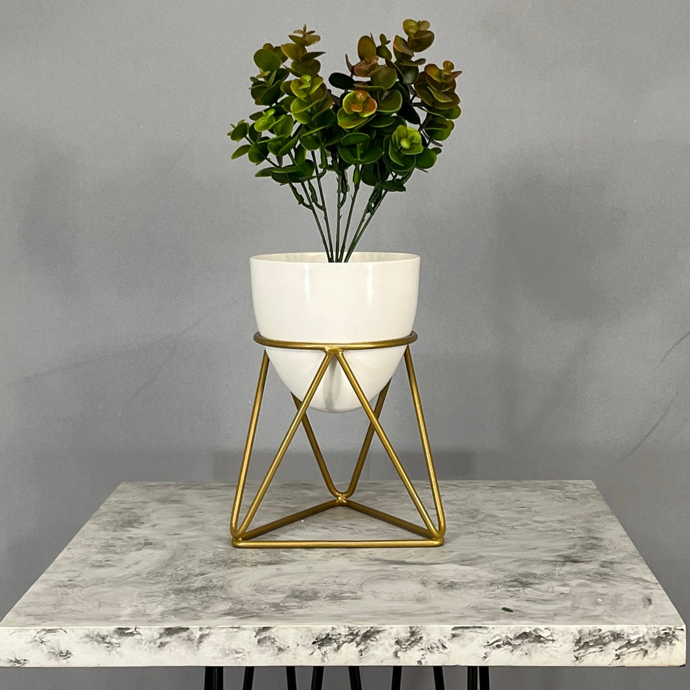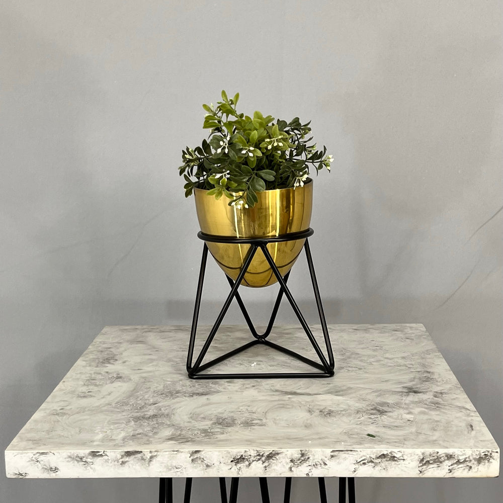 Base en Alambre con acabado en pintura electroestatica, cuenta con 15 cm de alto y un diametro de 12 cm. Matera en forma de Huevo de 12 cm de diametro en Aluminio , tiene acabado en pintura liquida horneable. No incluye planta.