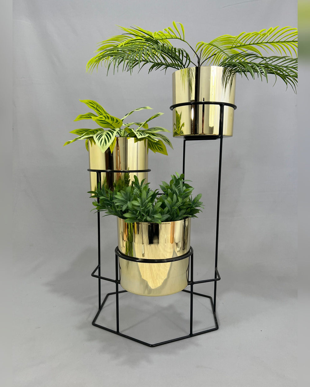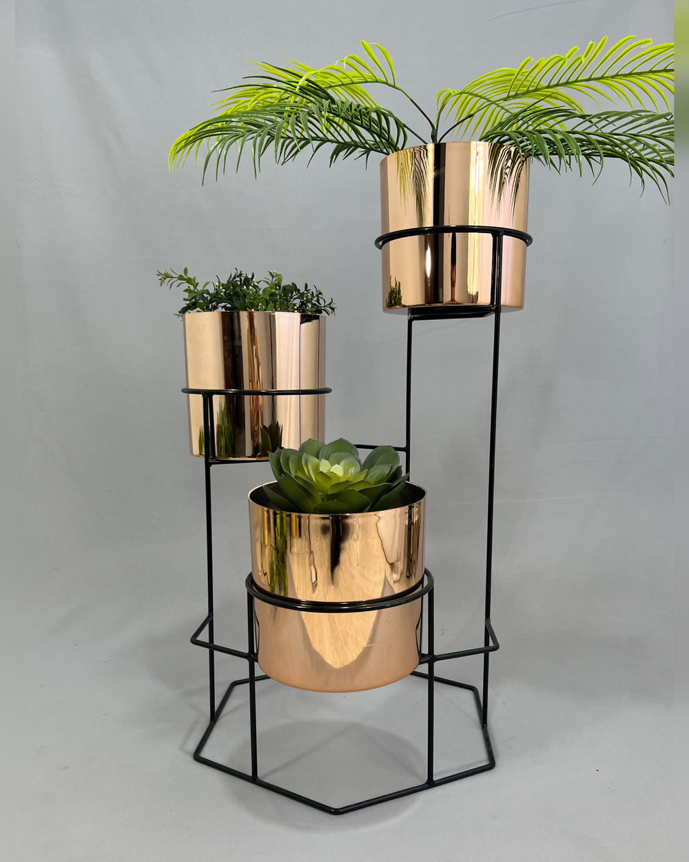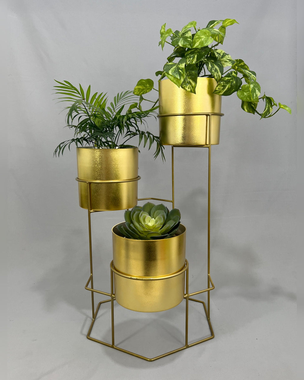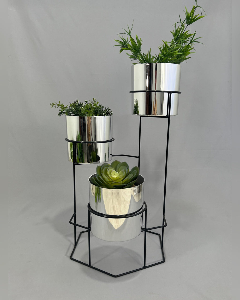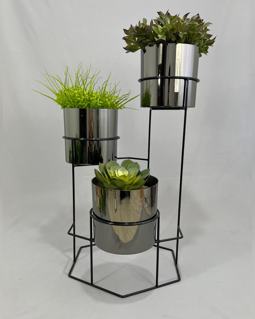 La base mide 70 cm de alto, La base es de varilla de acero con acabado en pintura electroestática. Materos en plastico de 20 cm de diametro por 20 cm de alto Incluye Base y Tres materos.