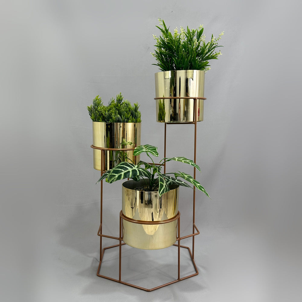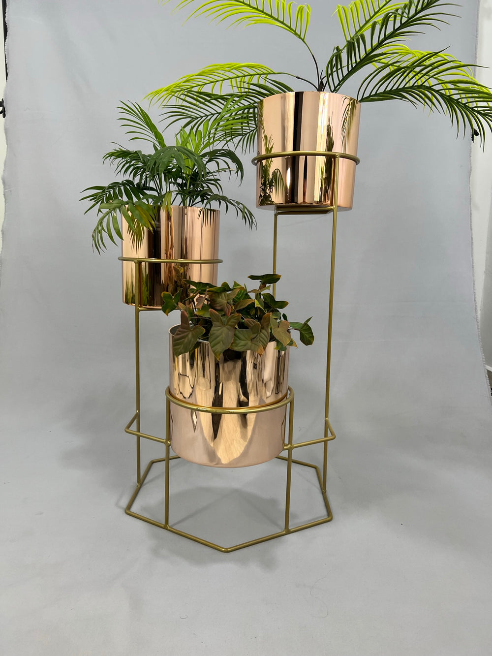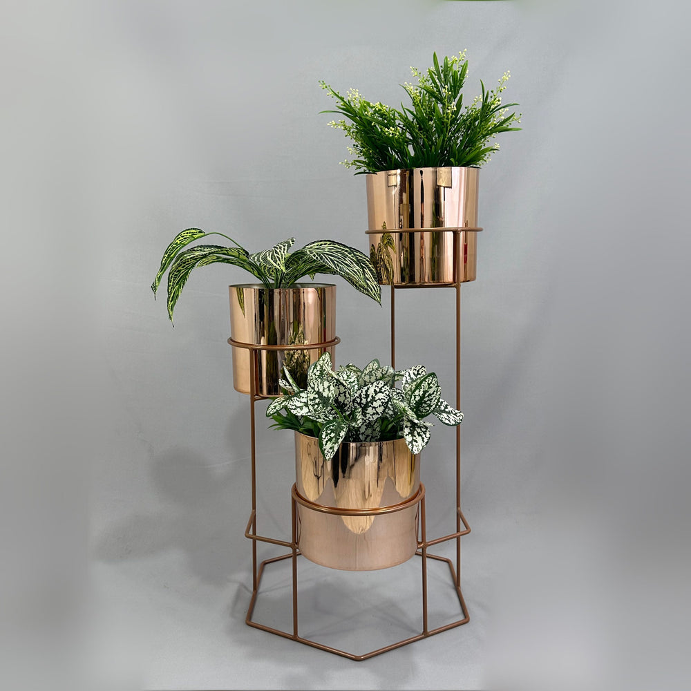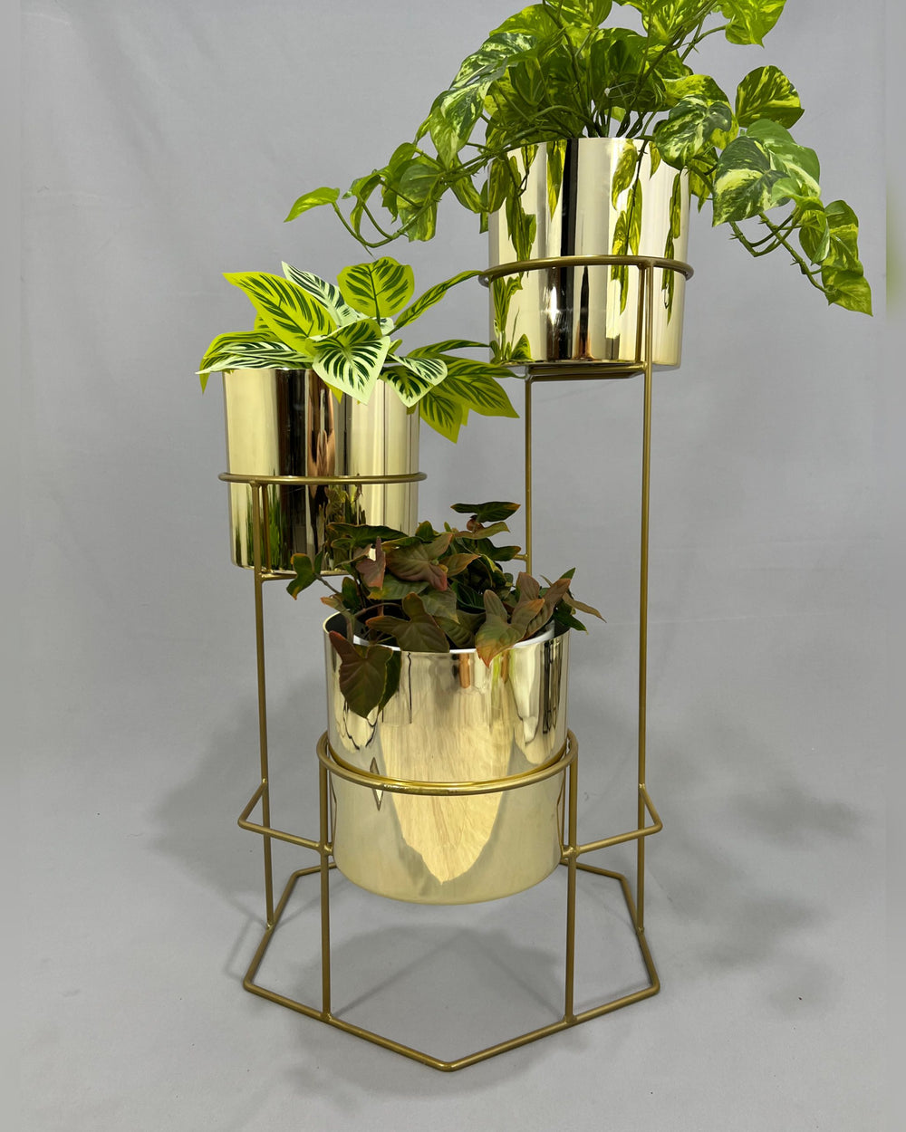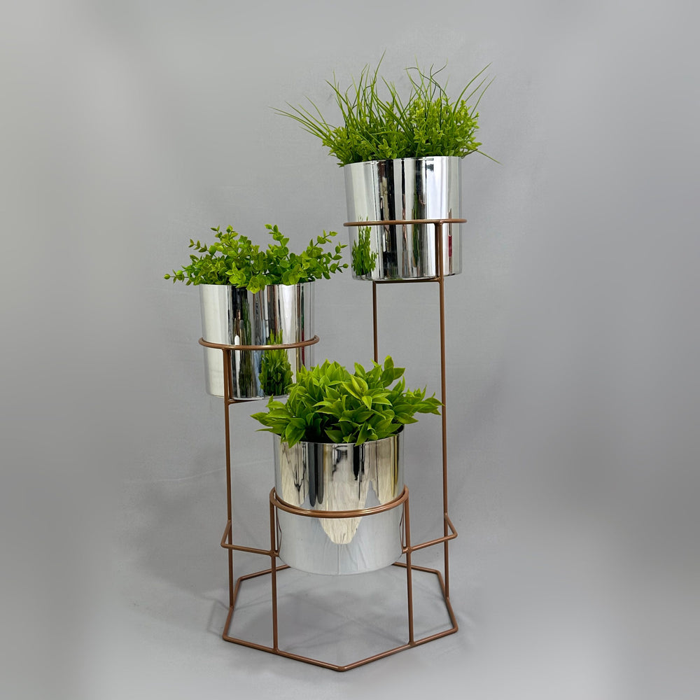 La base mide 70 cm de alto, La base es de varilla de acero con acabado en pintura electroestática. Materos en plastico de 20 cm de diametro por 20 cm de alto Incluye Base y Tres materos.