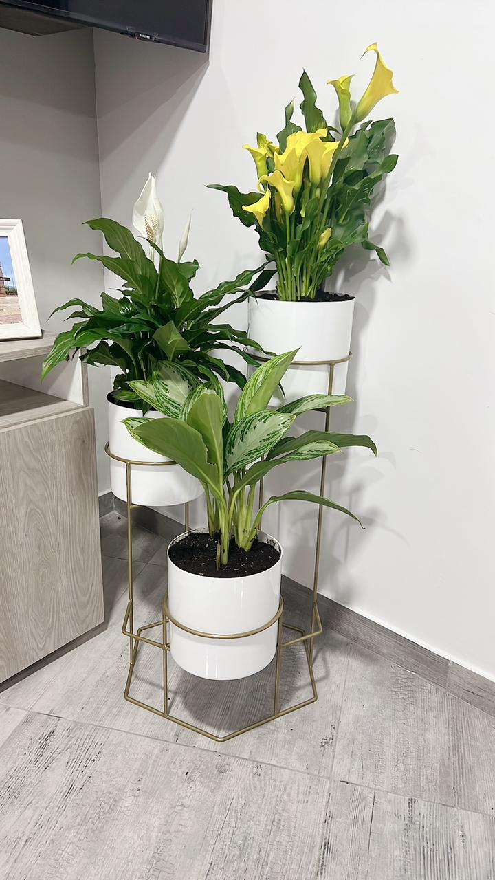 La base mide 70 cm de alto, La base es de varilla de acero con acabado en pintura electroestática. Materos en plastico de 20 cm de diametro por 20 cm de alto Incluye Base y Tres materos.