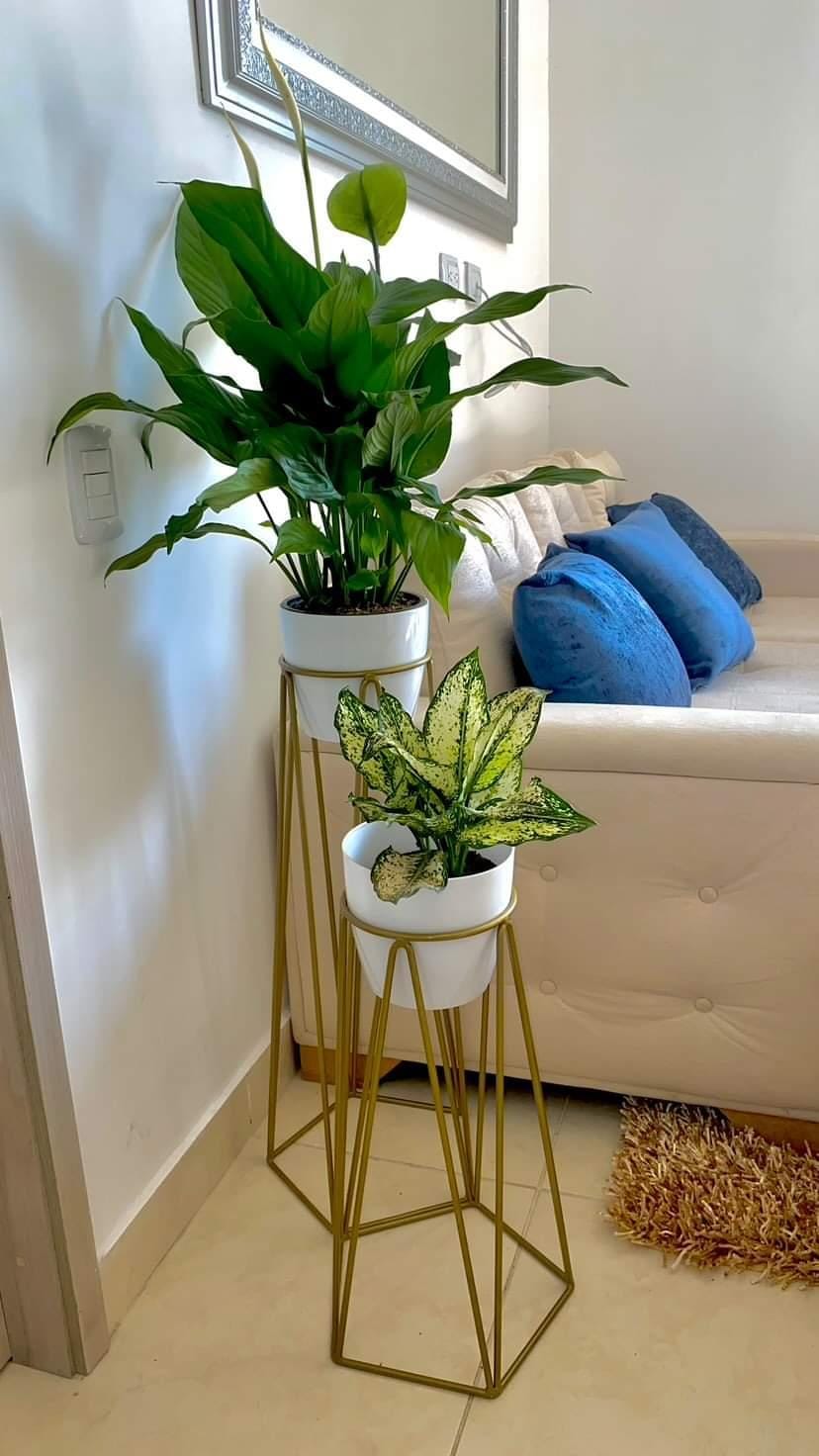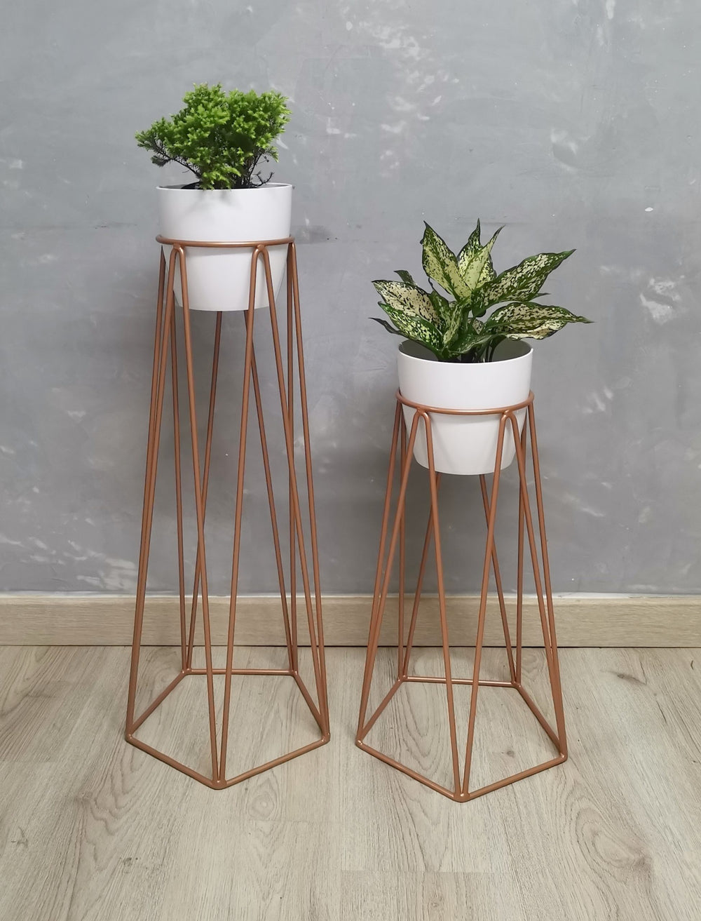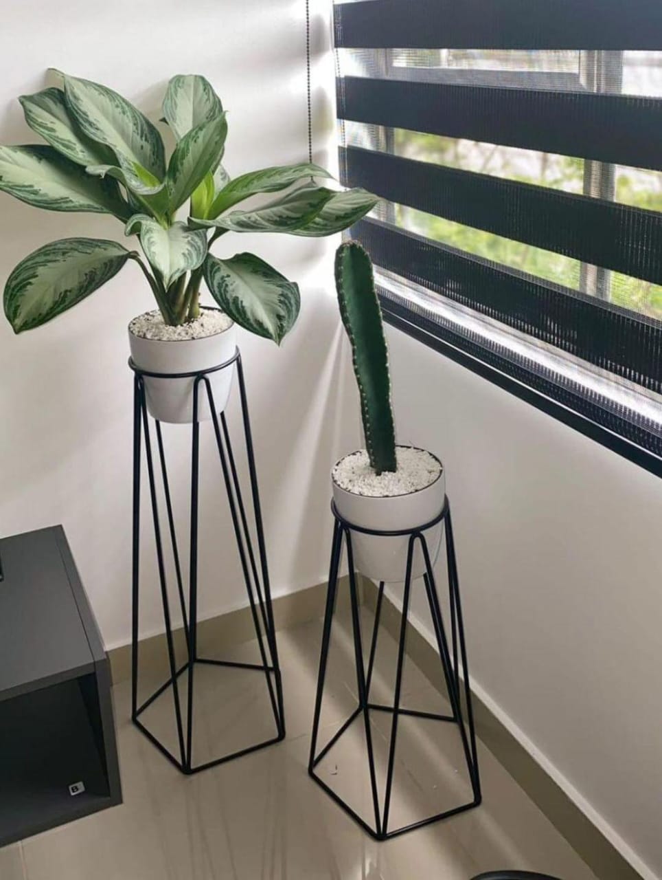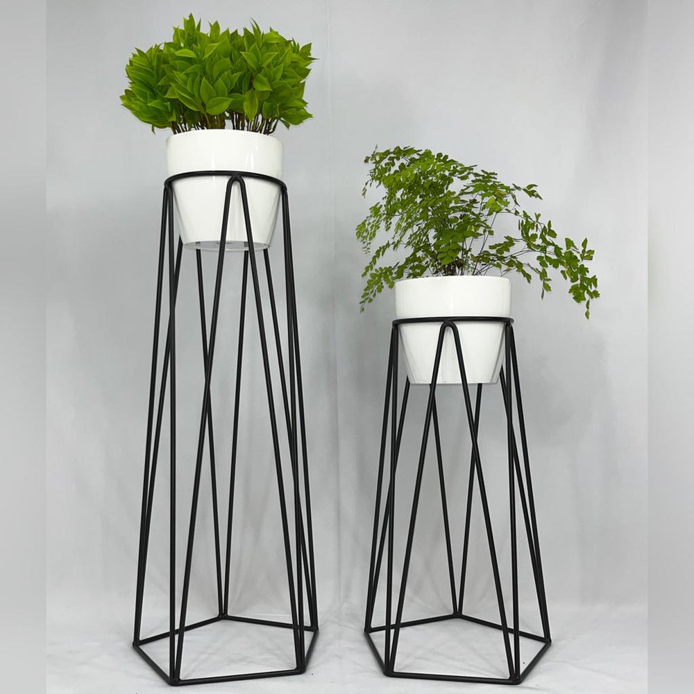 Las bases miden 70 y 50 cm de alto, Las bases son de varilla de acero con acabado en pintura electroestática. Los materos de plastico son de 17 cm de diámetro y 15 cm de alto.                   Incluye dos bases y dos materos.