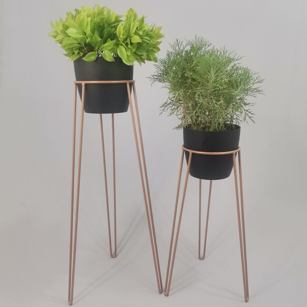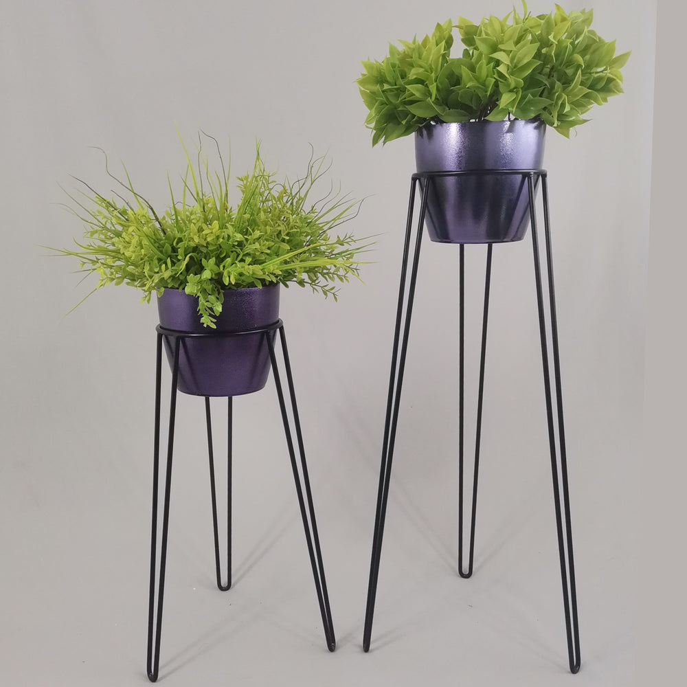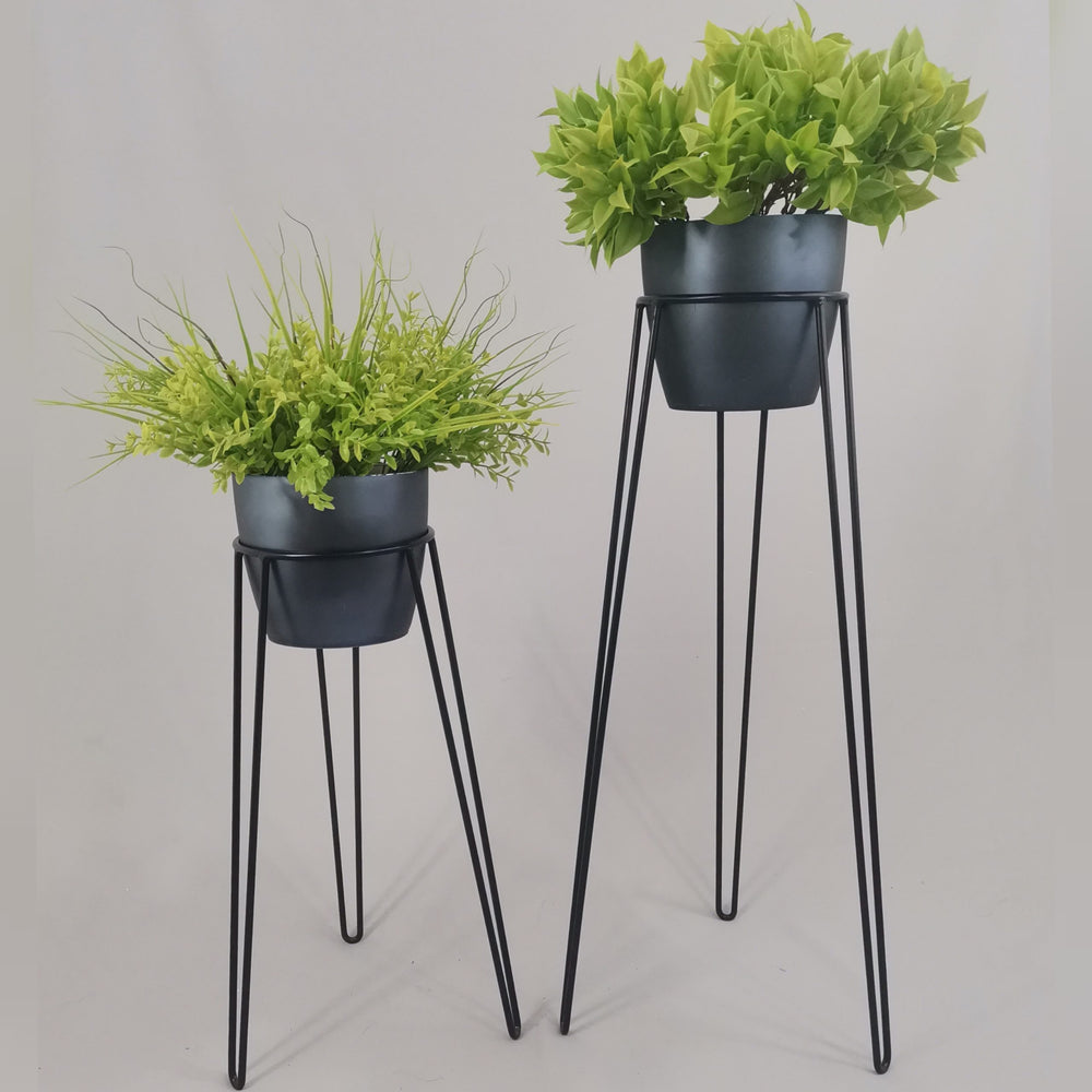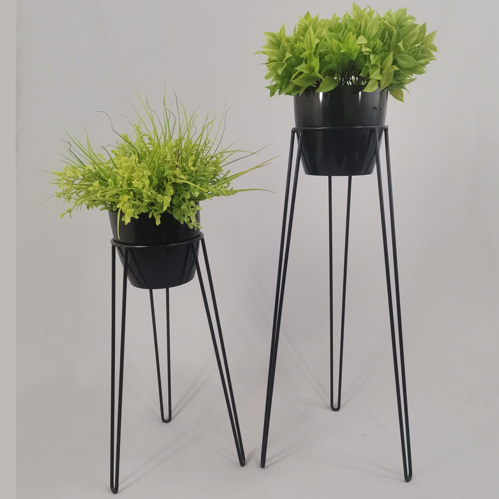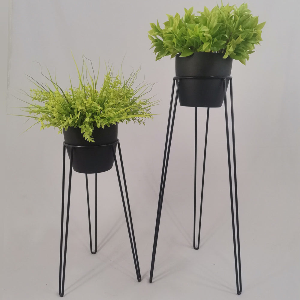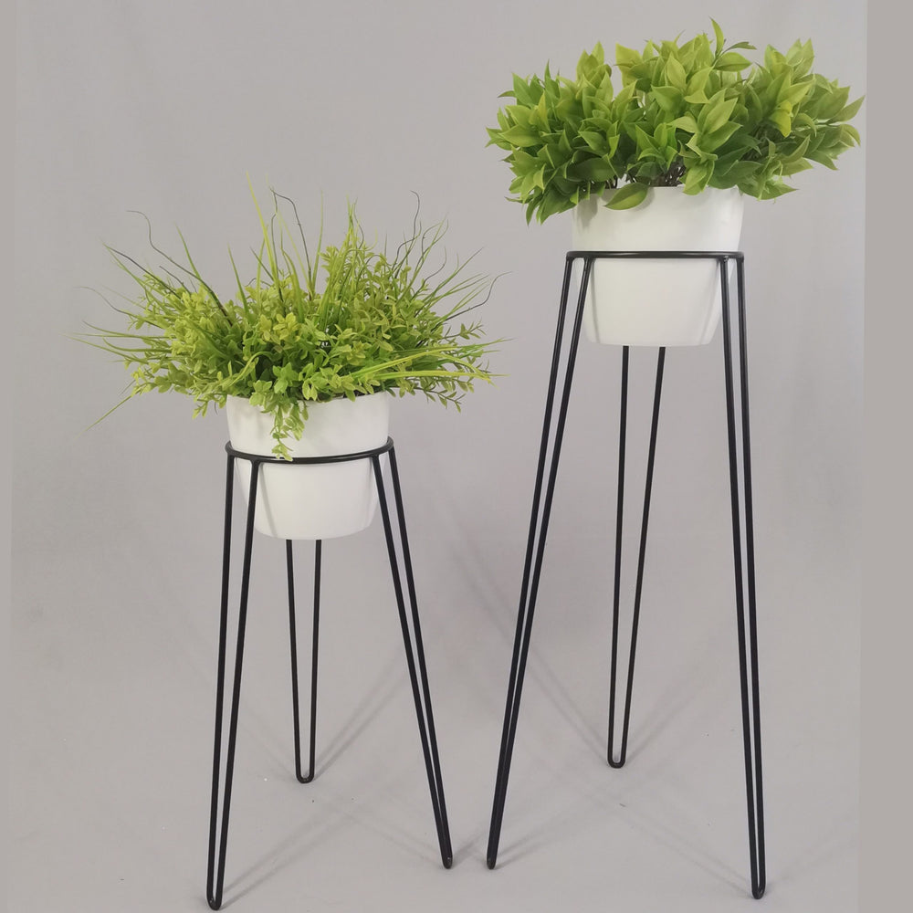 Las bases miden 70 y 50 cm de alto, Las bases son de varilla de acero con acabado en pintura electroestática. Los materos de plastico son de 17 cm de diámetro y 15 cm de alto. Incluye dos Bases y dos Materos