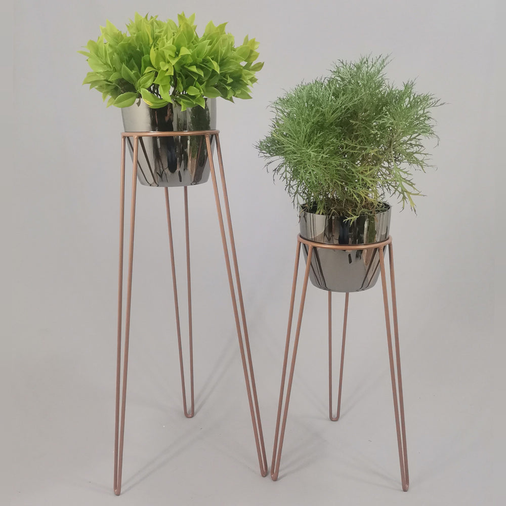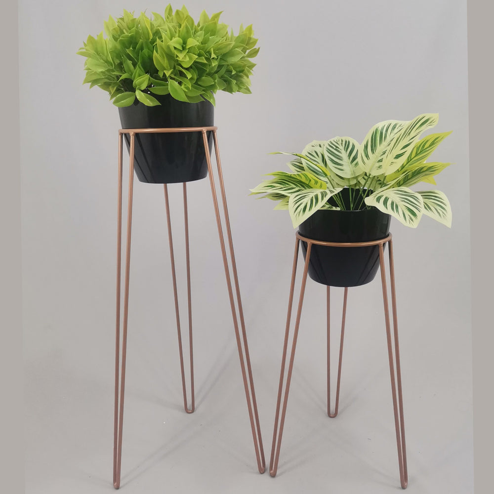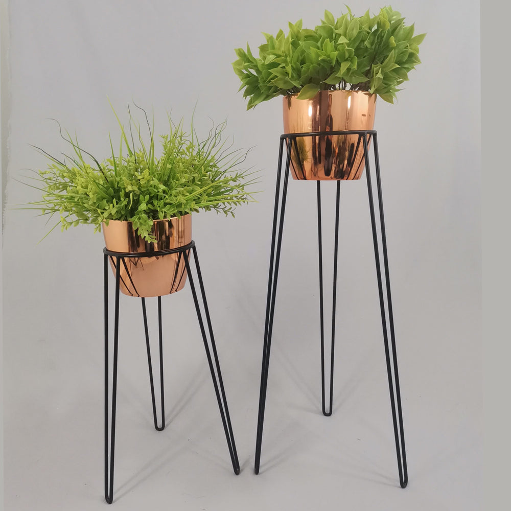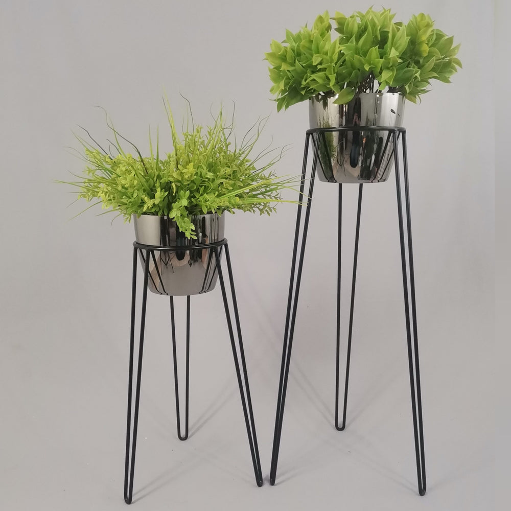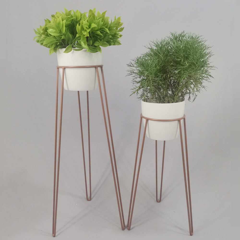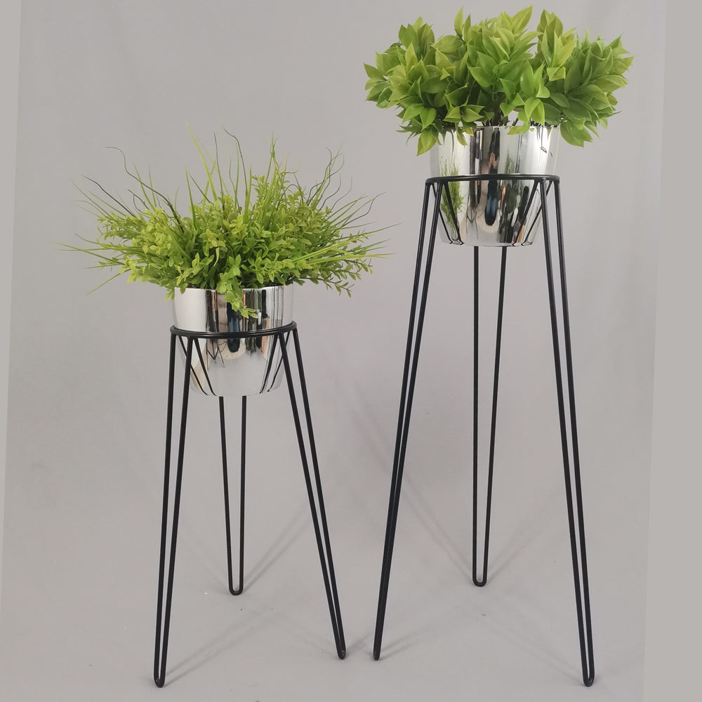 Las bases miden 70 y 50 cm de alto, Las bases son de varilla de acero con acabado en pintura electroestática. Los materos de plastico son de 17 cm de diámetro y 15 cm de alto. Incluye dos Bases y dos Materos