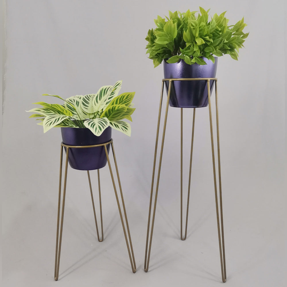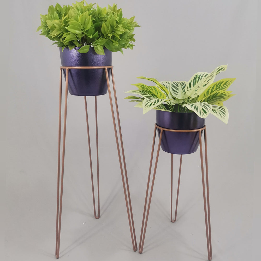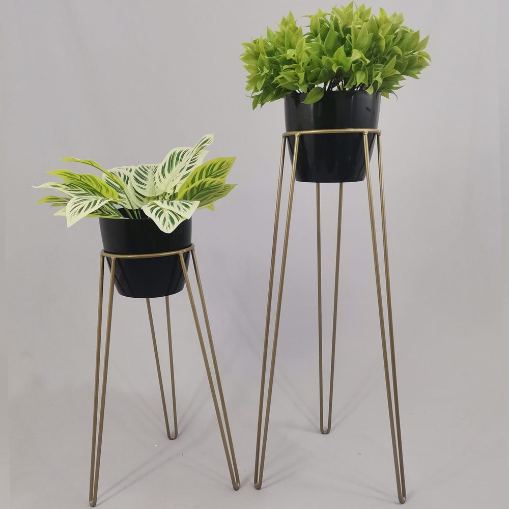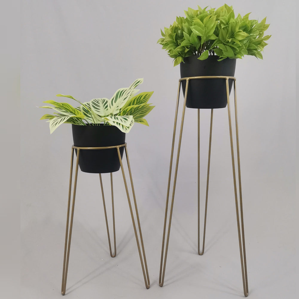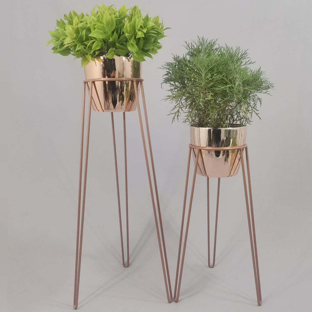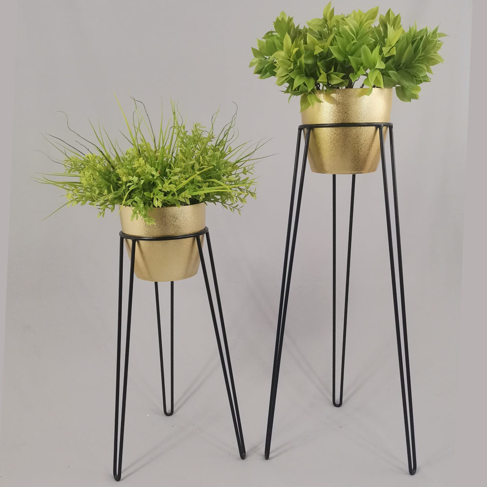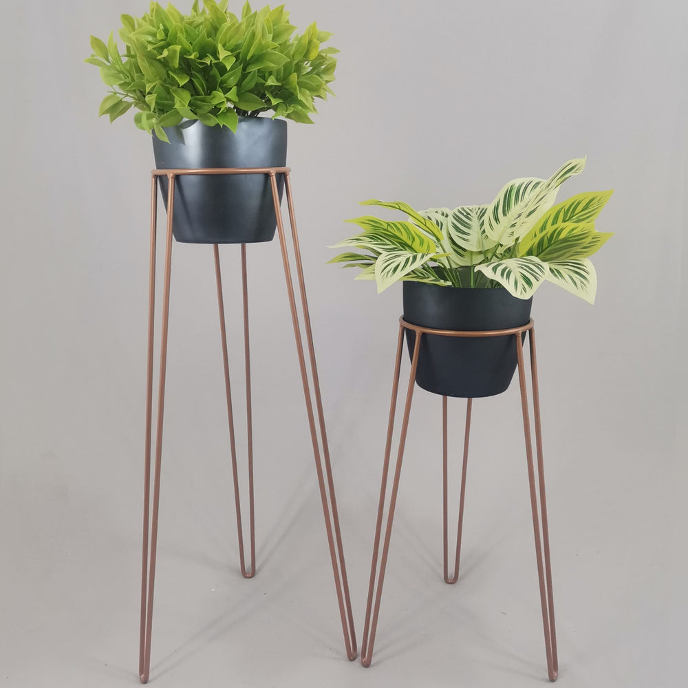 Las bases miden 70 y 50 cm de alto, Las bases son de varilla de acero con acabado en pintura electroestática. Los materos de plastico son de 17 cm de diámetro y 15 cm de alto. Incluye dos Bases y dos Materos