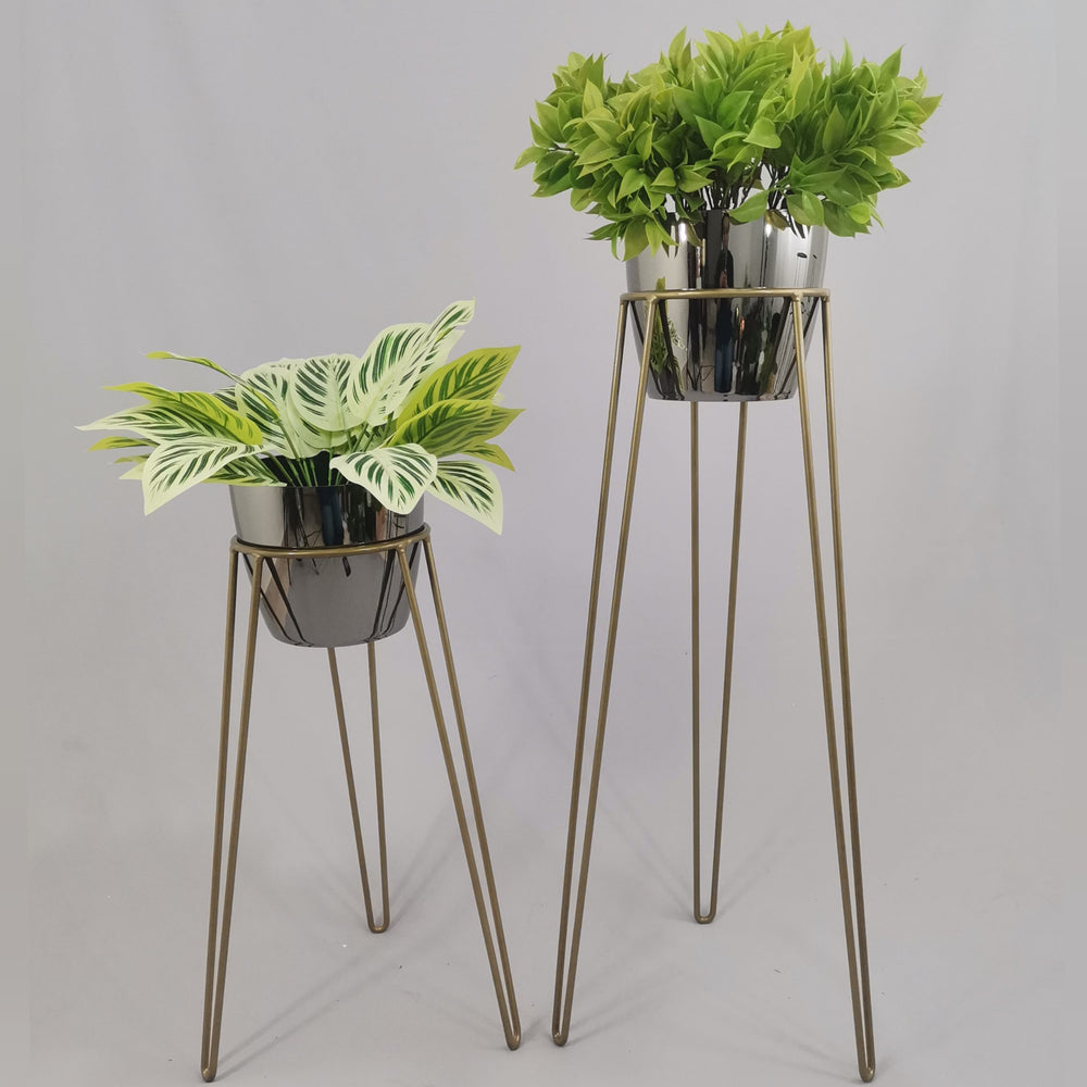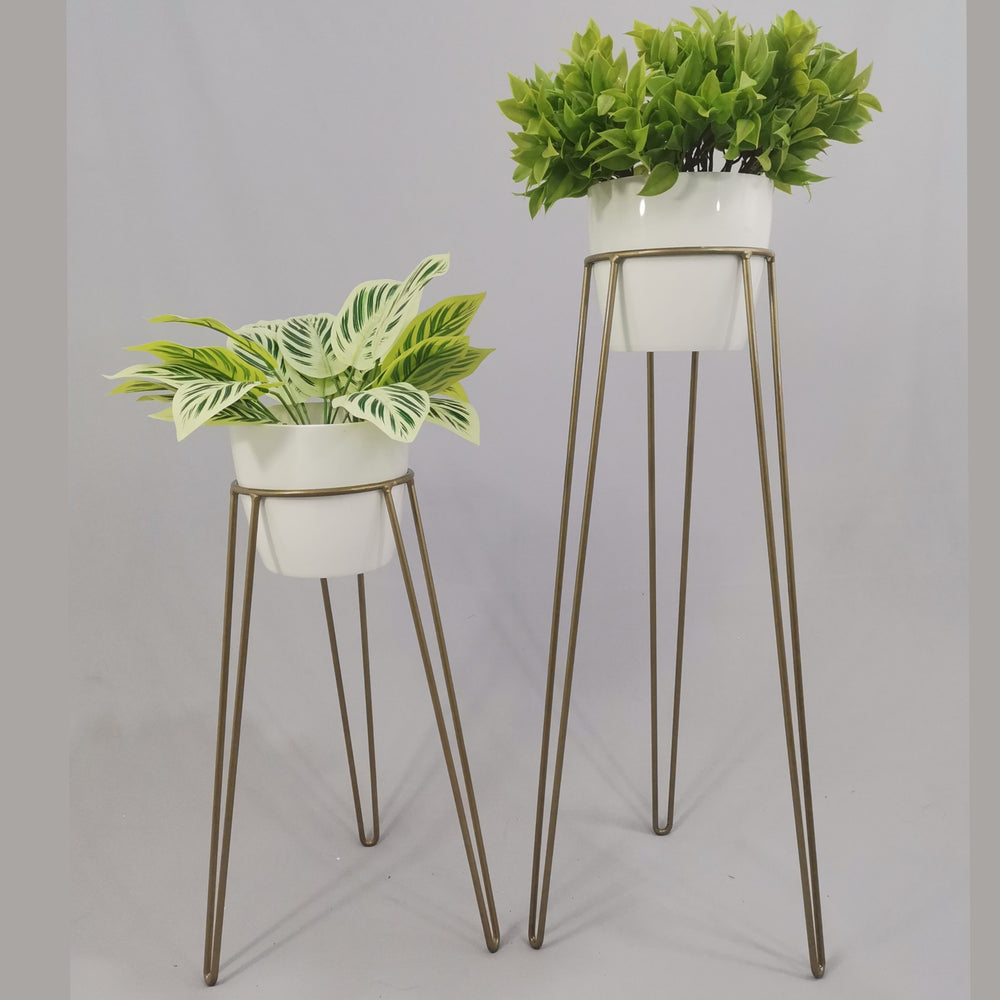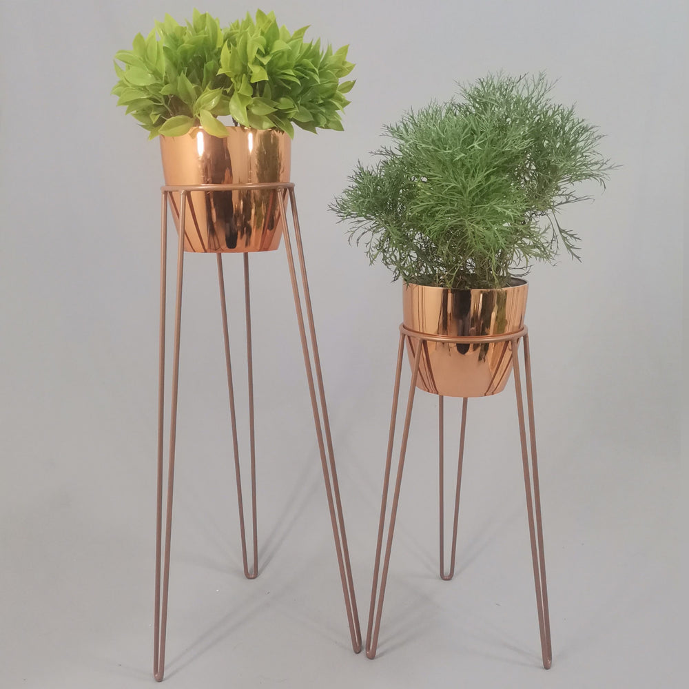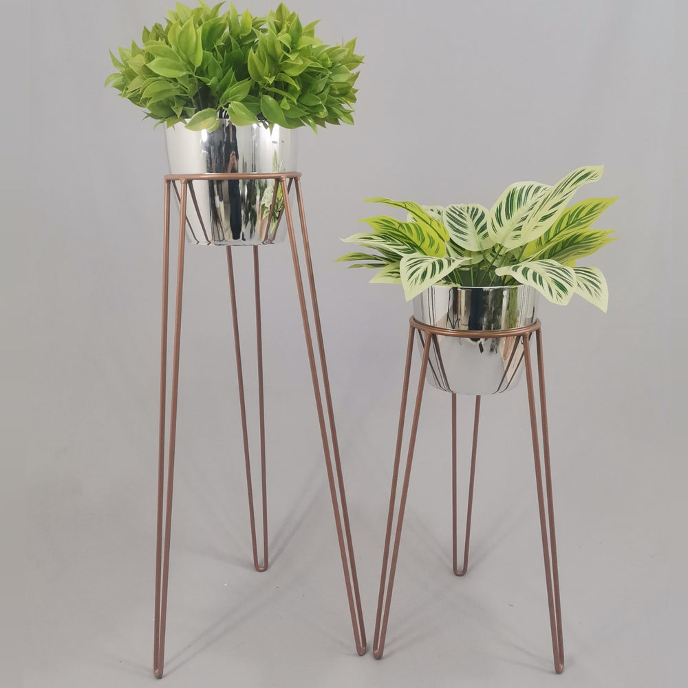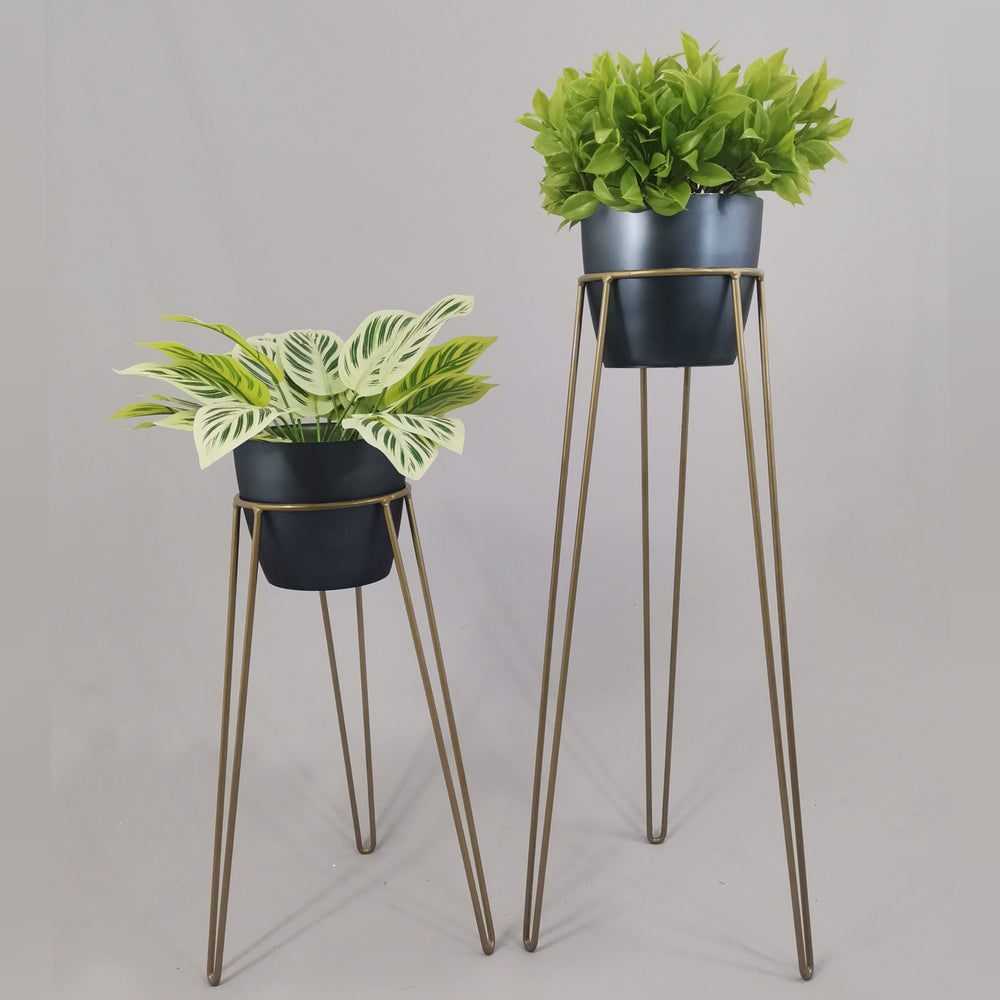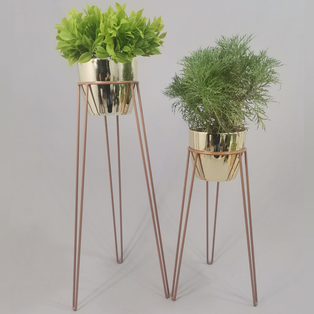 Las bases miden 70 y 50 cm de alto, Las bases son de varilla de acero con acabado en pintura electroestática. Los materos de plastico son de 17 cm de diámetro y 15 cm de alto. Incluye dos Bases y dos Materos