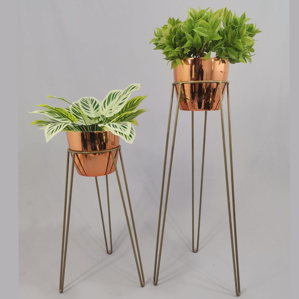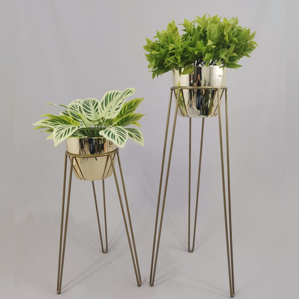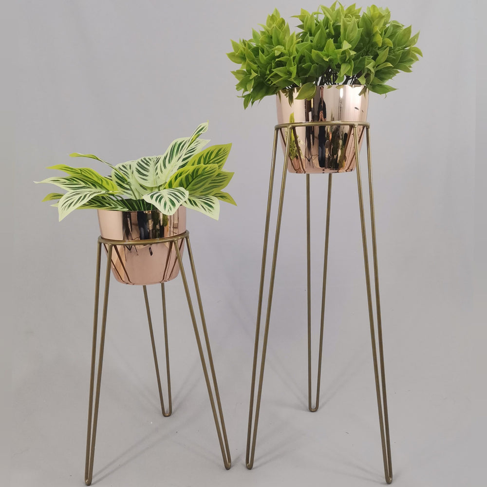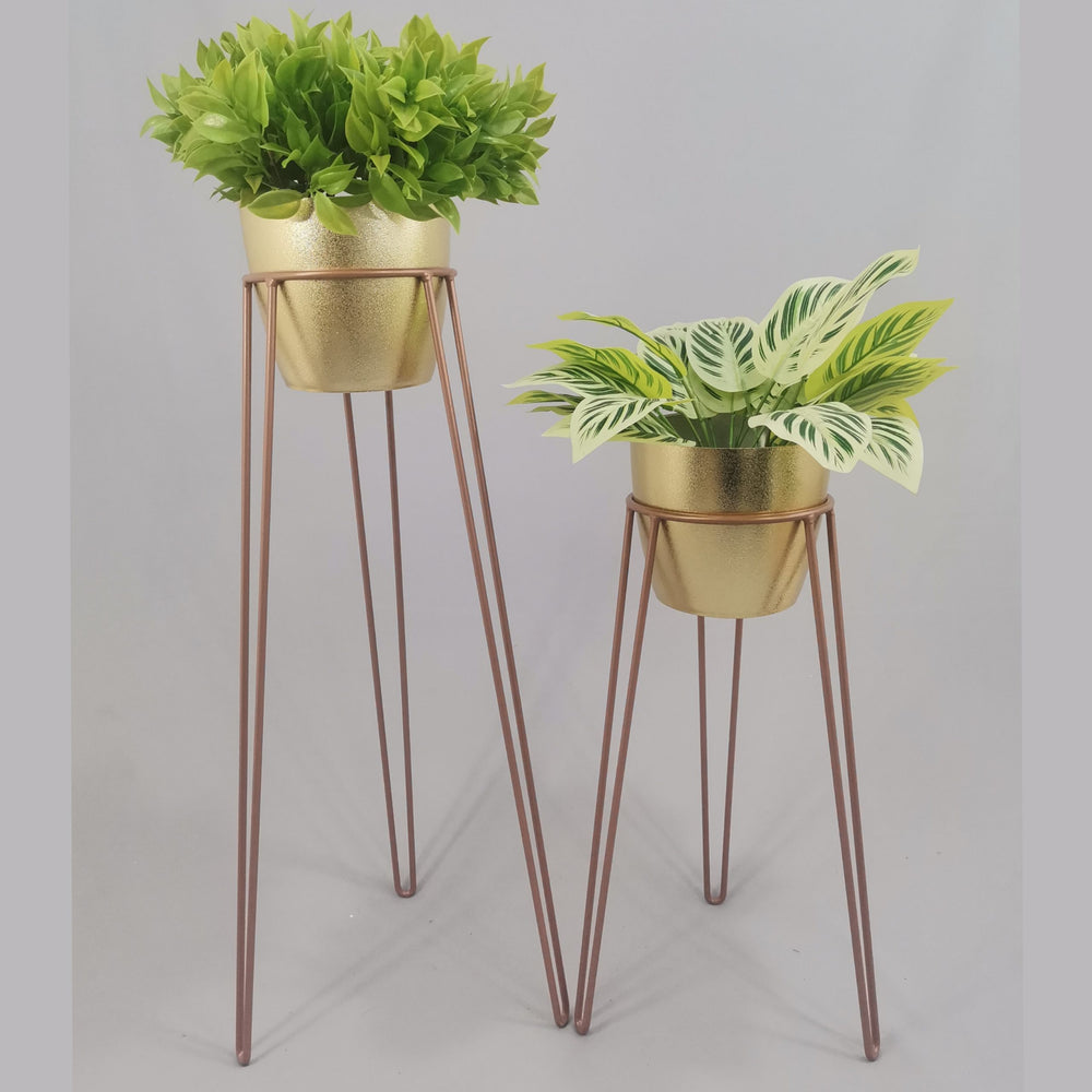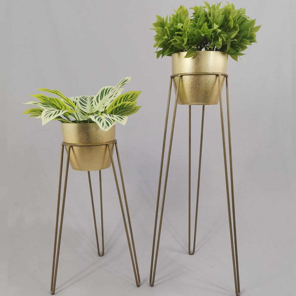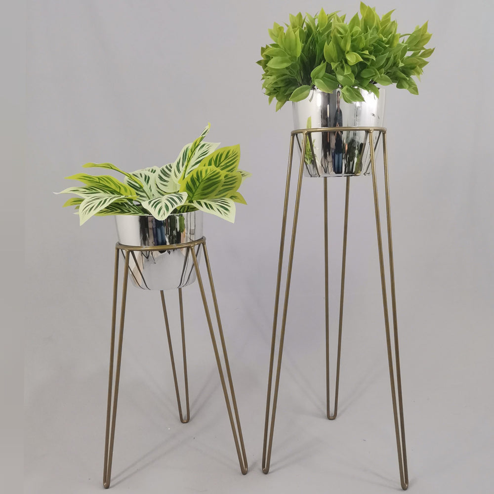 Las bases miden 70 y 50 cm de alto, Las bases son de varilla de acero con acabado en pintura electroestática. Los materos de plastico son de 17 cm de diámetro y 15 cm de alto. Incluye dos Bases y dos Materos