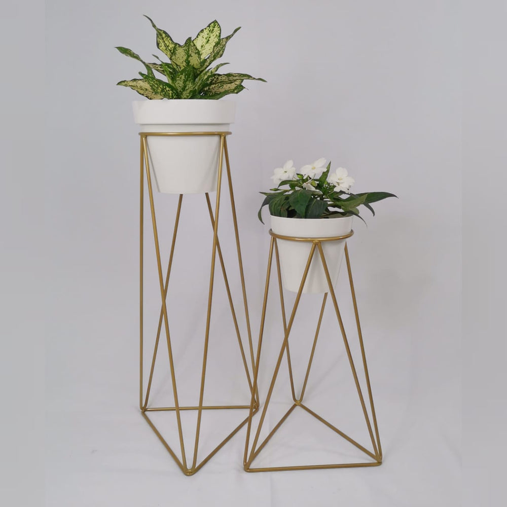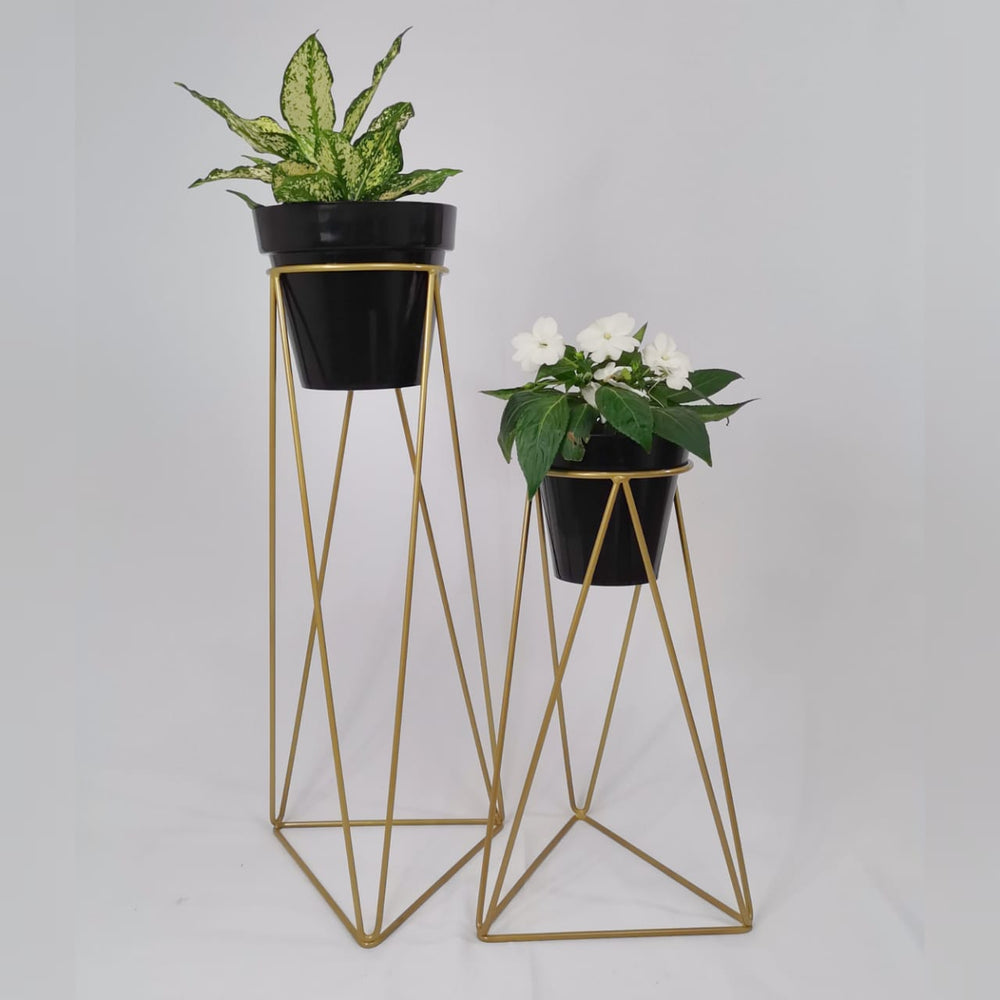 Bases de 70 y 50 cm de alto en varilla de acero con acabado en pintura electroestatica Materos de 22 y 18 cm de diametro por 22 y 18 cm de alto en plastico.   Incluye dos bases y dos materos , sin plantas.
