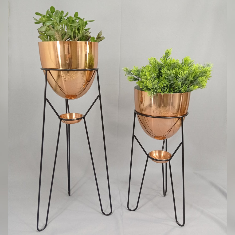 Las bases miden 70 y 50 cm de alto. Los materos son de 25 cm de diámetro. Base de varilla de acero con acabado en pintura electroestatica. Esferas y platos de aluminio