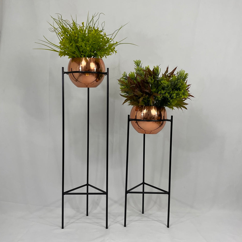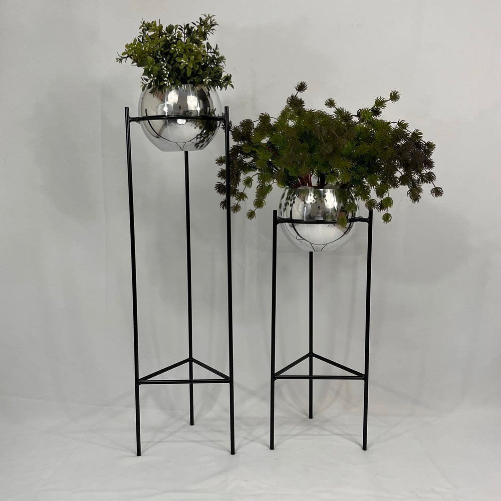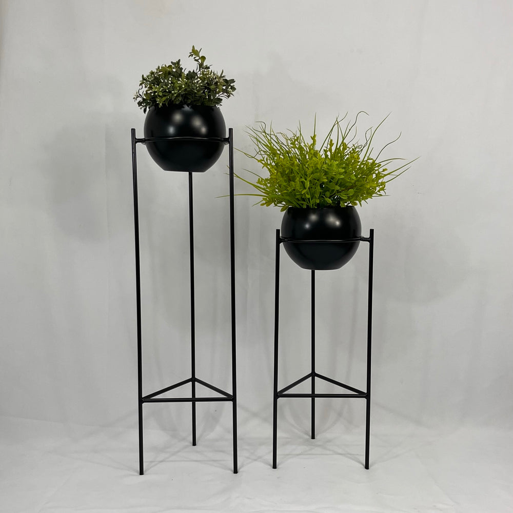 Las bases miden 70 y 50 cm de alto, acabado en pintura electroestatica. Los materos en forma de esfera son de aluminio, miden 16.5 cm de diametro por 12 cm de alto.    Incluye dos bases y dos materas.   Una vez realizado el pago despacharemos el pedido en los siguientes 3 días hábiles o menos