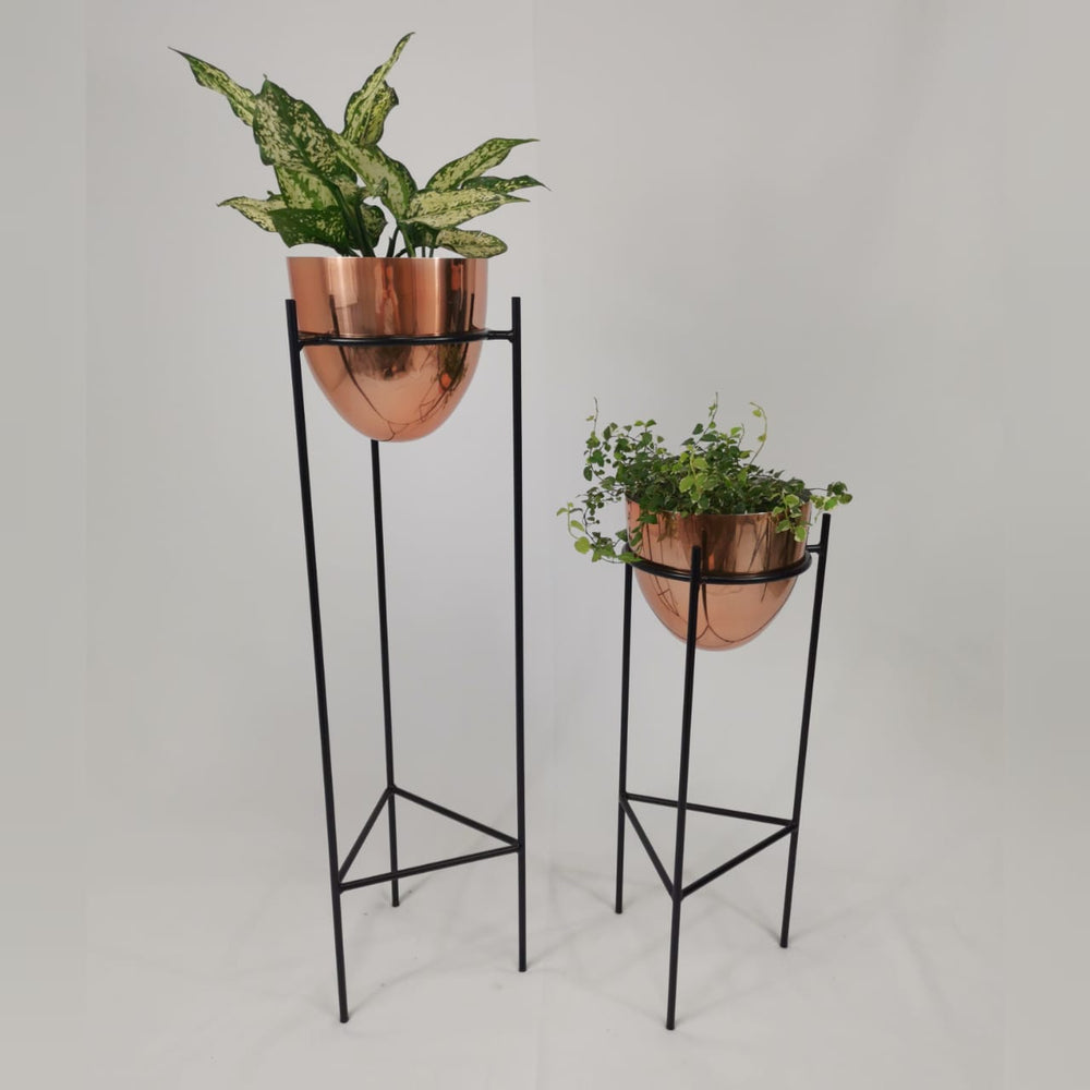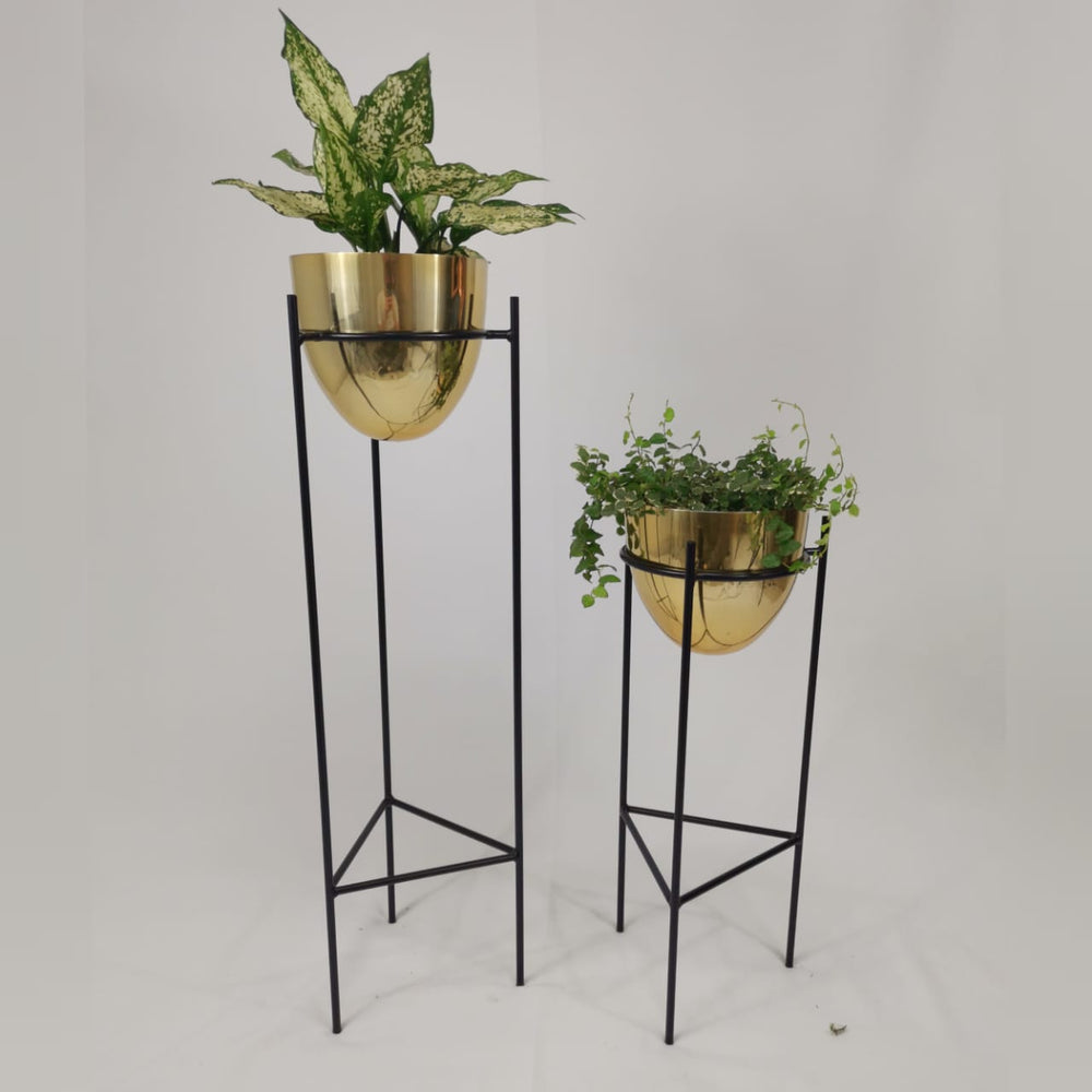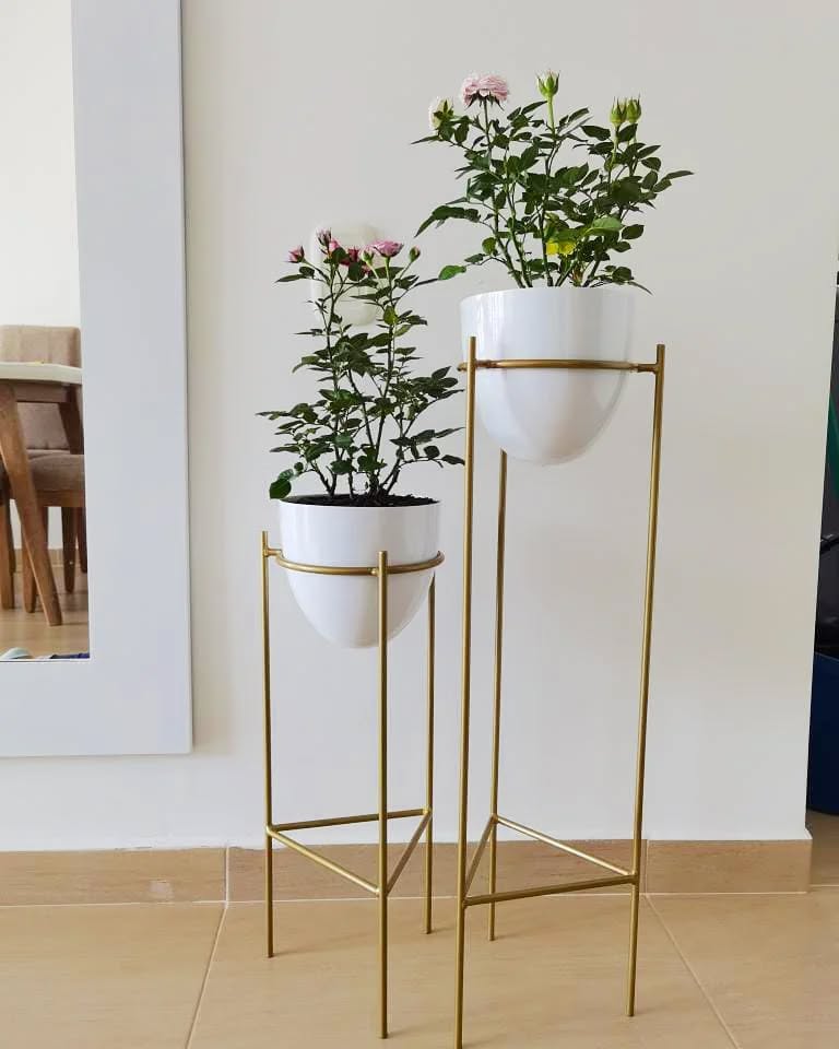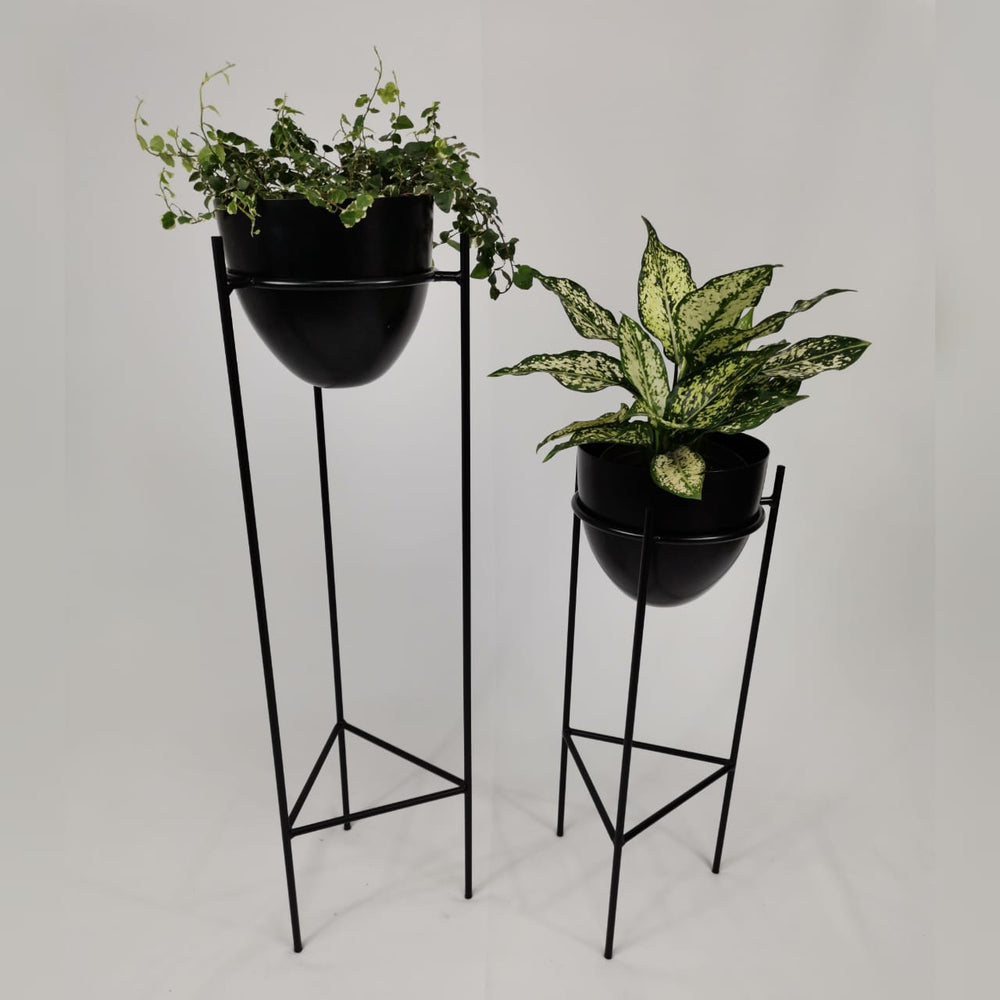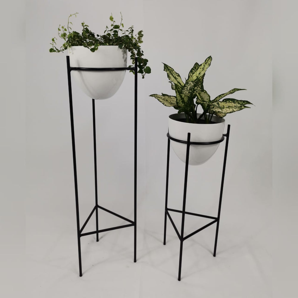 Bases de 70 y 50 cm de alto. Bases de varilla de acero con acabado en pintura electroestatica Materos en aluminio de 18 cm de diametro por 16 cm de alto respectivamente.