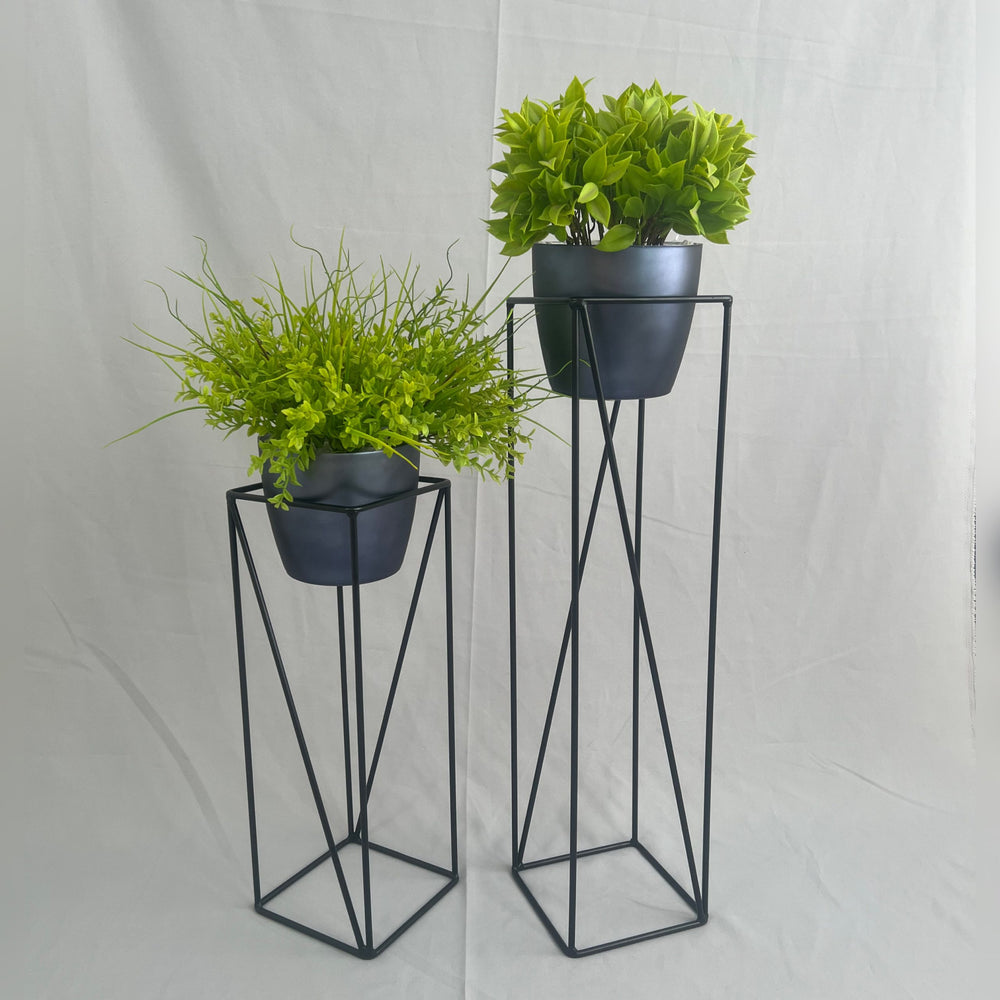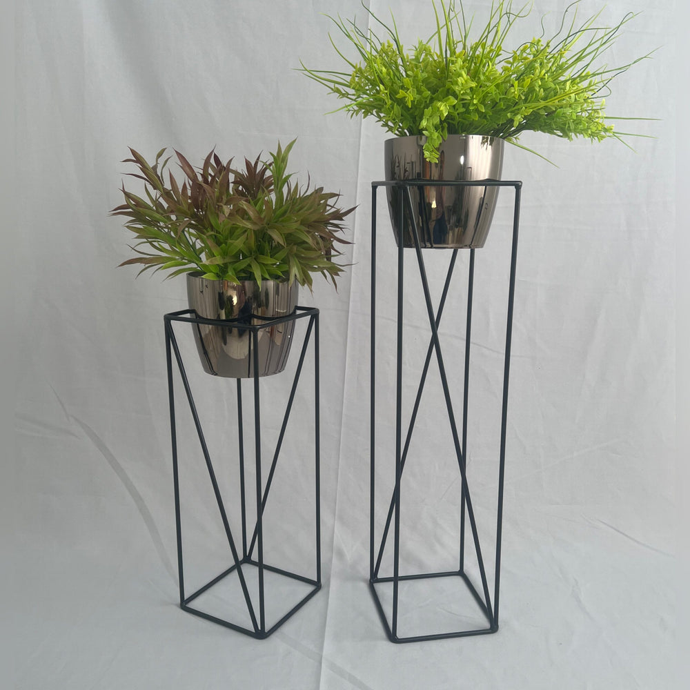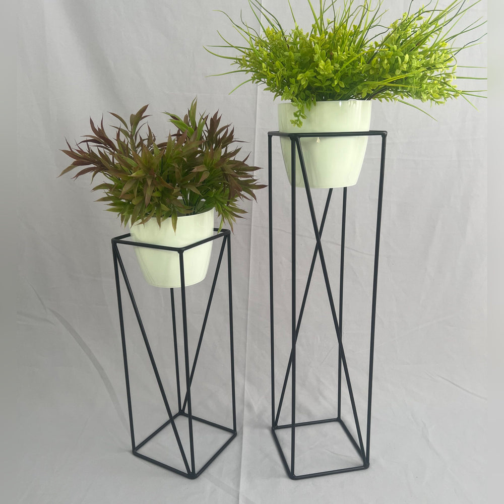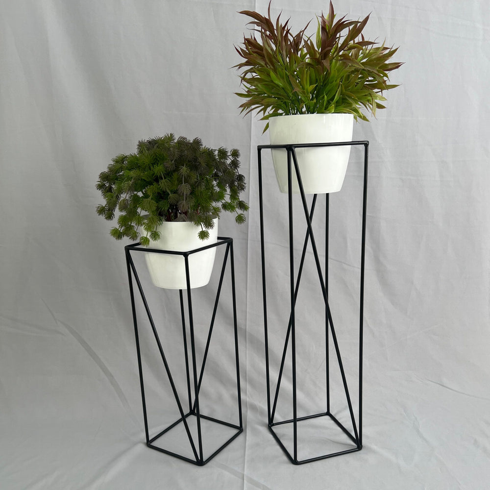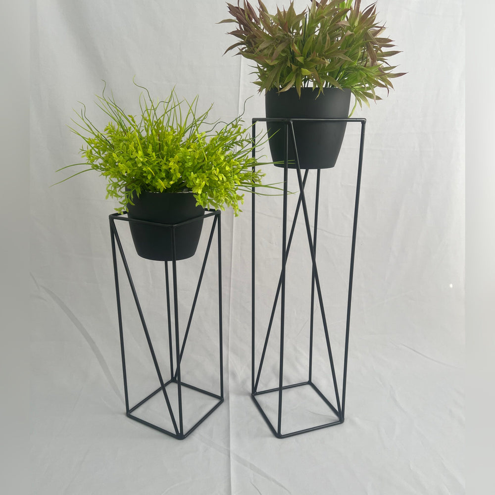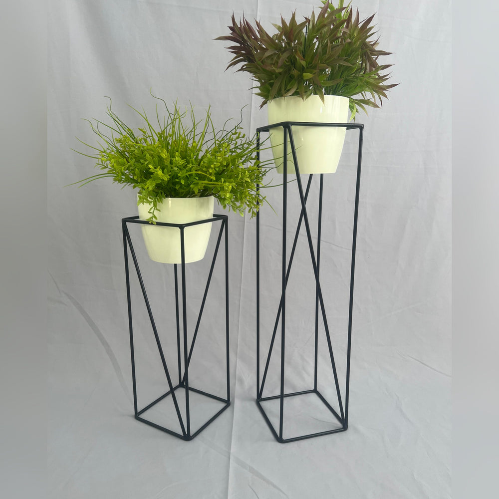 Las bases miden 70 y 50 cm de alto, Las bases son de varilla de acero con acabado en pintura electroestática. Los materos de plastico son de 17 cm de diámetro y 15 cm de alto.