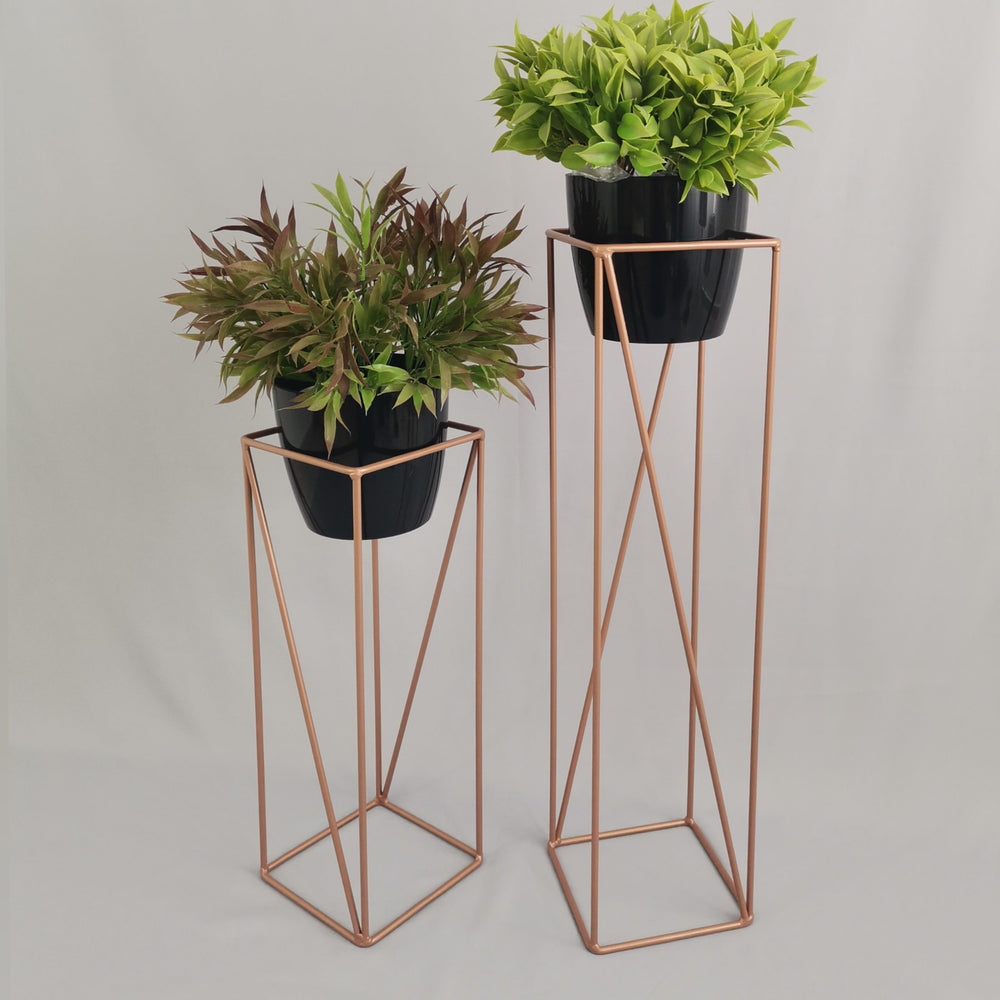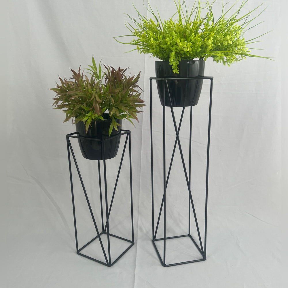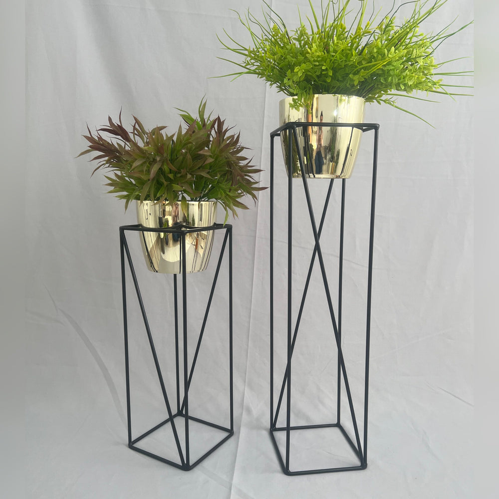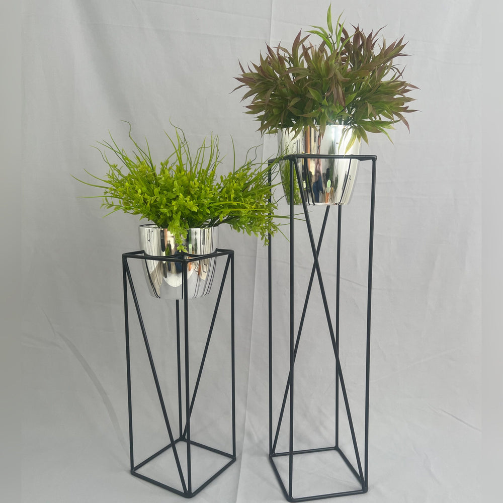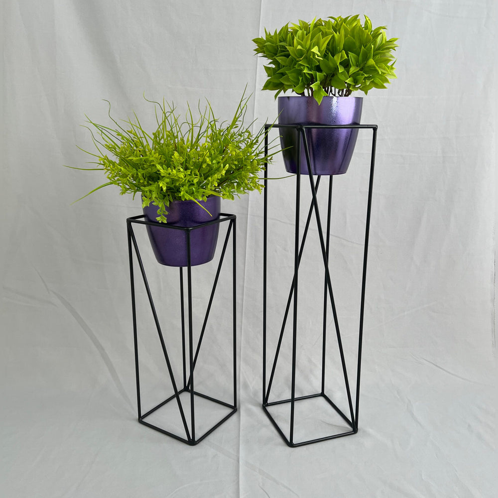 Las bases miden 70 y 50 cm de alto, Las bases son de varilla de acero con acabado en pintura electroestática. Los materos de plastico son de 17 cm de diámetro y 15 cm de alto.