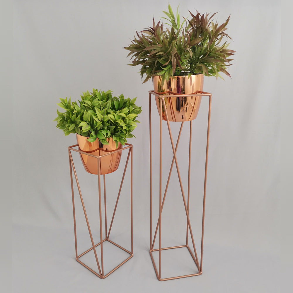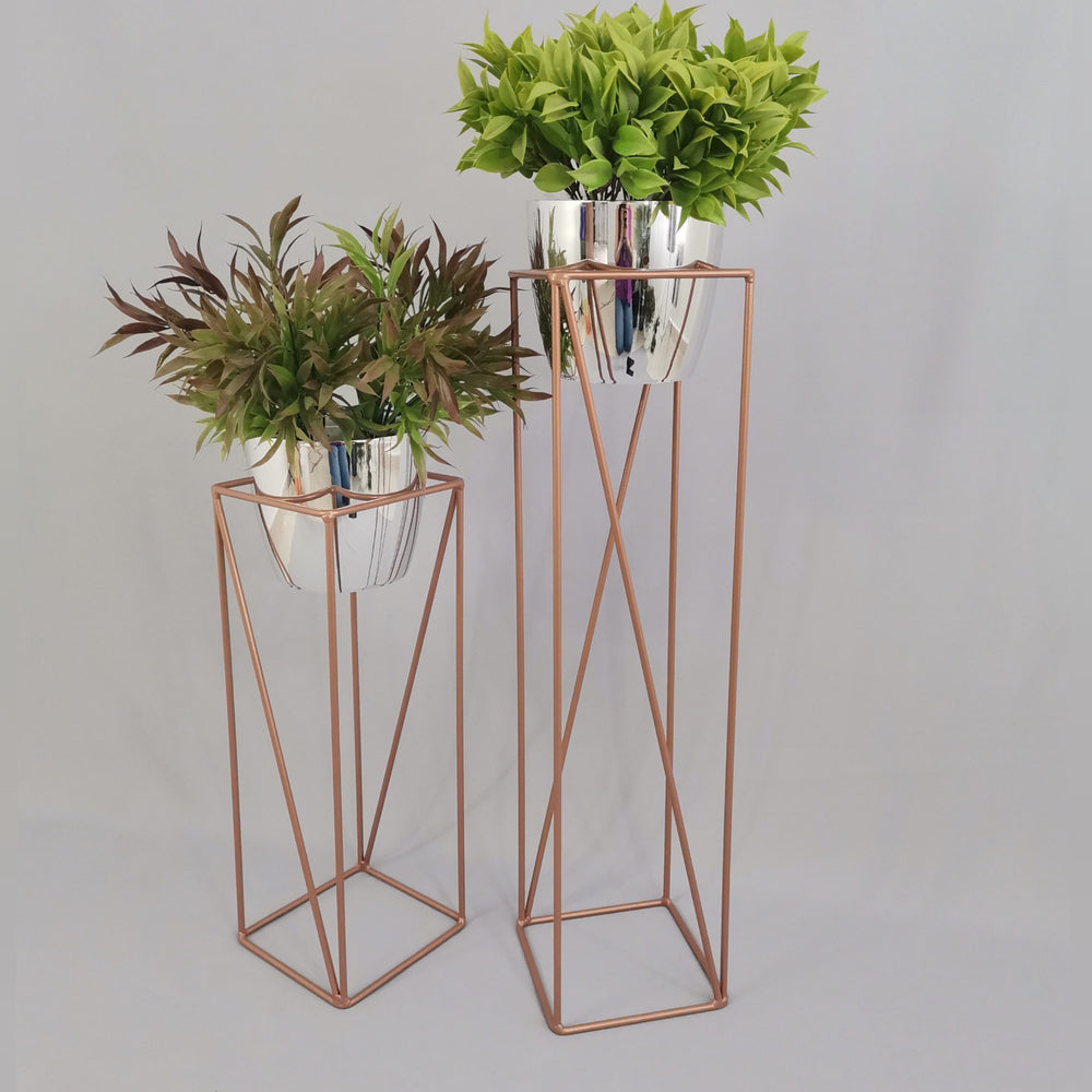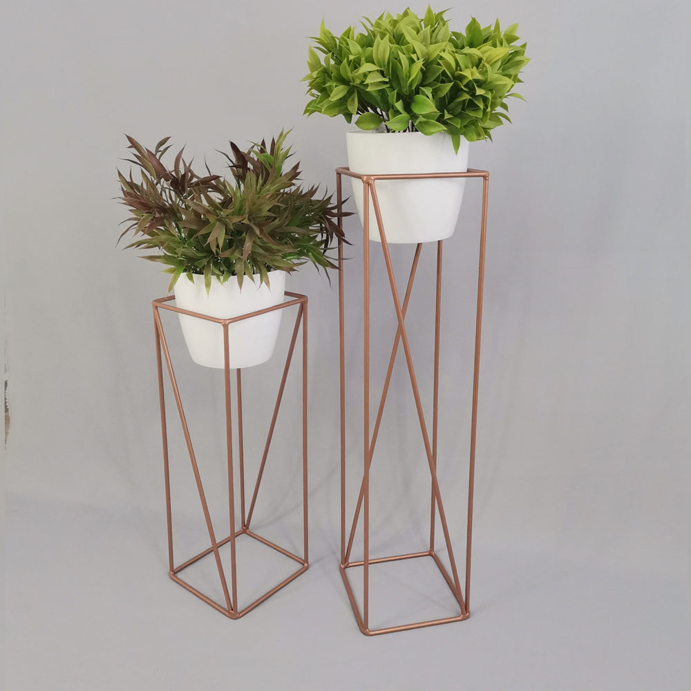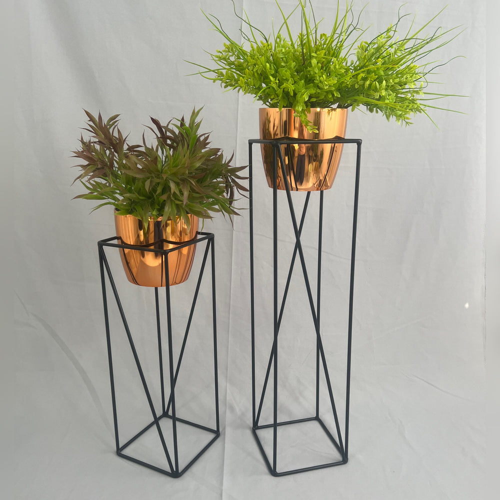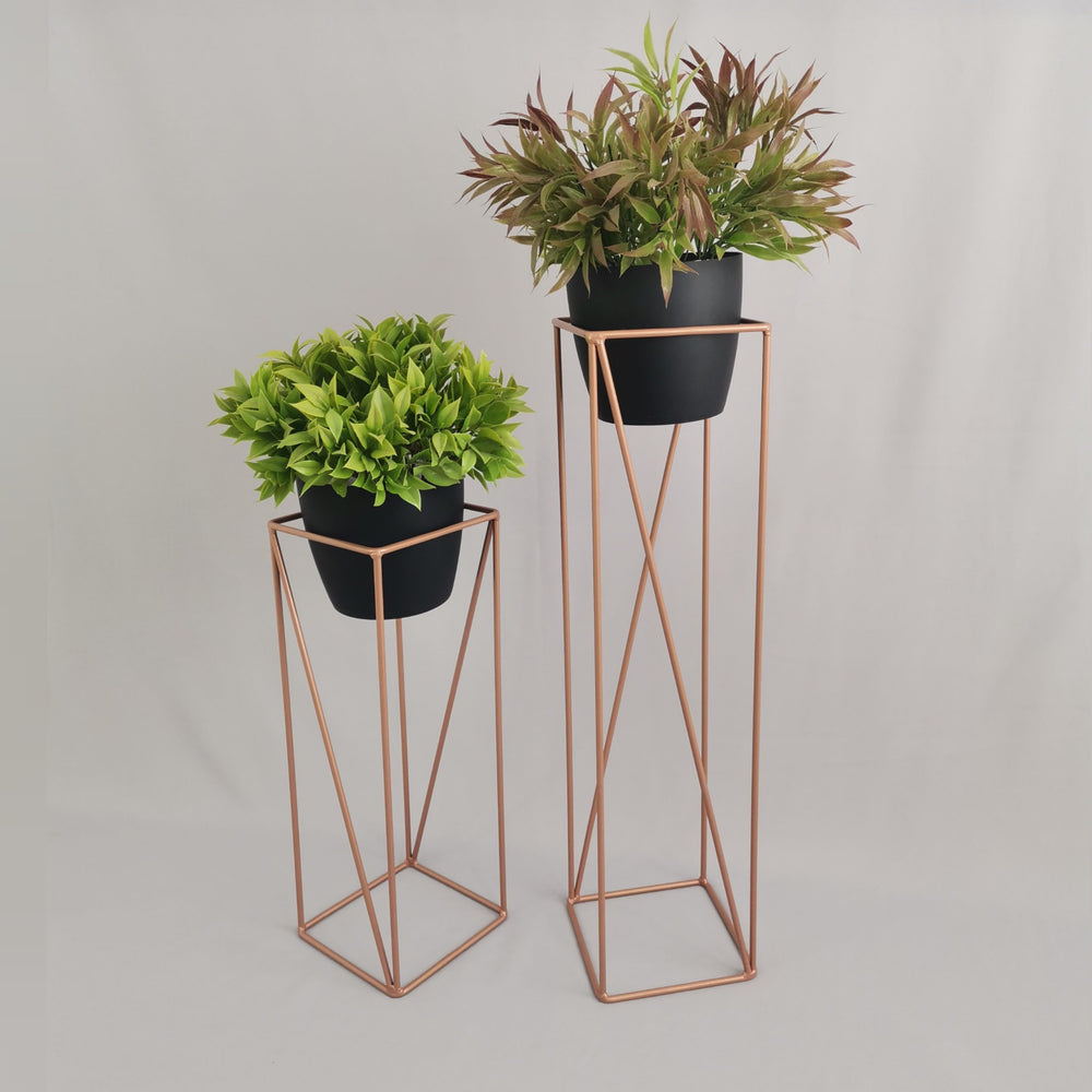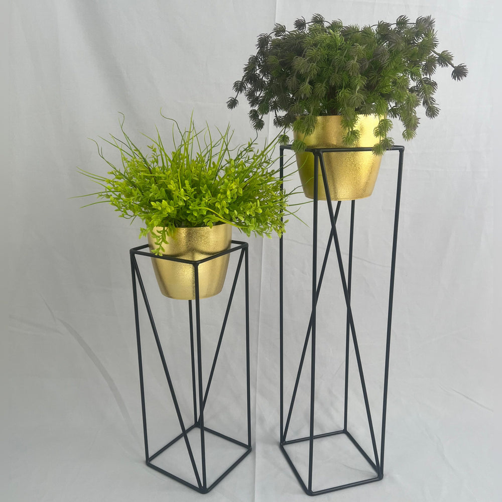 Las bases miden 70 y 50 cm de alto, Las bases son de varilla de acero con acabado en pintura electroestática. Los materos de plastico son de 17 cm de diámetro y 15 cm de alto.