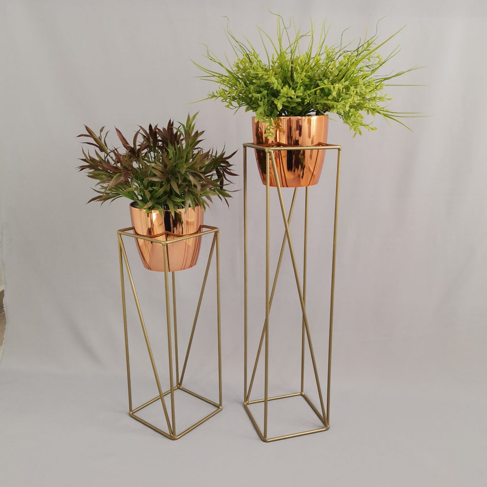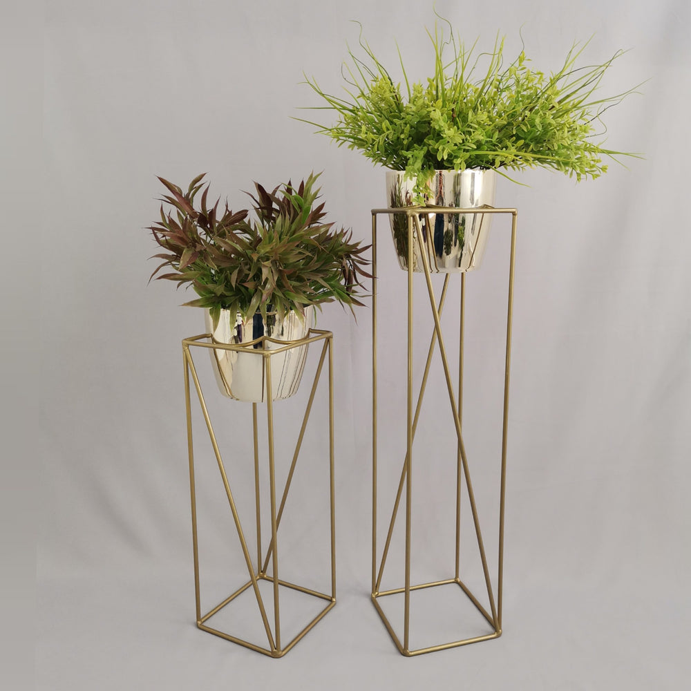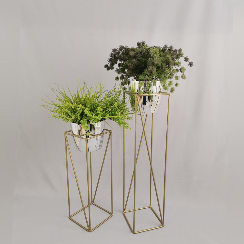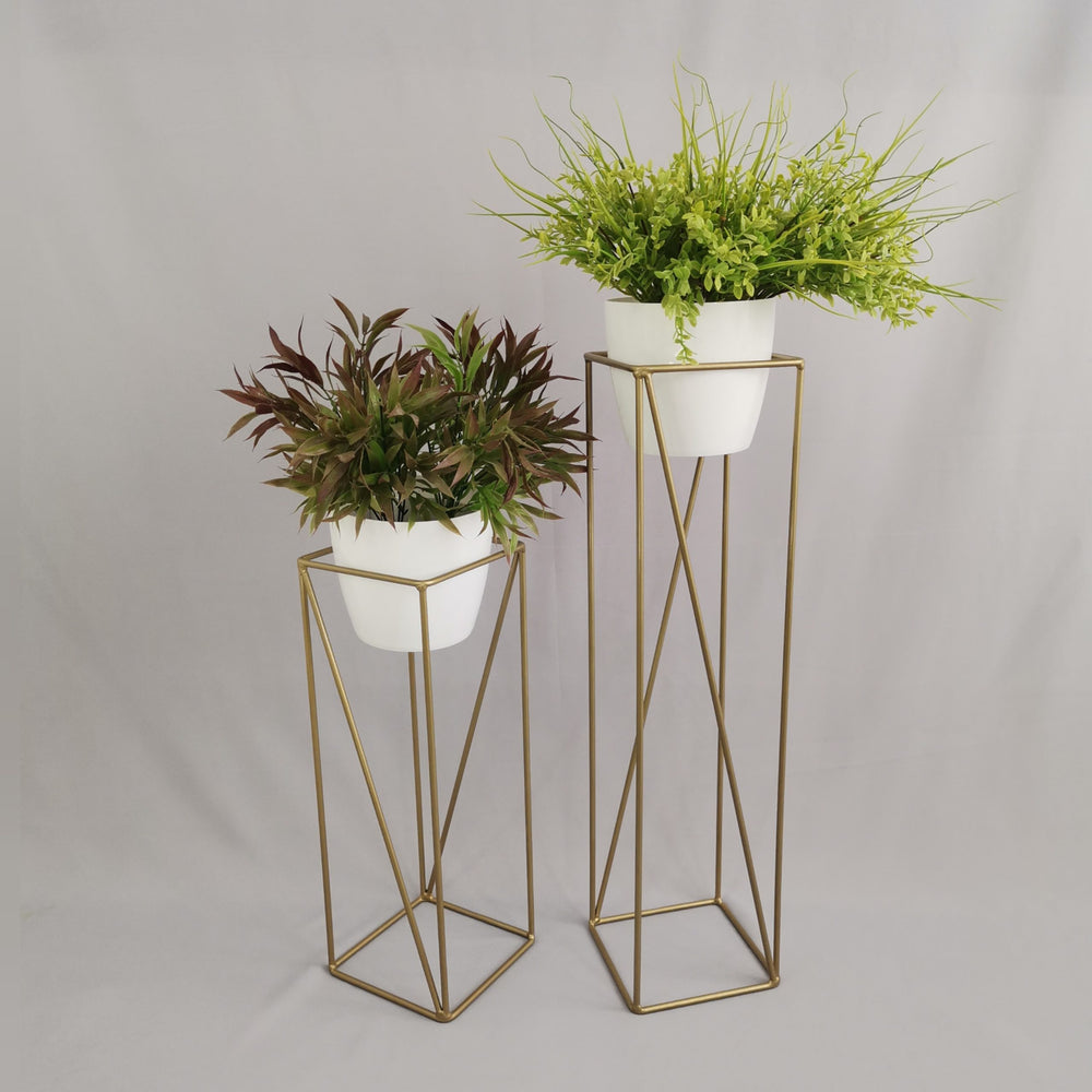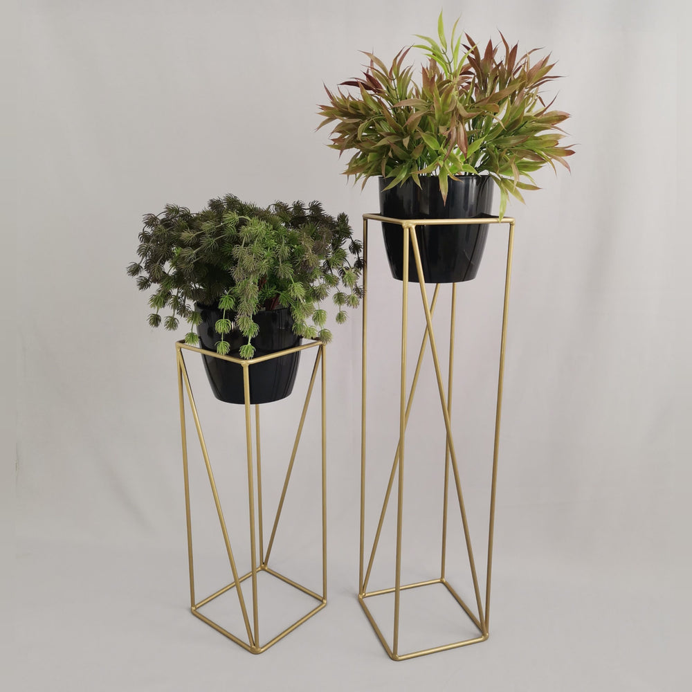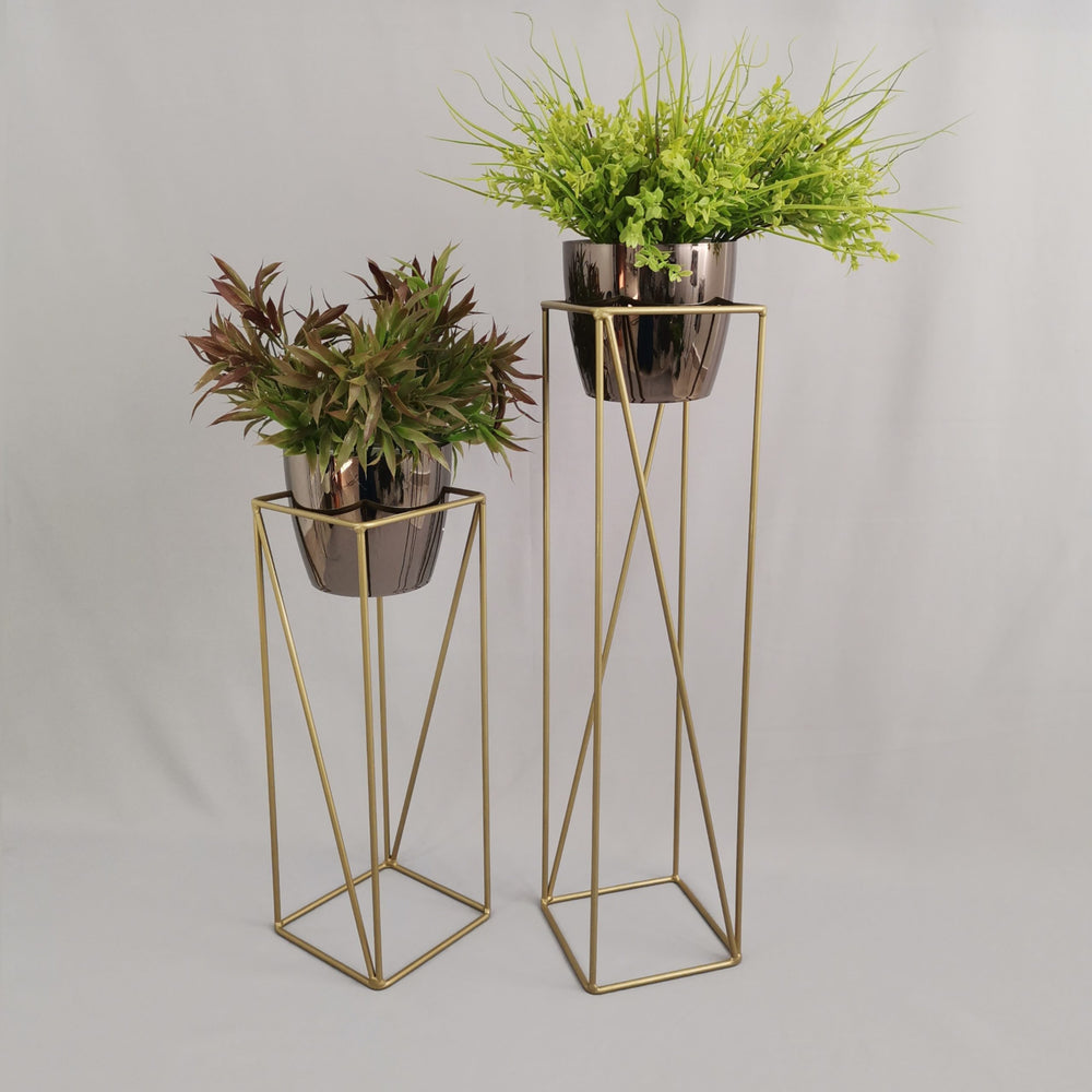 Las bases miden 70 y 50 cm de alto, Las bases son de varilla de acero con acabado en pintura electroestática. Los materos de plastico son de 17 cm de diámetro y 15 cm de alto.