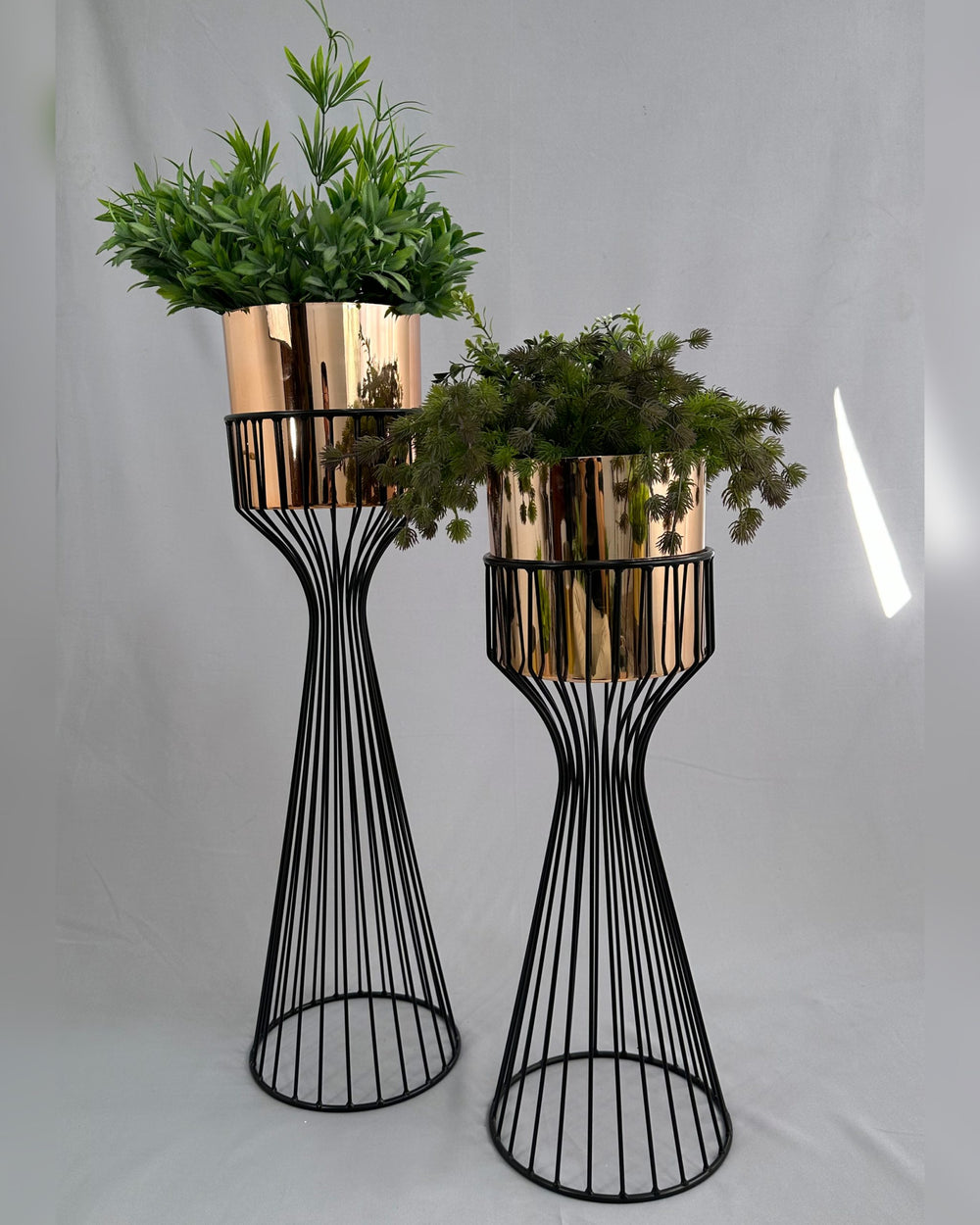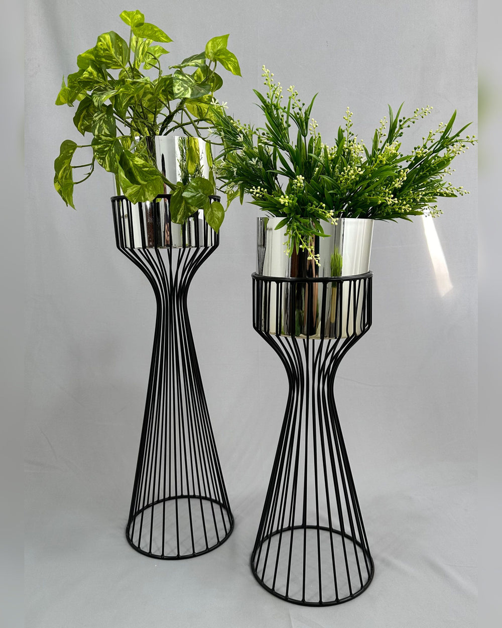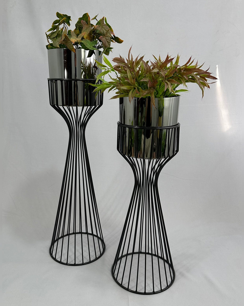 Las bases miden 70 y 50 cm de alto, Las bases son de varilla de acero con acabado en pintura electroestática. Materos en plastico de 20 cm de diametro por 20 cm de alto