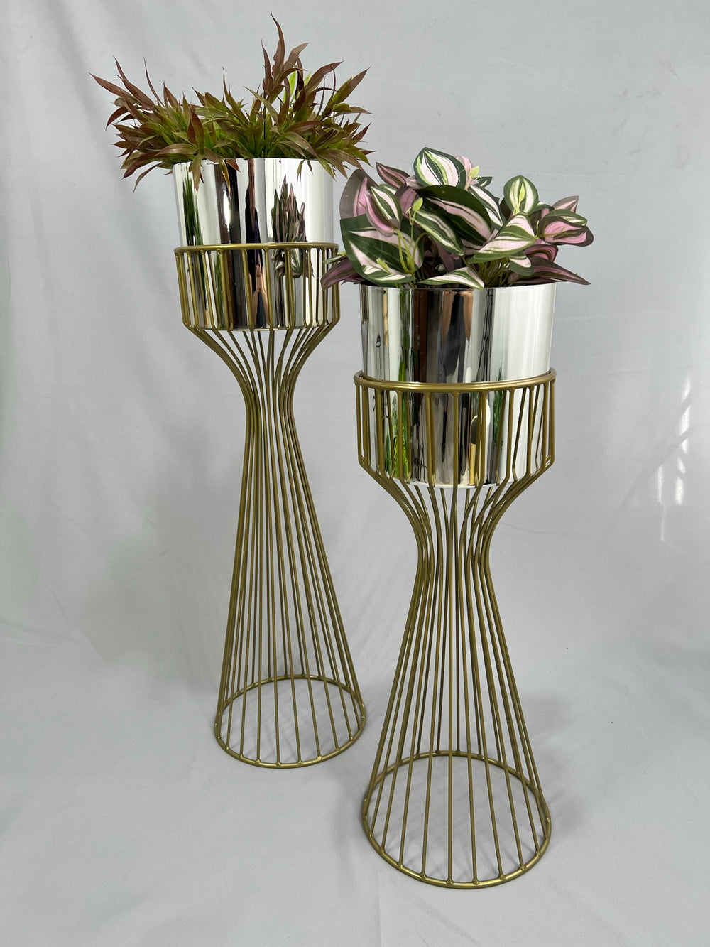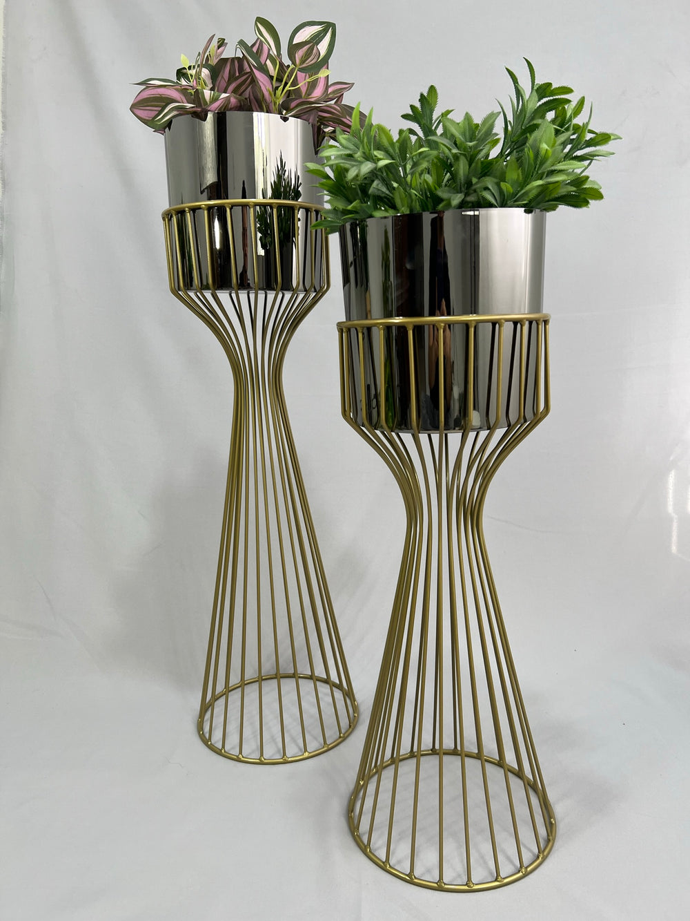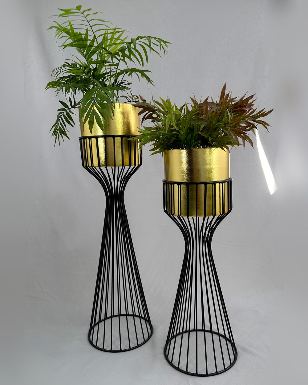 Las bases miden 70 y 50 cm de alto, Las bases son de varilla de acero con acabado en pintura electroestática. Materos en plastico de 20 cm de diametro por 20 cm de alto