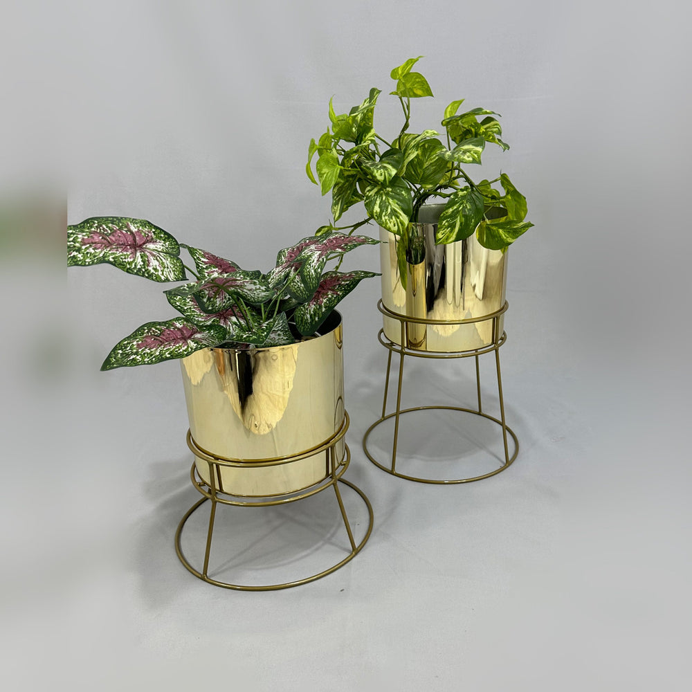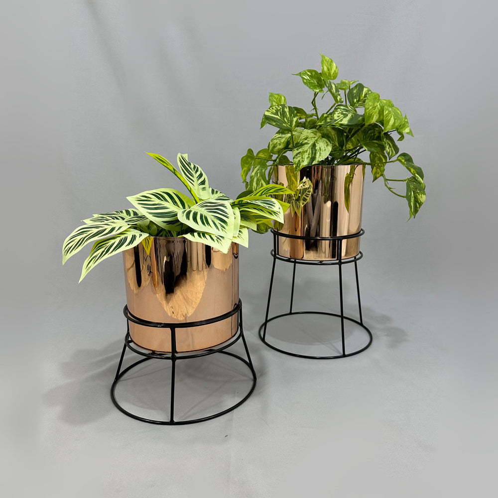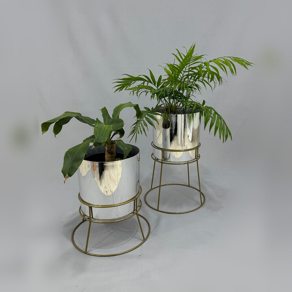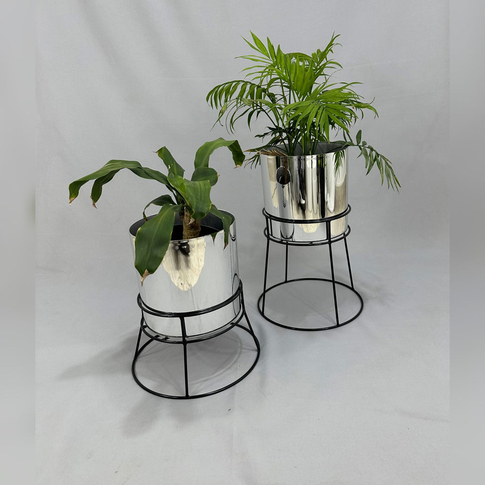 Las bases miden 26.5 y 16.5 cm de alto, Las bases son de varilla de acero con acabado en pintura electroestática. Materos en plastico de 20 cm de diametro por 20 cm de alto Incluye dos bases y dos materos.