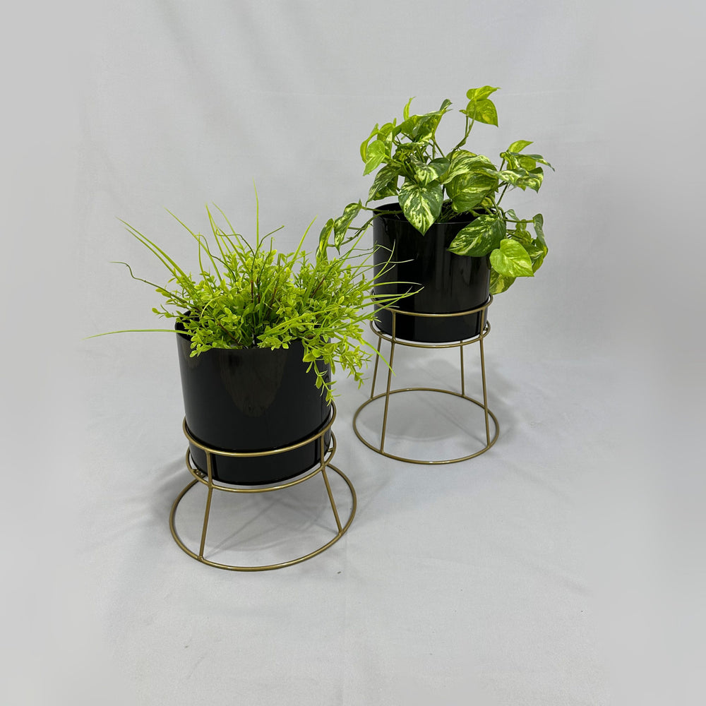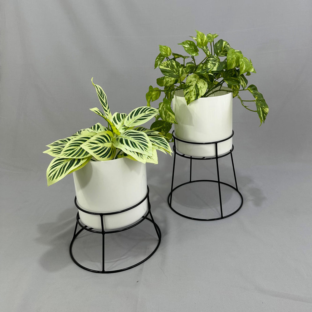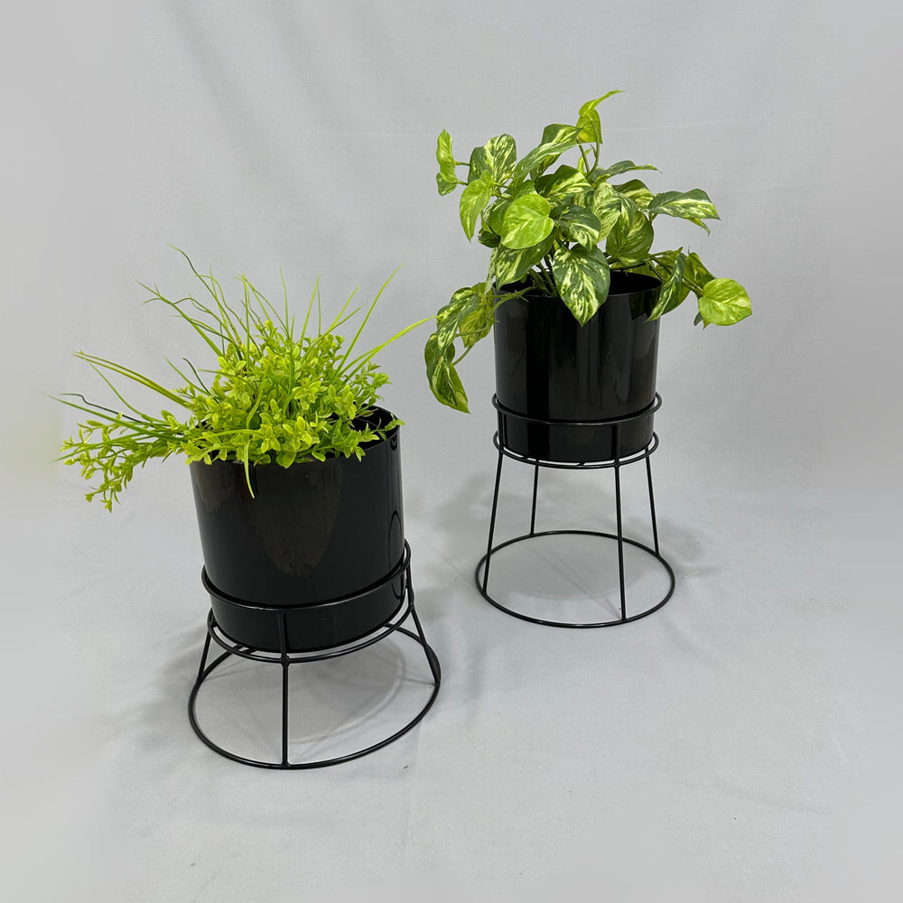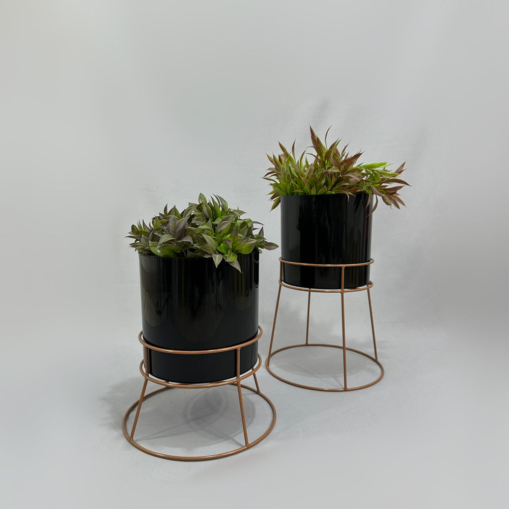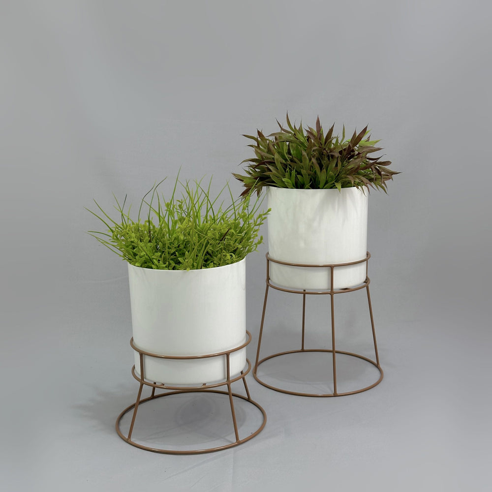 Las bases miden 26.5 y 16.5 cm de alto, Las bases son de varilla de acero con acabado en pintura electroestática. Materos en plastico de 20 cm de diametro por 20 cm de alto Incluye dos bases y dos materos.