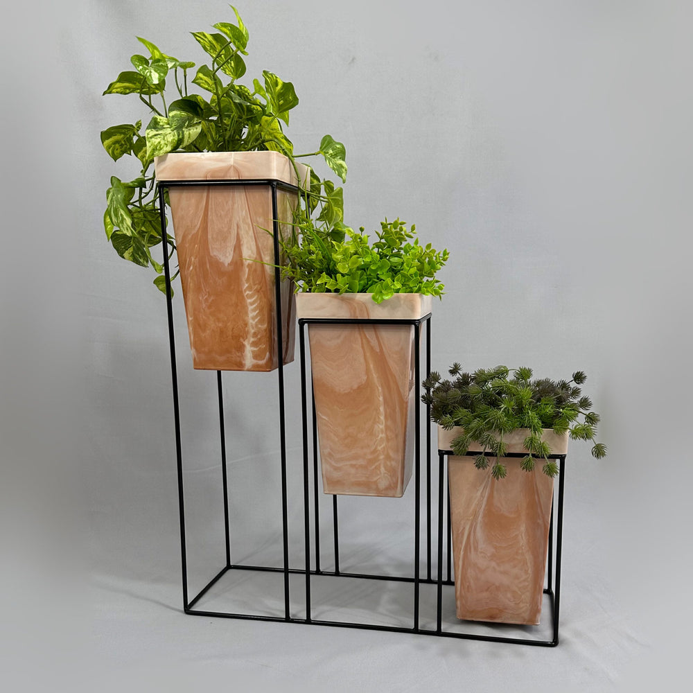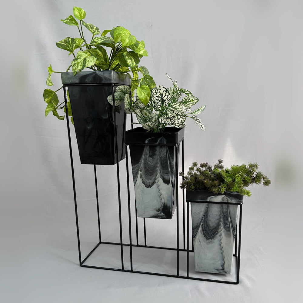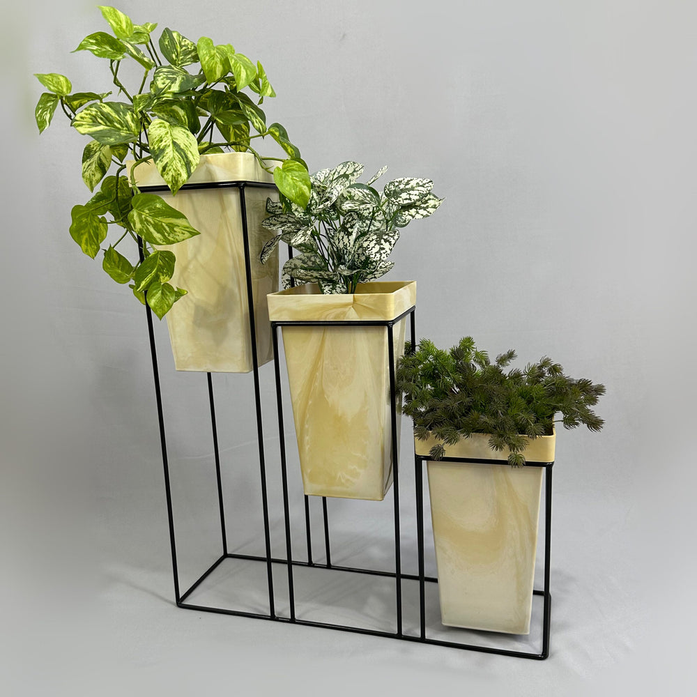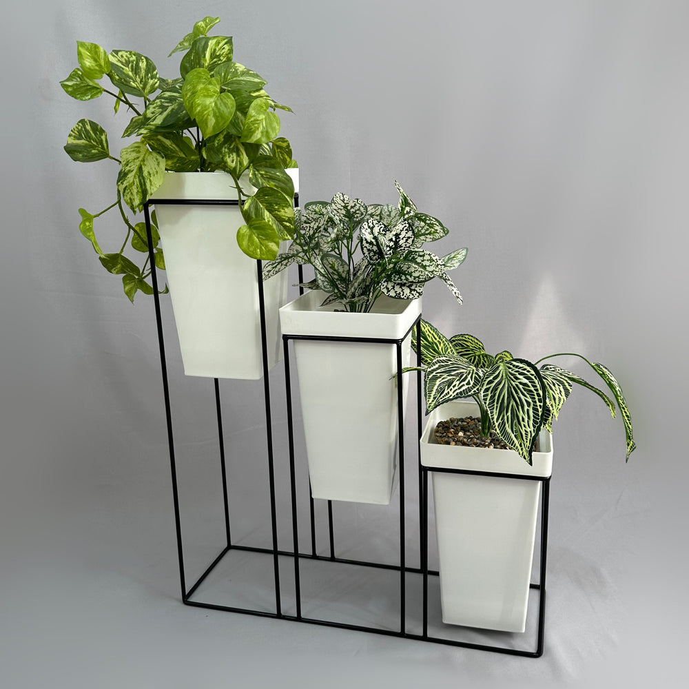 La base mide 70 cm de alto, La base es de varilla de acero con acabado en pintura electroestática. Materos en plastico de 33 cm de alto y tiene un ancho de 19 cm. Incluye Base y Tres materos.   Los materos Bicolor llevan un proceso artesanal donde su acabado y combinacion de colores es totalmente aleatorio*